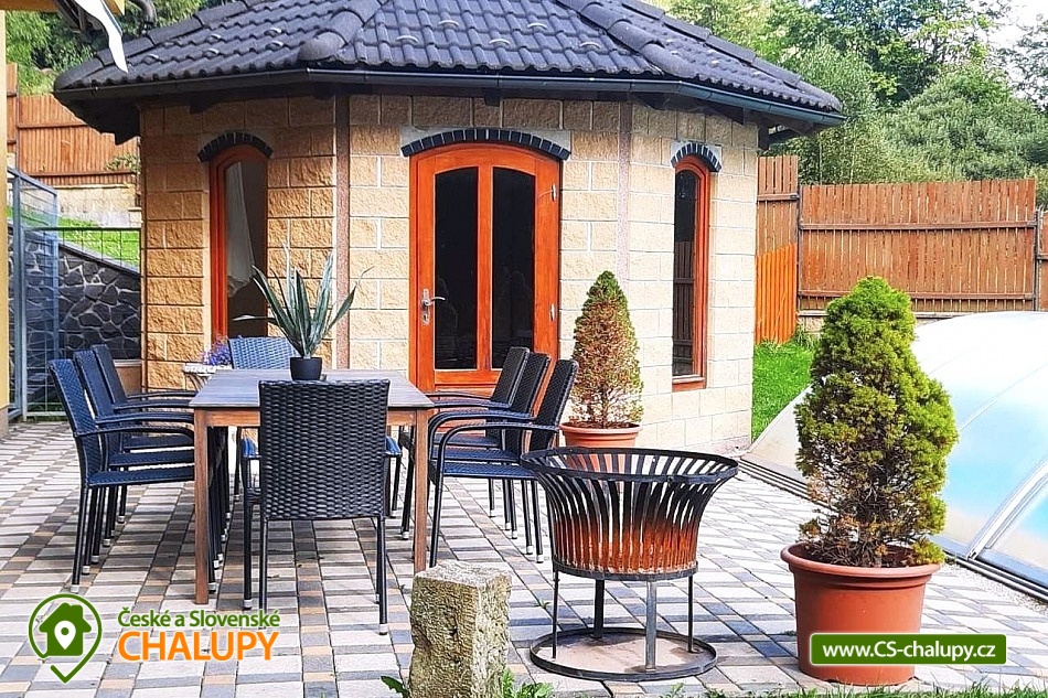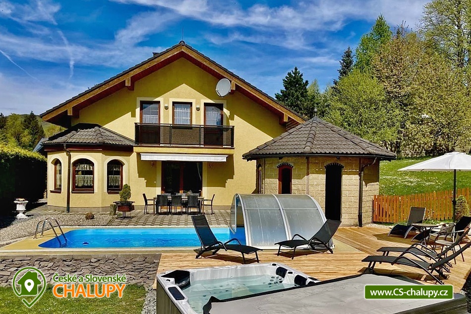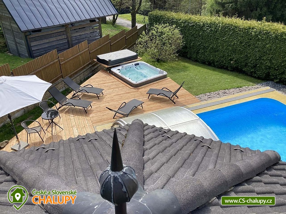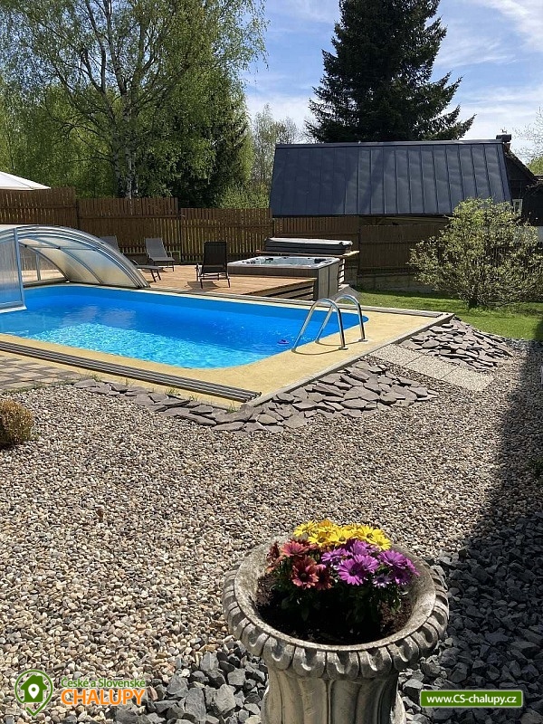 Chata s bazénem Lužické hory - poznejte naší příjemnou chatu s bazénem, saunou a vířivkou v malebné vesničce Svor - Lužické hory. Blízko chaty se nachází vrch Klíč (760 mn.m.), který poskytuje krásný výhled na celé okolí. Výšlap trvá necelých 45 minut. Chcete v poklidu relaxovat? Chata disponuje krytým venkovním bazénem, zahradním altánem s krytým posezením a grilem. Dále je k dispozici na zahradě ohniště, trampolína, pískoviště, skluzavka a mnoho hraček. Pro Vaše čtyřnohé kamarády je připraven i venkovní kotec. Chata poskytuje ubytování pro až 13 osob ve 4 ložnicích. Klidný spánek vám zajistí čtyři oddělené ložnice. V první je manželská postel a kvalitní patrová postel. V patře se nacházejí tři ložnice. V jedné je manželská postel a oddělené lůžko, ve druhé manželská postel a ve třetí manželská postel a kvalitní patrová postel. K dispozici je i dětská postýlka. Dvě ložnice disponují balkonem. Kuchyně je vybavena elektrickou troubou, keramickou varnou deskou, mikrovlnnou troubou, lednicí, myčkou na nádobí, rychlovarnou konvicí, toustovačem a kávovarem. Samozřejmostí je bezplatné WIFI připojení. Pro dokonalé uvolnění, tělesné i duševní, relaxaci a podporu vašeho zdraví můžete využít novou plnospektrální infrasaunu pro 4 osoby a také venkovní vířivku pro až 6 osob! Sociální zařízení: V každém patře je koupelna s toaletou. Koupelna v patře je vybavena sprchovým koutem a vanou, koupelna v přízemí vanou. K dispozici je pračka. Celý dům je vytápěn podlahovým topením, takže zima vám u nás nebude. Parkovat je možno před garáží nebo před chatou. V okolí doporučujeme: přírodní koupaliště ve Sloupu v Čechách, kde je také lanové centrum, skalní hrad Sloup a skalní divadlo. Zajímavá je také návštěva Novotny Glass Muzeum v Novém Boru - můžete zde od průvodce vyslechnout i výklad o výrobě skla. Víte, kde se natáčela Pyšná princezna? Nedaleko nás! Na Panské skále (Varhany) v obci Prácheň, vzdálené jen 10 km od nás! Aquapark a IQ landia Liberec. Pokud byste se chtěli vydat na nějaký větší výlet, můžeme vám doporučit Dinopark Saurier Park, který se nachází v Německu, v obci Kleinwelka u Bautzen. Jedná se o celodenní výlet. V parku najdete více než 200 druhů dinosaurů v životní velikosti. Kleinwelka je vzdálená 55,9 km od Svoru. Těšíme se na Vás u nás.