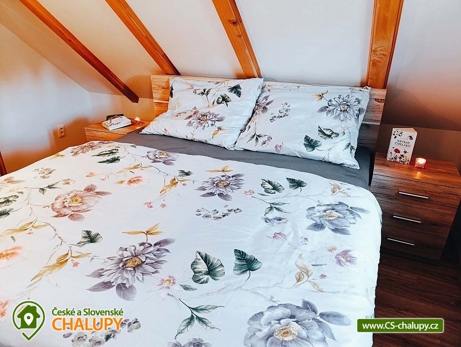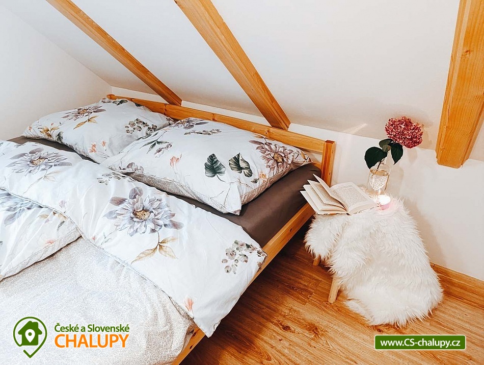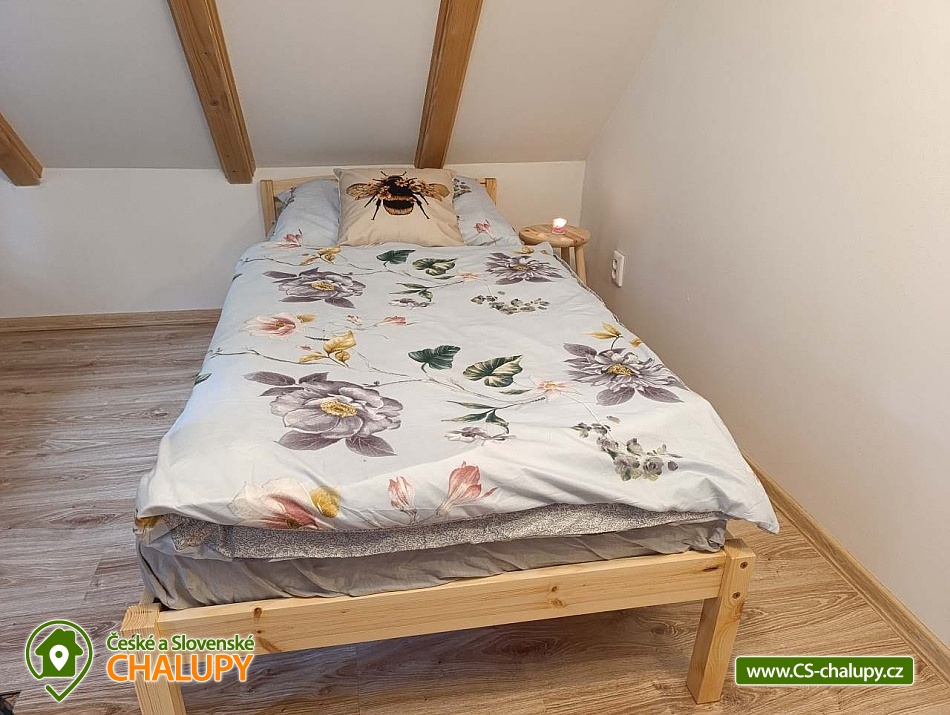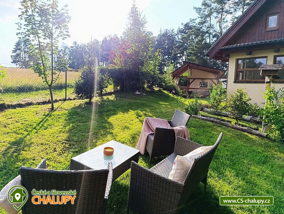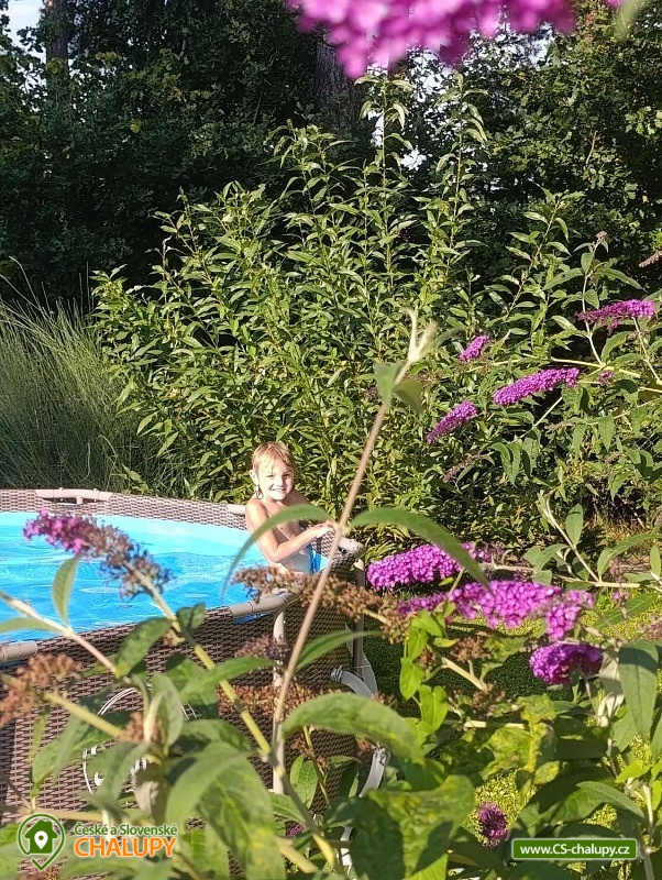 Chata s bazénem Třeboňsko nedaleko Suchdolských pískoven. Chata u rybníka s kapacitou až 8 osob - poslední chata v chatové oblasti, je zde maximální soukromí. Výhled z oken i terasy Vám tak nabízí louku, lesy a rybník. Po otevření vchodových dveří vstoupíte do prosluněné místnosti, ve které je dřevěný jídelní stůl. V této místnosti najdete i knihovnu, vybavenou zajímavými tituly k přečtení. Z jídelny pokračujeme dále do obýváku s krbem. V obýváku je zároveň umístěna klimatizace. Hned při vstupu do obýváku uvidíte konferenční stolek a pohodlný gauč. A pro děti i dospělé je zde televize, s aktivním účtem na Netflixu, Voyo nebo Youtube. Kuchyně je vybavena základním nádobím, mikrovlnkou, troubou se sporákem a základním kořením (sůl, pepř, kmín). K dispozici je varná konvice i kávovar s kapslemi. V přízemí chaty se nachází též toaleta se sprchovým koutem. Možnost doplnit nočníkem pro děti. A stupínkem k umyvadlu. Z obýváku vede dřevěné schodiště do patra. Jsou zde dvě oddělené ložnice a mezi nimi prostor pro děti - dětský koutek. Když vystoupíte po schodech, naleznete zde vestavěnou šatní skříň. V první ložnici je manželská postel 180 x 200 cm a nižší postel vhodná spíše pro děti 120 x 200 cm. V druhé ložnici je též manželská postel 180x 200 cm a dvě oddělené postele 90 x 180 cm. Postele jsou vybaveny pěnovými matracemi a kompletně připraveny pro Váš odpočinek. V pokojích jsou skříňky na oblečení a osobní věci. Při příjezdu zaparkujete na oploceném pozemku zahrady, kde na první pohled uvidíte trampolínu pro děti, bazén, dřevník se dřevem a uzamykatelnou dílnu, kam si můžete zamknout kola a jiné. Na dílnu navazuje pergola s posezením a grilem, která Vám poskytne maximální soukromí a klid. Na zahradě je pískoviště pro děti a malé jezírko s rybkami a žabkami. Zahrada je osázena motýlími keři, levandulemi a bylinami. Je zde jedlá část zahrady. Lokalita umožnuje nejrůznější možnosti zábavy. Od cykloturistiky, po pěší vycházky s dětmi, poznávání, památky a nebo koupání. V nejbližším okolí je les, který můžete projít po pěšinách, či projet růže značené stezky na kole. Těšíme se na Vás u nás.