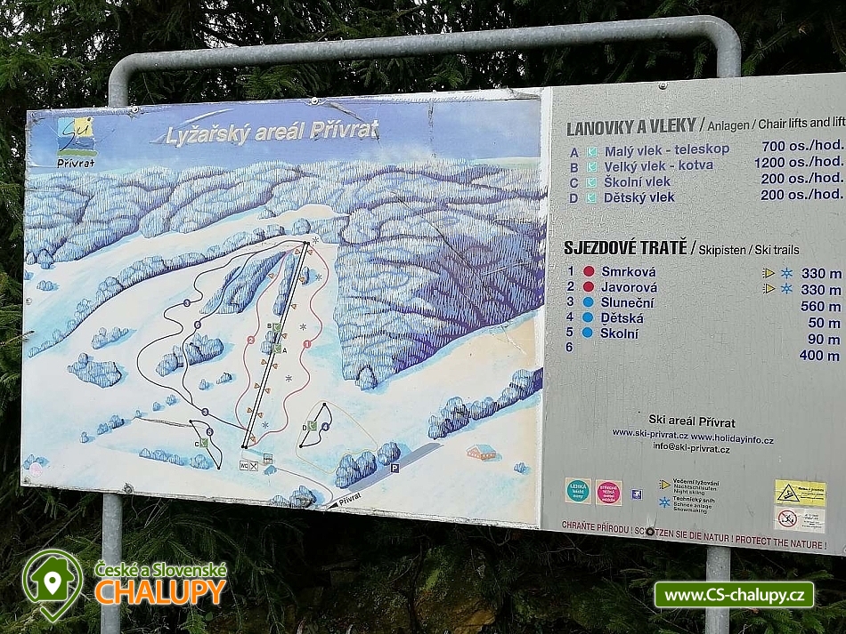 Chata s letním bazénem se nachází v oblasti "Údolí oddechu" nedaleko malebné vesničky Přívrat v Orlickém podhůří, 350m od celoročně provozovaného Areálu Přívrat, 7 km od České Třebové a 12 km od historického centra města Litomyšl. Chata k pronajmutí poskytuje ubytování pro až 5 osob ve 2 ložnicích. Popis: Ložnice č.1 - manželská postel, Ložnice č.2 - palanda + přistýlka, obývací pokoj - rozkládací pohovka. Na chatě máte možnost vlastního stravování v malé kuchyňce (chladnička s mrazákem 174 litrů, indukční plotýnkový dvou vařič, varná konvice, mikrovlnná trouba, remoska, nádobí). Sociální zařízení: V koupelně s podlahovým topením je sprchový kout, WC, umyvadlo, tepelný žebřík, fén. V ceně pobytu je sada ručníků pro všechny účastníky. Vytápění chaty je ústřední (radiátory v každé místnosti), dálkově ovládaným kotlem na pelety, které máte v rámci pobytu zdarma, takže zimy se u nás opravdu bát nemusíte. Další vybavení: dětská jídelní stolička, dětská postýlka s matrací, dětská stolička, vanička, nočník, stolní a deskové hry, malá knihovnička. Ložní povlečení v ceně pobytu pro všechny ubytované je samozřejmostí. K dispozici je kolárna/lyžárna, bazén s lehátky a slunečníkem, trampolína, pingpongový stůl, badminton, skluzavka, dětské pískoviště, gril, ohniště. Nabízíme též k zapůjčení výčepní zařízení s chlazením (za poplatek). Parkování pro 2 auta přímo na pozemku u chaty za zamykatelnou bránou. Cesta k chatě se v zimě protahuje. Okolí chaty přímo vybízí v létě k houbaření, rybaření, procházkám v přírodě, cykloturistice, koupání ať již "doma" v bazénu (event. potůčku, procházejícím celým pozemkem) nebo v okolních rybnících. V létě Ski Areál Přívrat nabízí Pinguin park, Bungee trampolínu, Sjezdové káry, ... a v zimě samozřejmě sjezdové lyžování, sáňkování a na své si přijdou i milovníci běžeckého lyžování.