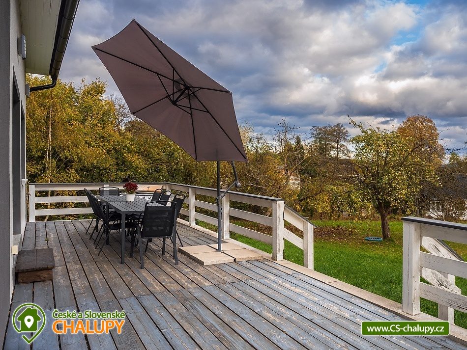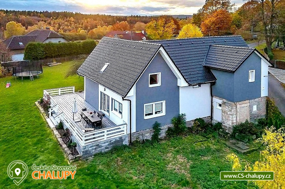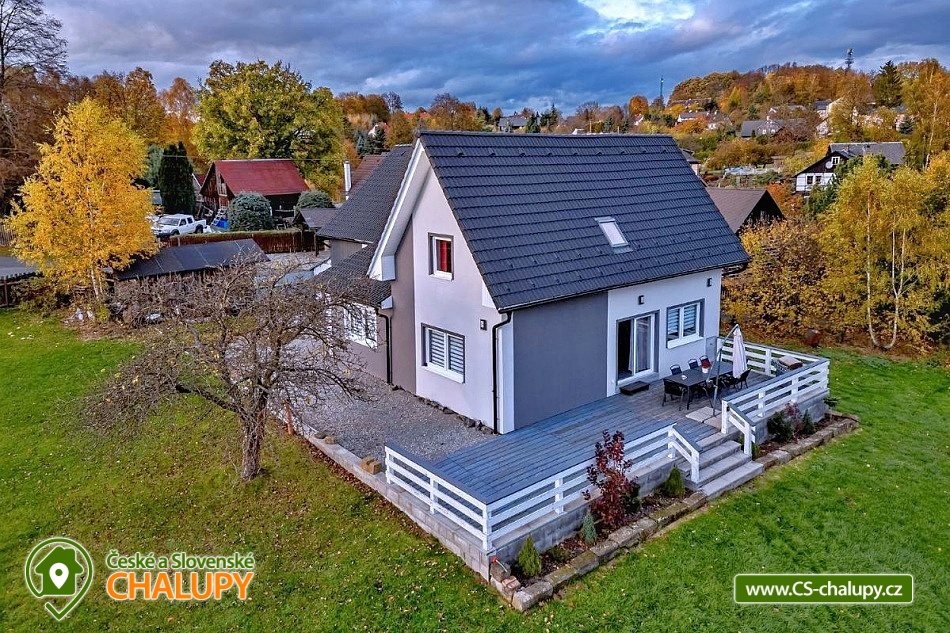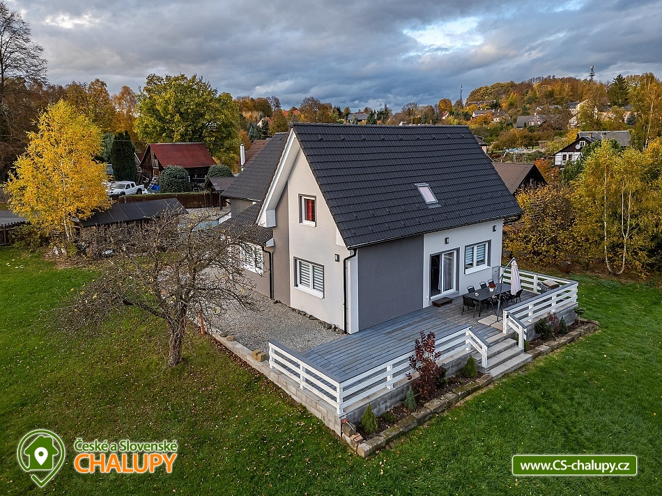 Rekreační chata s koupacím sudem - České Švýcarsko se nachází v klidné části obce Janov u Hřenska. Chata se 6 pokoji (15 lůžek + 2 rozkládací gauče = celkem až 17 osob) je moderně zařízená a prostorná, nedaleko je krásný rybníček s posezením. Nabízíme pronájem celého objektu - soukromí si užijete na velké zahradě 4000 m2. Ta je kompletně oplocená, navíc zahrada a prostorná terasa s grilem jsou situovány na jižní stranu. POPIS: Vařit si můžete sami v plně vybavené kuchyni, grilovat na terase nebo navštívit velké množství restaurací v okolí. K dispozici jsou vám dvě lednice s mrazákem, kávovar, TV s velkou nabídkou programů, včetně velké nabídky placených sportovních programů. V přízemí dvě koupelny se sprchovým koutem a wc, v 1. patře wc s umyvadlem. Pokoj č.1 - 2x palanda (4 osoby), Pokoj č.2 - 3x jednolůžková postel, Pokoj č.3 - 1x manželská postel + 1x přistýlka, Pokoj č.4 - 1x manželská postel (možné rozpojit na 2x jednolůžko), Pokoj č.5 - 1x manželská postel + 1x přistýlka a Pokoj č.6 - 1x manželská postel (možné rozpojit na 2x jednolůžko). V obývacím pokoji je možnost rozložit dva kvalitní gauče. Pokoje č.1 až 5 jsou v prvním patře, pokoj č.6 je v přízemí s bezbariérovým přístupem (dveře 80cm). Plně vybavená kuchyň, včetně koření. Kávovar na kapsle Tassimo. K dispozici jsou dvě ledničky s mrazáky. Na terase plynový gril. Parkování: 3x přímo v areálu a 3x u objektu před plotem. Samozřejmě u nás najdete i vyžití pro Vaše děti v podobě velké trampolíny, houpačky, dětského domečku, klouzačky a dalších. OKOLÍ: Domeček se nachází přímo v centru těch nejkrásnějších turistických památek, jako je například Pravčická brána, Jetřichovické vyhlídky, Janovská rozhledna, Soutěsky Hřensko, Dolský mlýn, a další. Jen 3 km vzdálená hranice s Německem nabízí spoustu výletů. V okolí je dostatek aktivit i v nepříznivém počasí. Domeček je nedaleko golfového hřiště, s možností vyjížděk na kole a koloběžek, bohaté pěší turistiky, návštěvy děčínské ZOO, zámku a aquaparku či vyjížděk na lodí po Labi, jízdy na kánoích či raftech. Po dohodě možná vyjížďka na koních. Slibujeme, že za týden nestačíte vše v našem okolí vyzkoušet. Těšíme se na Vás u nás.