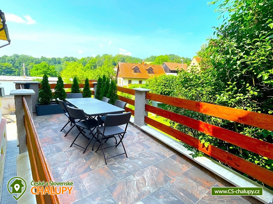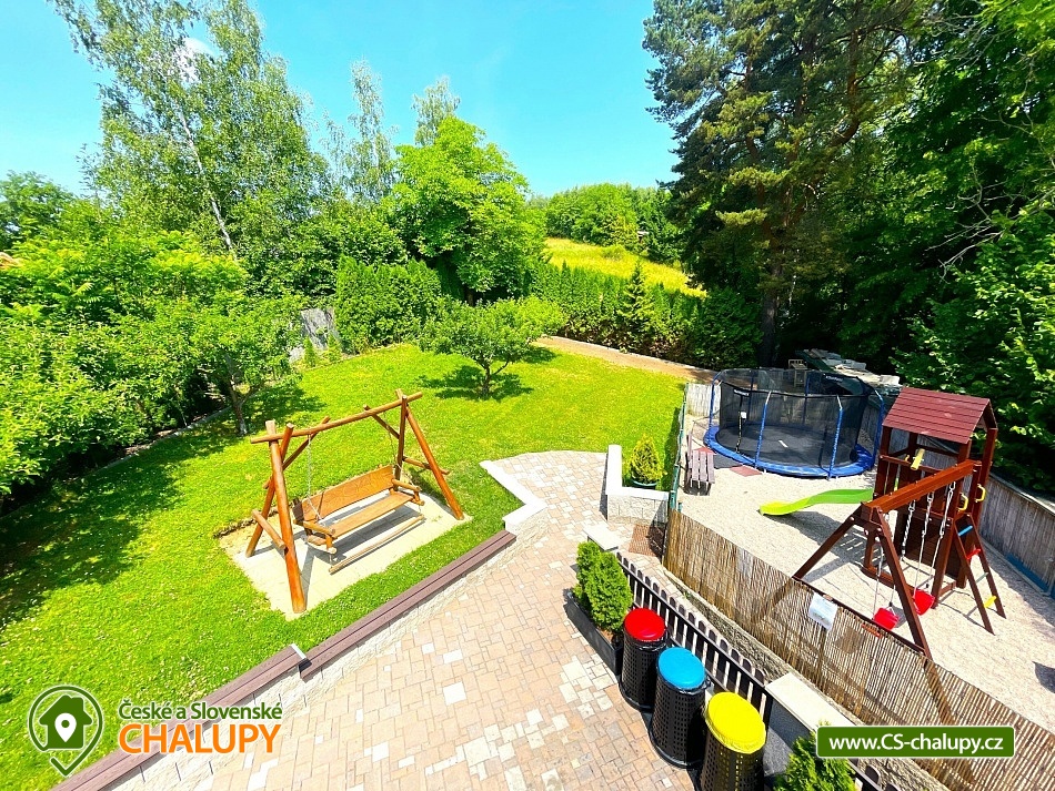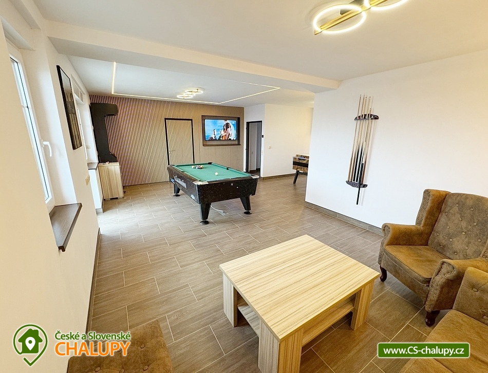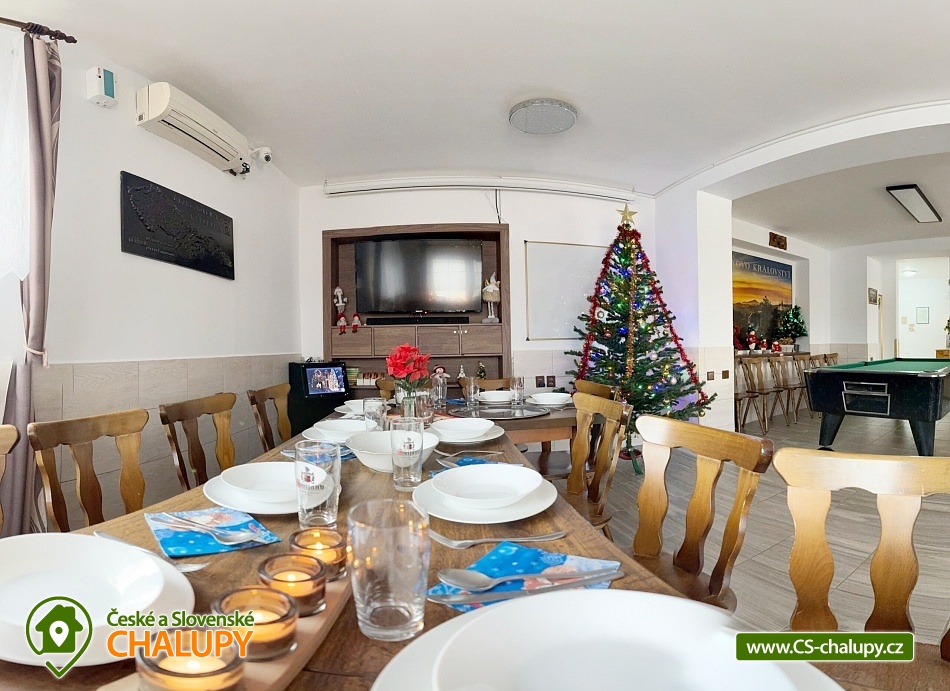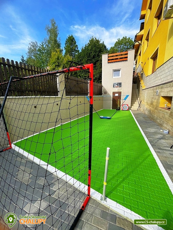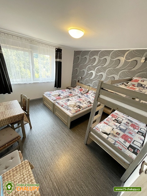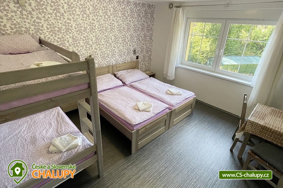 Chata s vnitřním bazénem a finskou saunou se nachází v srdci Českého ráje nedaleko zámku ve skalách Hrubá Skála. Svojí lokalitou je skvělým výchozím bodem pro výlety k oblíbeným turistickým cílům, jako jsou hrad Trosky, Hruboskalsko, Malá Skála nebo pohádkové město Jičín. Vhodné pro rodiny s dětmi, partu přátel, cyklisty nebo firemní teambuildingy. Těšit se můžete na venkovní i vnitřní bazén, saunu, terasu s posezením či hernu vybavenou kulečníkem, fotbálkem nebo šipkami. Objekt nabízí ubytování pro až 36 osob,v 10 samostatně pronajímatelných apartmánech. Součástí každého apartmánu je plně vybavená kuchyň (sklokeramická deska, rychlovarná konvice, lednička, mikrovlnná trouba a nádobí), jídelní kout a sociální zařízení s vanou/sprchovým koutem, umyvadlem a toaletou. Apartmány jsou 2-lůžkové nebo 4-lůžkové (u ložnic, kde je 2x samostatné jednolůžko, lze spojit v manželskou postel) a nachází se v přízemí a v 1. patře. Možnost zapůjčit dětskou postýlku. APARTMÁN č. 1 (1. patro, max. 2 osoby): 1x dvoulůžková ložnice (2x samostatné jednolůžko), TV, kuchyň, koupelna se sprchovým koutem a samostatnou toaletou. APARTMÁN č. 2 (1. patro, max. 4 osoby): 1x čtyřlůžková ložnice (2x samostatné jednolůžko, 1x patrová postel), TV, kuchyň, koupelna se sprchovým koutem a samostatnou toaletou, výhled na město Rovensko pod Troskami. APARTMÁN č. 3 s balkonem (1. patro, max. 5 osob): 1x čtyřlůžková ložnice (2x samostatné jednolůžko, 1x patrová postel + možnost přistýlky pro jednu osobu - rozkládací postel), TV, kuchyň, koupelna se sprchovým koutem a toaletou, výhled na město Rovensko pod Troskami. APARTMÁN č. 4 s balkonem (1. patro, max. 3 osoby): 1x dvoulůžková ložnice (2x samostatné jednolůžko + možnost přistýlky pro jednu osobu - rozkládací postel), TV, kuchyň, koupelna s vanou a samostatnou toaletou, výhled na město Rovensko pod Troskami a na hrad Trosky. APARTMÁN č. 5 s balkonem (1. patro, max. 3 osoby): 1x dvoulůžková ložnice (2x samostatné jednolůžko + možnost přistýlky pro jednu osobu - rozkládací postel), TV, kuchyň, koupelna se sprchovým koutem a toaletou, výhled na hrad Trosky. APARTMÁN č. 6 s balkonem (1. patro, max. 5 osob): 1x čtyřlůžková ložnice (2x samostatné jednolůžko, 1x patrová postel + možnost přistýlky pro jednu osobu - rozkládací postel), TV, kuchyň, koupelna se sprchovým koutem a samostatnou toaletou, výhled na hrad Trosky a do zahrady. APARTMÁN č. 7 (1. patro, max. 4 osoby): 1x čtyřlůžková ložnice (2x samostatné jednolůžko, 1x patrová postel), TV, kuchyň, koupelna se sprchovým koutem a samostatnou toaletou, výhled do zahrady. APARTMÁN č. 8 (1. patro, max. 2 osoby): 1x dvoulůžková ložnice (2x samostatné jednolůžko), TV, kuchyň, koupelna se sprchovým koutem a samostatnou toaletou, výhled do zahrady. APARTMÁN č. 9 (1. patro, max. 4 osoby): 1x čtyřlůžková ložnice (2x samostatné jednolůžko, 1x patrová postel), TV, kuchyň, koupelna se sprchovým koutem a samostatnou toaletou, výhled do zahrady. APARTMÁN č. 10 DELUX (přízemí, max. 4 osoby): 1x čtyřlůžková ložnice (1x velká manželská postel, 1x patrová postel), TV, kuchyň, koupelna se sprchovým koutem a toaletou, výhled na Rovensko pod Troskami a venkovní bazén. V ubytování se nachází ještě další 3 toalety (2x ve společenské místnosti, 1x u vnitřního bazénu). K dispozici je společenská místnost s posezením až pro 36 osob, vybavená TV, projektorem, plátnem a popisovací nástěnkou. Zde můžete uspořádat rodinnou oslavu, setkání přátel či firemní teambuilding. Možnost zajištění snídaní, cateringu, ochutnávky vín, domácích sýrů a uzenin či možnost pozvat grilmastera. Nechybí ani karaoke, beerpong, společná kuchyň (doplněná o velkou lednici, horkovzdušnou troubu, myčku, kávovar Dallmayer a přenosnou pípu). K relaxaci poslouží vnitřní bazén (6x3m, hloubka 150 cm) a finská sauna (předehřátá na 100 °C) s relaxační zónou. Dále je zde herna vybavena kulečníkem, stolním fotbálkem, automatem na šipky, velkoplošnou TV, stylovým posezením a dvěma arkádovými automaty. Vytápění objektu je řešeno podlahovým topením, v koupelnách jsou navíc elektrické topné žebříky. Chatu obklopuje oplocená zahrada se zatravněnou plochou. K dispozici je zastřešená terasa s lavicemi, stoly a velkým grilem. Na této terase naleznete také ohniště s posezením. V celém objektu i na terase možnost zdarma připojení na Wi-Fi internet. V těsné blízkosti ubytování se nachází venkovní bazén (6x3m, hloubka 150 cm), zahradní houpačka a posezení s krbem a udírnou. Ti nejmenší ocení oplocené dětské hřiště se zapuštěnou trampolínou, skluzavkou a houpačkami. Parkování přímo u objektu (max. 10 aut) na oploceném, kamerou střeženém pozemku. Možné využít i druhé, 50 m vzdálené, parkoviště (max. 5 aut). V okolí objektu možnost turistiky, cykloturistiky, koupání, raftingu, houbaření, rybaření i zimních sportů. Ve městě lze využít nedaleké fotbalové hřiště, hřiště pro děti s občerstvením, venkovní kluziště nebo tenisové kurty. Mezi možnosti koupání patří např.: venkovní bazén Železný Brod, aquapark Liberec, aquapark Turnov, Jinolické rybníky, Sedmihorky s písečnou pláží, rybník Vidlák, Malá Skála - Žlutá plovárna nebo koupaliště Bělá u Turnova. Blízká lyžařská střediska jsou: Kozákov, Turnov - Struhy, Nad Nádražím - Semily nebo Koberovy - Hamštejn. K výletům v okolí láká: Hrubá Skála, Malá skála, hrad Vranov - Pantheon, Kopicův statek - pískovcové sochy vytesané do skal, lázně Sedmihorky, rozhledna Kozákov, rozhledna Hamštejn, obrácené zvony na zvonici v Rovensku pod Troskami, Prachovské skály, hrad K