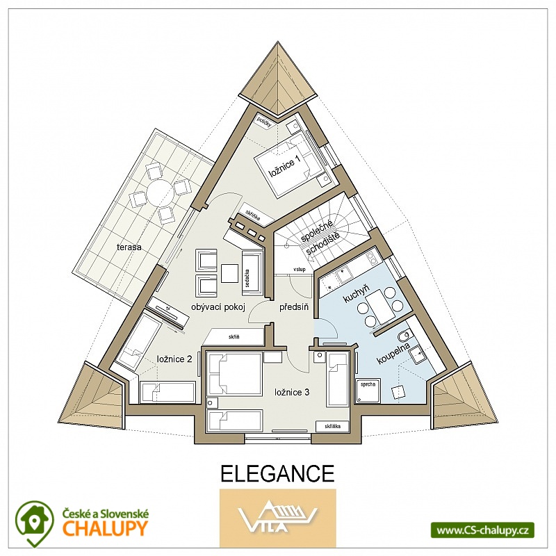 - 6 ložnic: 1x 4, 1x 3+1, 1x 2+1, 3x 2