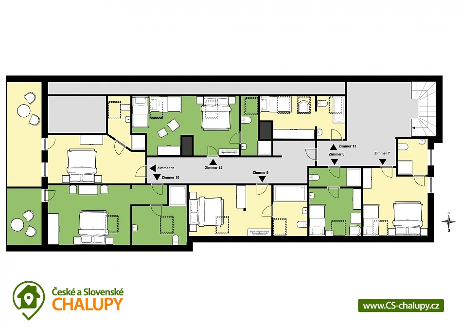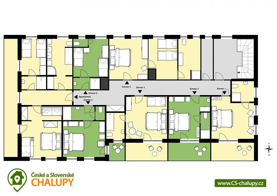 - 15 ložnic: 3x 4, 2x 3, 8x 2, 2x 1