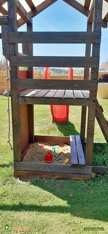 Chata Vranovská přehrada s koupacím sudem se nachází v obci Dešov na rozhraní kraje Vysočina a Jihomoravského kraje nedaleko Jemnice. Těšit se můžete na krásné výhledy do okolní krásné přírody nebo na odpočinek na terase nebo v koupacím sudu. Chata nabízí ubytování pro až 6 osob ve dvou ložnicích. Obě ložnice jsou samostatné a spojené zastřešenou terasou, kterou je možné při nepříznivém počasí kompletně uzavřít roletami. V jedné ložnici je k dispozici manželská postel, na kterou navazuje dvoulůžková prostorná patrová postel o rozměrech 90x360 cm. Ve druhé ložnici je umístěna rozkládací postel o rozměrech 160 x 200 cm. Součástí druhé ložnice je jídelní stůl, plně vybavená kuchyň (lednice, mrazák, myčka, varná deska, trouba, mikrovlnná trouba, rychlovarná konvice) a Smart TV. Pro děti je k zapůjčení dětská postýlka, nočník, wc sedátko, hračky a knihy. Sociální zařízení zahrnuje sprchový kout, umyvadlo a WC. Vytápění je řešeno pomocí klimatizačních jednotek. V celém objektu je k dispozici WIFI připojení na internet. Posedět lze buď v zastřešené terase nebo na venkovní terase se závěsnou houpačkou a lehátky. K dispozici je gril a ohniště. Za příplatek lze zajistit vytopení koupacího sudu (na teplotu 38 - 40°C) s možností vířivky, která je příjemná i za chladného počasí. Děti se mohou těšit na prolézačky, skluzavku a pískoviště. Parkovat lze přímo u objektu. V okolí domku možnost turistiky, cykloturistiky, koupání, rybaření a houbaření. V blízkosti jsou tenisové kurty a cca 400 m od chaty je nové dětské hřiště. Mezi možnosti koupání patří např.: koupaliště Nimpšov, Bítovská zátoka, rybník Hrachovec, koupaliště Moravské Budějovice, Biotop Jemnice, Vranovská přehrada, přehrada Plichťák, rybník Vidlák, koupaliště Jaroměřice nad Rokytnou, rybník Dolní Modletický, atd. K výletům v okolí láká Státní zámek Vranov nad Dyjí, Hrad Bítov, Rozhledna Rumburak a Červená kaplička, Zřícenina hradu Cornštejn, Zámek Jaroměřice nad Rokytnou, Židovská čtvrť a hřbitov v Třebíči - UNESCO, Bazilika svatého Prokopa, Národní park Podyjí, Telč a další. Těšíme se na Vás u nás.