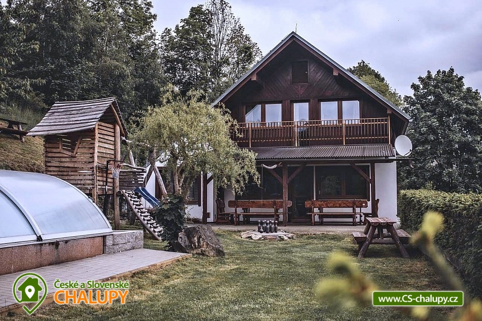 Wellness chata (prosklená SAUNA s výhledem do údolí + KOUPACÍ SUD S VÍŘIVKOU) a bazénem na výjimečně krásném a klidném místě v obci Štědrákova Lhota. Ale zároveň ideální jako základna pro lyžařské a v létě bike (trail) nadšence! Příroda, výhledy a absolutní klídek v podhůří Jeseníků. Prostorné posezení s kvalitními lavicemi a zahradním krbem, zastřešený bazén o rozměrech 6 x 3 metry s hloubkou vody až 150 cm. Luxusní zahradní domek pro děti s houpačkou, ruské kuželky pro volné chvíle a velkou trampolínu o průměru 360 cm s ochrannou sítí! V obytné místnosti - PROFI stolní fotbálek. To vše naleznete na udržované zahradě přímo u domu. 2 x čtyřlůžková ložnice, 2 x třílůžková ložnice, 1 lůžko ve zvýšeném patru + 2 přistýlky na gauči v obývacím pokoji. LCD TV ve společenské místnosti. Vybavená kuchyň, která je vybavena dostatečným množstvím nádobí, sklokeramickou varnou deskou, pečící horkovzdušnou troubou, mikrovlnkou, varnou konvicí, velkou lednicí s prostorným mrazákem, myčkou nádobí. Druhou kuchyň v jednom z čtyřlůžkových pokojů, který je upraven jako bezbariérový. Venkovní kryté a zastřešené posezení přístupné ze společenské místnosti, ohniště, krb s udírnou, úschovnu kol a lyží. V naší nabídce máme celkem čtyři chaty. Chata je cca. 300m od proslulého lyžařského střediska Panorama. Lokace je výjimečná svým klidem a malebností ale zároveň slouží jako ideální základna pro lyžaře a bikery! V okruhu 30 km od naší chaty se nachází všechny nově vybudované moderní ski & bike Resorty v Jeseníkách!! Speciálně hustota nově vybudovaných bike parků dělá z Jeseníků centrum této oblíbené zábavy. Každý den můžete lyžovat nebo bikovat v jiném resortu a za týden to skoro nestihnete objet vše!! 30 km Resort Dolní Morava ski / bike. 20 km Horský resort Buková hora ski / bike. 25 km Horský areál Kraličák ski / bike. 30 km Areal Kouty nad Desnou ski / bike / dlouhé stráně.