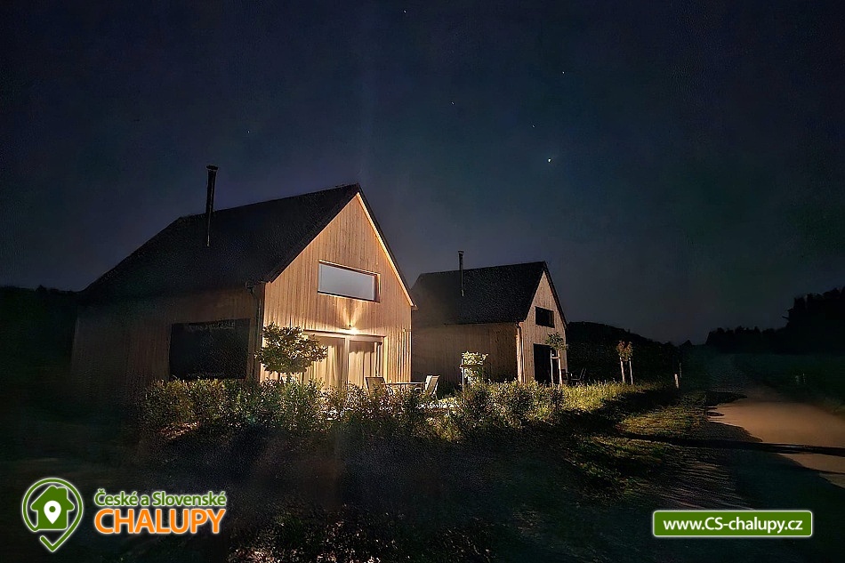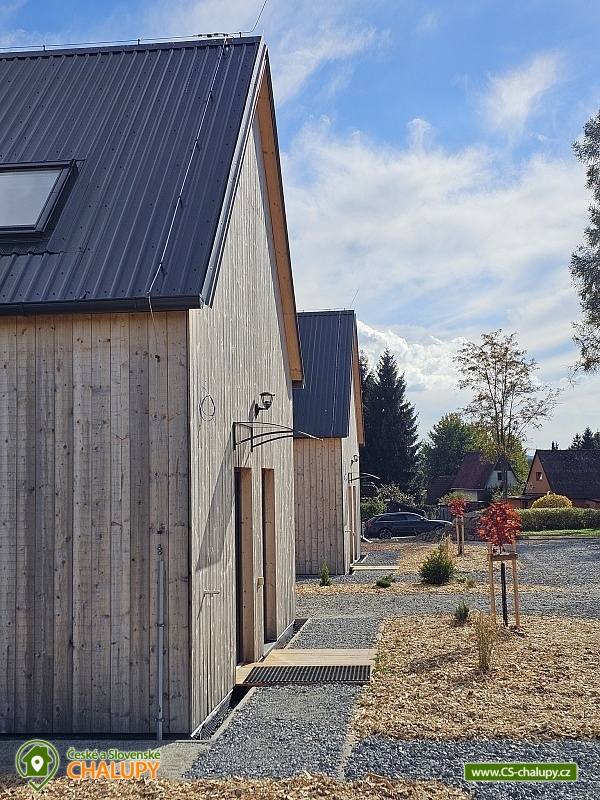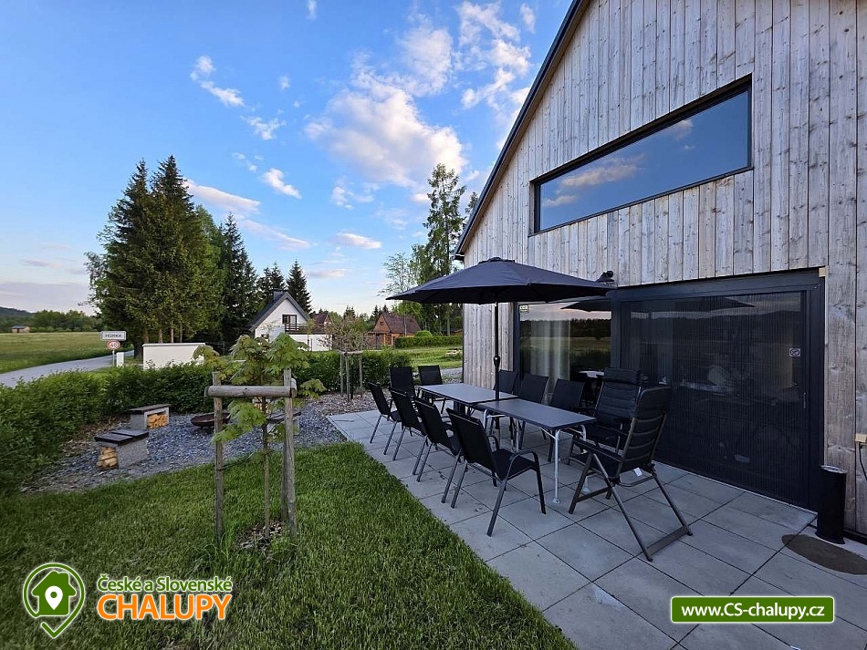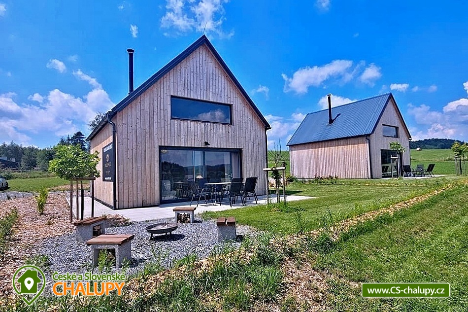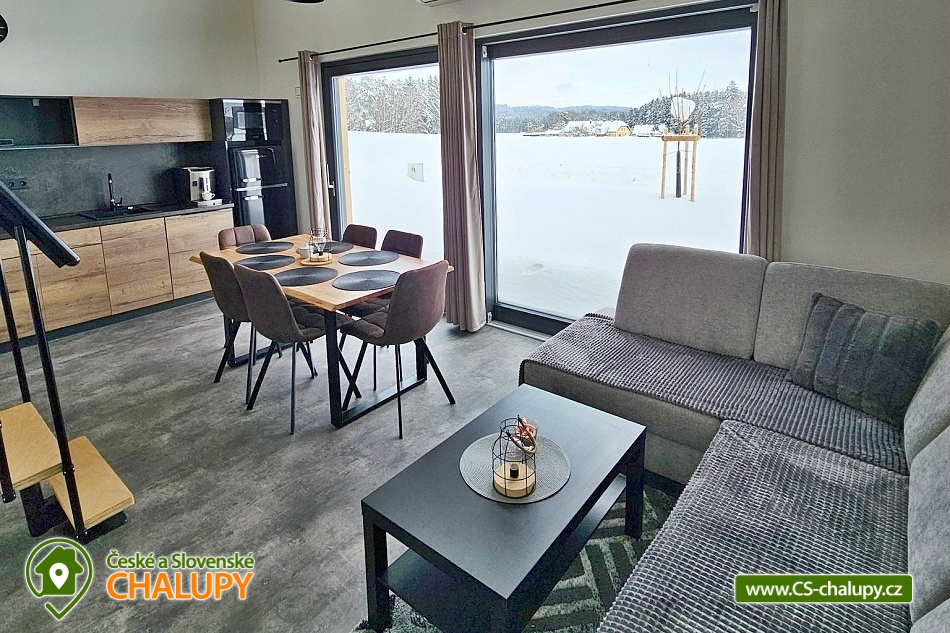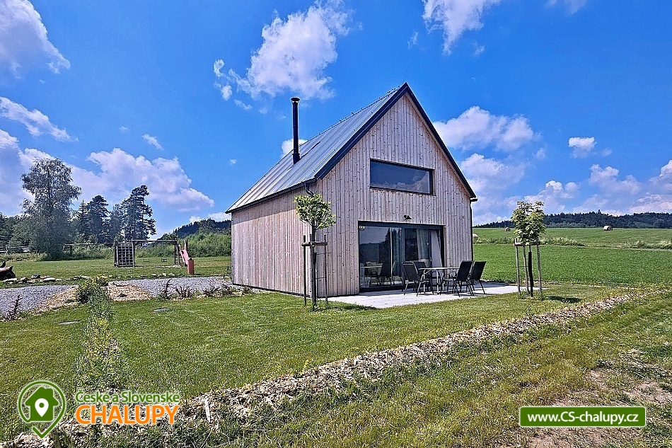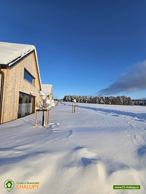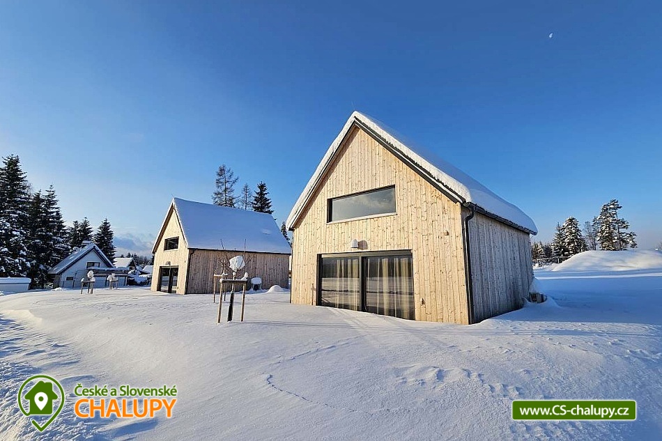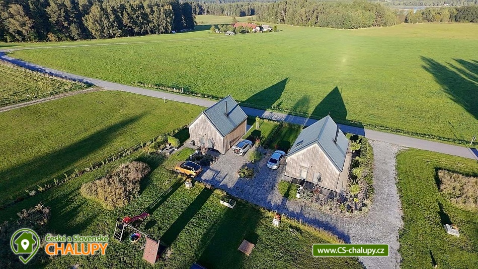 Chaty Černá v Pošumaví (2x chata pro 5 osob) se nachází v jižních Čechách u osady Žlábek poblíž obce Černá v Pošumaví a města Horní Planá v těsné blízkosti vodní přehrady Lipno. Jedná se o dvě nové, moderně vybavené a útulné chaty s krásným výhledem do přírody. V nedalekém okolí lze navštívit Český Krumlov, turisticky oblíbené město pro svou proslulou architekturu s malebnými uličkami a romantickou atmosférou a svým hradem a zámkem. Chaty nabízí ubytování pro až 10 osob ve dvou samostatně pronajímaných pětilůžkových chatách. Obě chaty jsou zařízené dispozičně stejně. V každé chatě jsou k dispozici dvě dvoulůžkové ložnice s manželskou postelí. Jedna ložnice je v samostatné místnosti, druhá je otevřená, umístěná na vyvýšeném patře spojeném schody s obývacím pokojem. Dále je k dispozici jedna přistýlka řešená rozkládacím gaučem v obývacím pokoji. Přistýlka může sloužit pro jednoho dospělého nebo dvě děti. Dětská postýlka je k zapůjčení. V obývacím pokoji lze posedět u krbových kamen nebo prostorného jídelního stolu se šesti židlemi. Velkými prosklenými okny si lze užívat výhledy do okolní přírody. Součástí pokoje je také plně vybavená kuchyň (lednice s mrazákem, myčka, kávovar, sklokeramická deska, horkovzdušná trouba, mikrovlnka, kávovar, toustovač, topinkovač a rychlovarná konvice). K dispozici je TV a WIFI připojení na internet. Sociální zařízení zahrnuje jednu koupelnu s vanou, umyvadlem a WC. Samozřejmostí jsou dávkovače s mýdlem u umyvadla a s tělovým šamponem u vany. Pod umyvadlem je umístěn vysoušeč vlasů. Vytápění je řešeno krbovými kamny, klimatizací a podlahovým topením. Venku lze posedět na terase. K dispozici je ohniště. Parkovat lze přímo u objektu. V okolí chat možnost turistiky, cykloturistiky, koupání, houbaření a rybaření. V blízkosti jsou také tenisové kurty, jízdárna a golfové hřiště. Lipenská přehrada vybízí k vodním sportům - jachting, windsurfing a kiteboarding. Nedaleko chatek se nachází ovčí a kozí farma, která zaujme malé i velké návštěvníky. V blízkém dosahu je také cyklostezka a restaurace. Mezi možnosti koupání patří např.: vodní nádrž Lipno, rybník Olšina, aquapark Frymburk, koupaliště Větřní , aquapark Lipno, bazén Český Krumlov, Chlumský rybník, Hornobranský rybník, atd. K výletům láká Lipenská oblast - Stezka korunami stromů s výhledem na Lipno, Mini zoo Lipno, Hopsárium, dále Rozhledna Dobrá Voda - Horní Planá, Rozhledna Libín a lanový park Libín, Medvědí stezka Nová Pec, Plešné jezero a Boubínský prales nebo nebo obec Frymburk s unikátní expozicí Svět pod hladinou s více jak 30 akvárii. Těšíme se na Vás u nás.