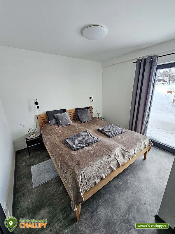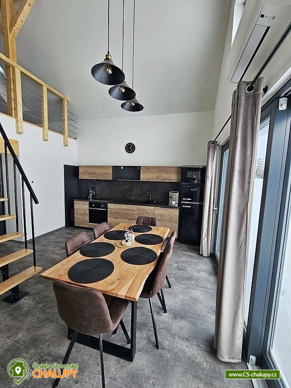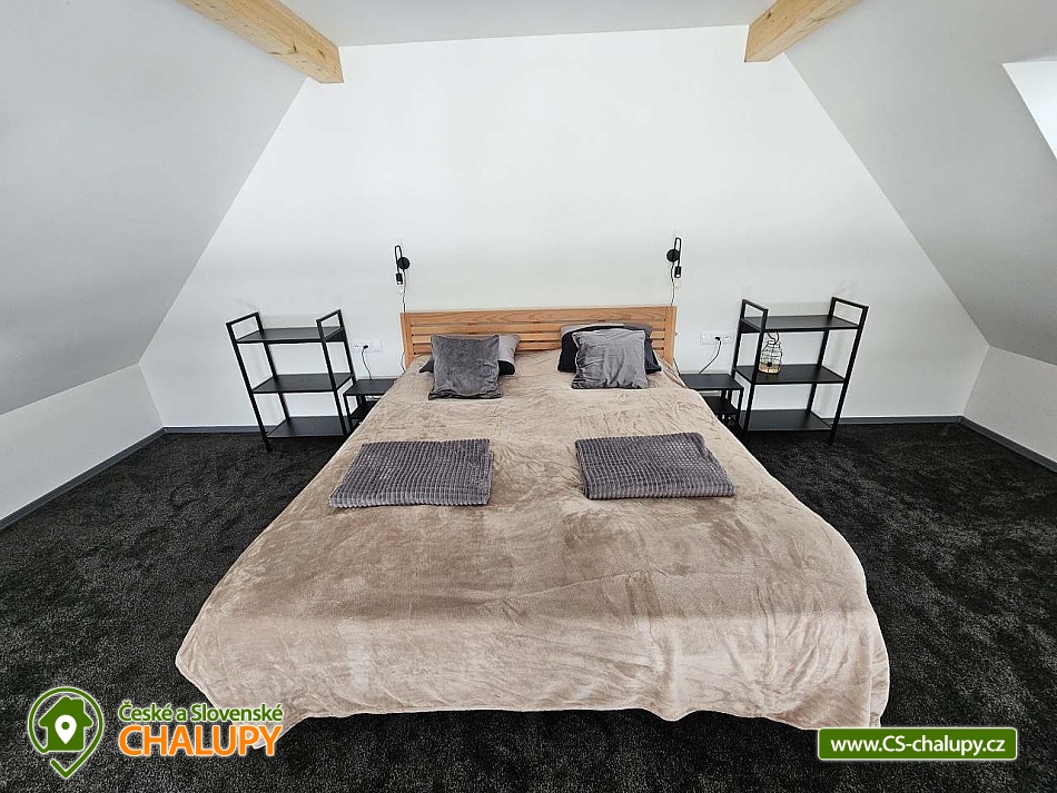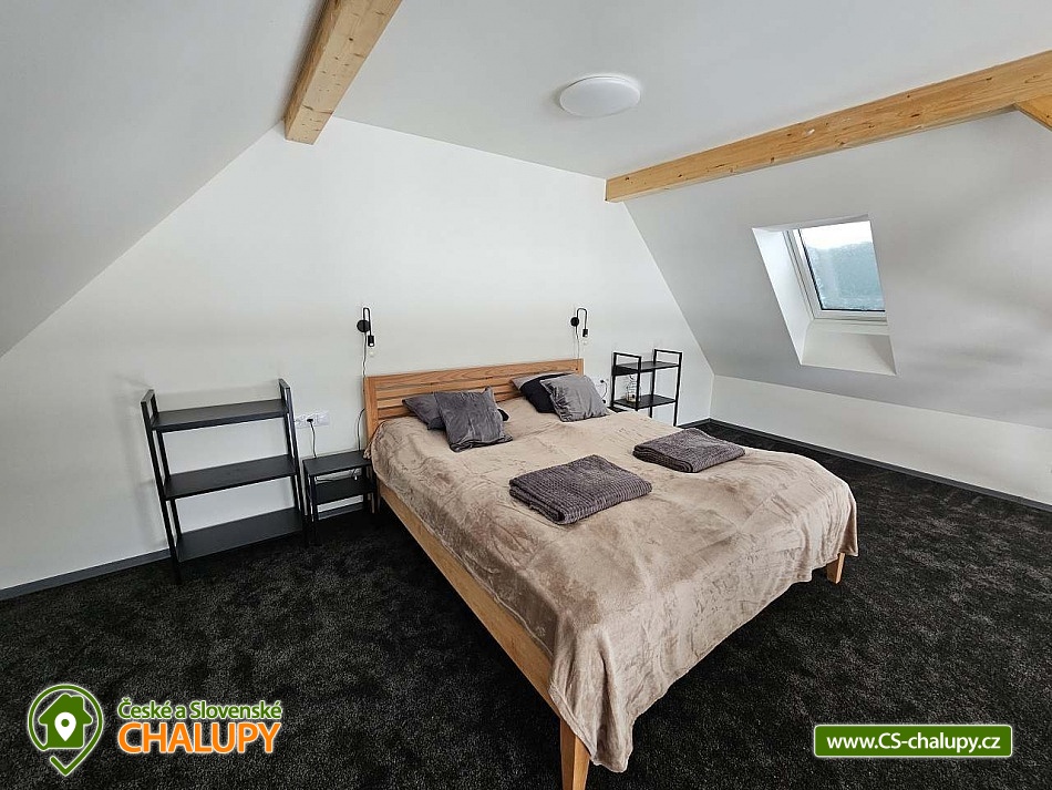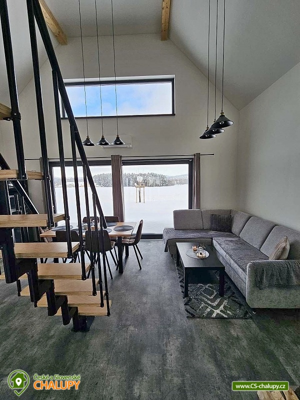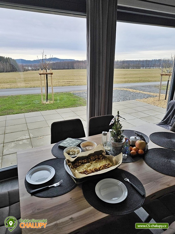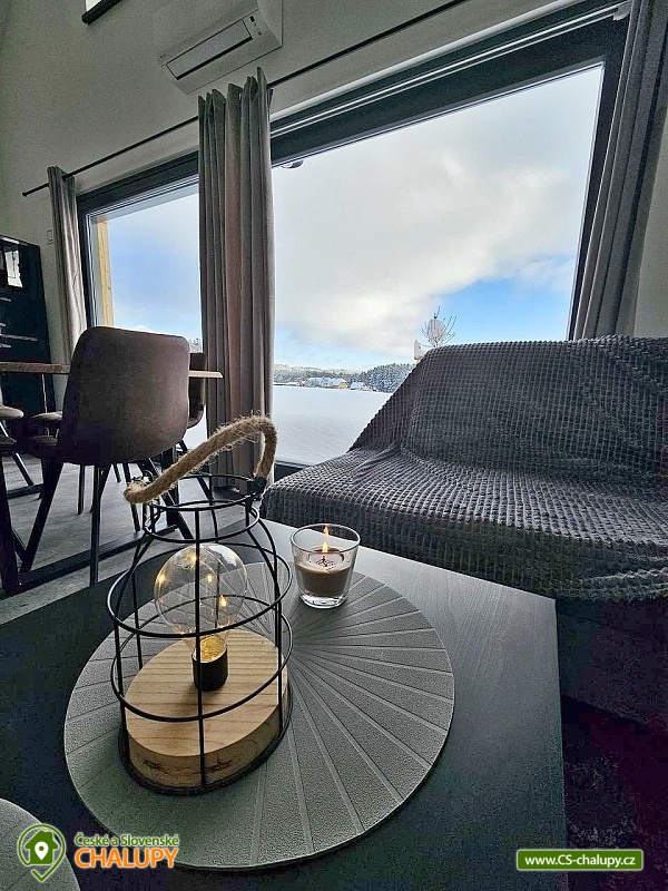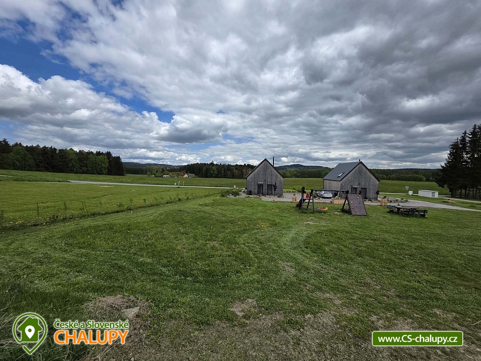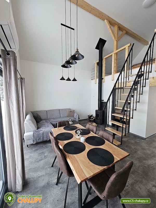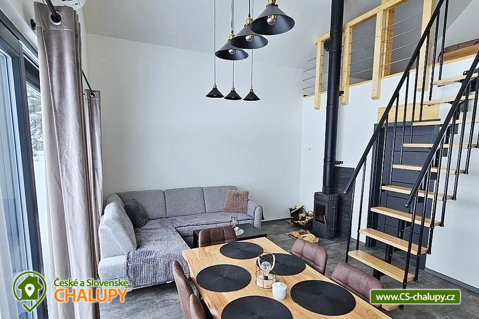 Chaty Černá v Pošumaví (2x chata pro 5 osob) se nachází v jižních Čechách u osady Žlábek poblíž obce Černá v Pošumaví a města Horní Planá v těsné blízkosti vodní přehrady Lipno. Jedná se o dvě nové, moderně vybavené a útulné chaty s krásným výhledem do přírody. V nedalekém okolí lze navštívit Český Krumlov, turisticky oblíbené město pro svou proslulou architekturu s malebnými uličkami a romantickou atmosférou a svým hradem a zámkem. Chaty nabízí ubytování pro až 10 osob ve dvou samostatně pronajímaných pětilůžkových chatách. Obě chaty jsou zařízené dispozičně stejně. V každé chatě jsou k dispozici dvě dvoulůžkové ložnice s manželskou postelí. Jedna ložnice je v samostatné místnosti, druhá je otevřená, umístěná na vyvýšeném patře spojeném schody s obývacím pokojem. Dále je k dispozici jedna přistýlka řešená rozkládacím gaučem v obývacím pokoji. Přistýlka může sloužit pro jednoho dospělého nebo dvě děti. Dětská postýlka je k zapůjčení. V obývacím pokoji lze posedět u krbových kamen nebo prostorného jídelního stolu se šesti židlemi. Velkými prosklenými okny si lze užívat výhledy do okolní přírody. Součástí pokoje je také plně vybavená kuchyň (lednice s mrazákem, myčka, kávovar, sklokeramická deska, horkovzdušná trouba, mikrovlnka, kávovar, toustovač, topinkovač a rychlovarná konvice). K dispozici je TV a WIFI připojení na internet. Sociální zařízení zahrnuje jednu koupelnu s vanou, umyvadlem a WC. Samozřejmostí jsou dávkovače s mýdlem u umyvadla a s tělovým šamponem u vany. Pod umyvadlem je umístěn vysoušeč vlasů. Vytápění je řešeno krbovými kamny, klimatizací a podlahovým topením. Venku lze posedět na terase. K dispozici je ohniště. Parkovat lze přímo u objektu. V okolí chat možnost turistiky, cykloturistiky, koupání, houbaření a rybaření. V blízkosti jsou také tenisové kurty, jízdárna a golfové hřiště. Lipenská přehrada vybízí k vodním sportům - jachting, windsurfing a kiteboarding. Nedaleko chatek se nachází ovčí a kozí farma, která zaujme malé i velké návštěvníky. V blízkém dosahu je také cyklostezka a restaurace. Mezi možnosti koupání patří např.: vodní nádrž Lipno, rybník Olšina, aquapark Frymburk, koupaliště Větřní , aquapark Lipno, bazén Český Krumlov, Chlumský rybník, Hornobranský rybník, atd. K výletům láká Lipenská oblast - Stezka korunami stromů s výhledem na Lipno, Mini zoo Lipno, Hopsárium, dále Rozhledna Dobrá Voda - Horní Planá, Rozhledna Libín a lanový park Libín, Medvědí stezka Nová Pec, Plešné jezero a Boubínský prales nebo nebo obec Frymburk s unikátní expozicí Svět pod hladinou s více jak 30 akvárii. Těšíme se na Vás u nás.
