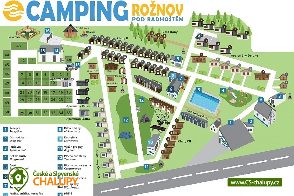 Chaty s bazénem v CHKO Beskydy - přijeďte si užít dovolenou do kempu s bazénem nedaleko Pusteven, na úpatí hory Radhošť. V areálu je k dispozici restaurace s možností celodenního stravování (snídaně, obědy, večeře). Děti potěší minizoo s ovečkami, prasátky a kozlíkem v areálu kempu + lanové centrum Gibon park je 150 metrů od kempu. POPIS: Chaty DELUXE - celkem 8 chat. Chaty se skládají ze samostatné ložnice, obývacího pokoje s kuchyní a toalet. Ubytování je možné od dvou do čtyř osob. Ložnice je vybavena manželskou postelí a patrovou postelí, v obývacím pokoji se nachází sedací souprava, TV a dekorační krb. Sociální zařízení je vybaveno sprchovým koutem, umyvadlem, wc. K chatě náleží také terasa s posezením (vybavena zahradním nábytkem včetně grilu), která je průchozí do obývacího pokoje. Kuchyně je kompletně vybavena (lednice, trouba, nádobí, rychlovarná konvice, sporák atd.). Chaty jsou umístěny v klidné části za bazénem. Chaty COMFORT - celkem 8 chat. Jedná se o čtyřlůžkové luxusní chaty s klimatizací a příslušenstvím. Chata se skládá ze tří pokojů: 2x ložnice, obývací pokoj s kuchyňským koutem a místnost se sociálním zařízením (sprchový kout, toaleta, umyvadlo). Chaty nají také terasu s grilem. Apartmány POOL - celkem 6 apartmánů. Apartmány POOL se nachází v bezprostřední blízkosti bazénu. Jedná se o čtyřlůžkové apartmány s jednou manželskou postelí a jednou patrovou postelí. Apartmán je vybaven kuchyňským koutem, sociálním zařízením (sprchový kout, toaleta, umývadlo). K apartmánu POOL náleží také terasa s posezením. Okolí Rožnova pod Radhoštěm skýtá mnoho tras pro zajímavé výlety. Přímo z kempu vede osmikilometrová trasa na Radhošť, po dalších 4 kilometrech dorazíte na proslulé Pustevny. Pět minut od kempu můžete navštívit skanzen Valašské muzeum v přírodě (bohatý program skanzenu probíhá prakticky po celý rok) a Jurkovičovu rozhlednu. Těšíme se na Vás u nás.