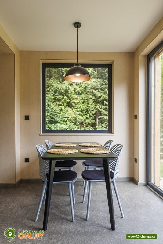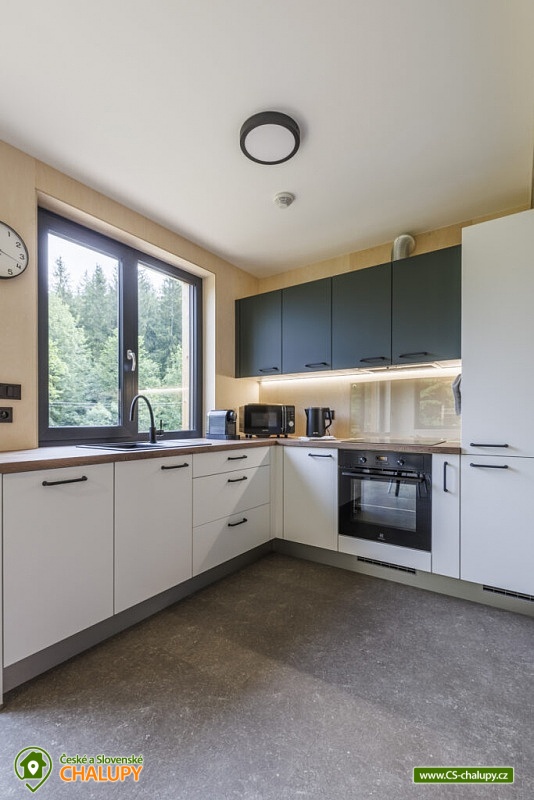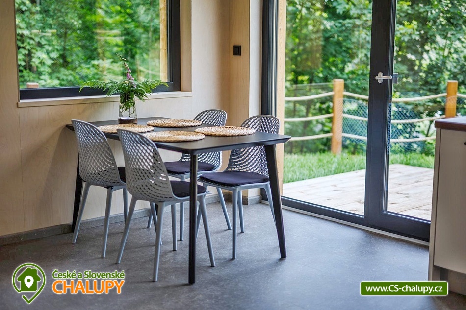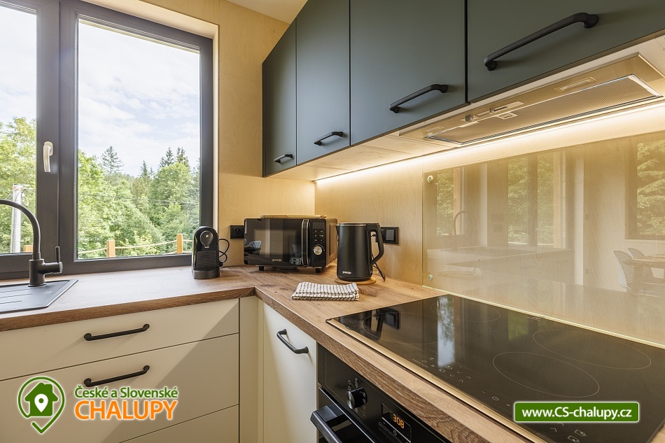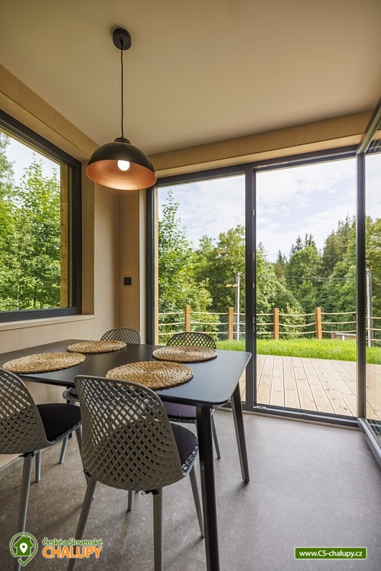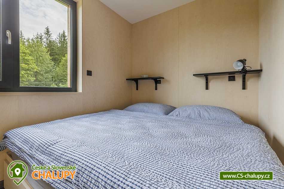 Chaty u lesa (2x chata 6 + 6 osob) se nachází na pomezí Jeseníků a Orlických hor pod Křížovým vrchem, poloha nedaleko areálu Bukovka na Dolní Moravě. Jedná se o dvě vedle sebe ležící a identicky zařízené chaty, spojené pouze terasou. Těšit se můžete na naprosté soukromí, lesní krajinu a moderní skandinávský styl. V zimním období výhodou těsná blízkost (cca 5 min. jízdy) Horského resortu Buková hora. Chaty nabízí ubytování pro až 12 osob ve 2 samostatně pronajímaných vedle sebe ležících chatách. Každá chata má kapacitu až 6 osob, celkem jsou k dispozici 4 pevná lůžka ve dvou dvoulůžkových ložnicích s manželskou postelí (180 × 200 cm) a 2 přistýlky řešené rozkládací sedací soupravou. Lůžkoviny jsou k dispozici. Společné chvíle lze trávit v obývacím pokoji s krbovými kamny, sedací soupravou, jídelním stolem, TV s více než 100 programy a plně vybavenou kuchyní (sklokeramická varná deska, trouba, varná konvice, mikrovlnná trouba, zapékací toustovač, myčka nádobí a velká lednice s mrazákem). K dispozici je také kapslový kávovar od Tchiba, včetně několika kapslí v ceně. Sociální zařízení zahrnuje v každé chatě samostatnou koupelnu se sprchovým koutem, umyvadlem a WC. Vytápění je řešeno podlahovým topením a v zimních měsících je možné přitopit krbovými kamny. Dřevo je zahrnuto v ceně pronájmu. V celém objektu je k dispozici WIFI připojení na internet. Posedět lze u venkovního stolu na terase, k zapůjčení je gril. Ke každému objektu také patří samostatná, uzamykatelná kolárna/lyžárna umístěna přímo u parkovacího stání. K dispozici je 6 parkovacích míst. V okolí objektu možnost turistiky, cykloturistiky, koupání, houbaření, lyžování a běžkování. Mezi možnosti koupání patří např.: koupaliště Králíky, Štíty - Acrobat Park, koupaliště Ruda nad Moravou, koupaliště Jablonné nad Orlicí, koupaliště Bludov - Vlčí Důl, koupaliště Šumperk - Bratrušák, bazén Šumperk - Aquacentrum, bazén Mezilesí, přehrada Pastviny, atd. K dispozici jsou blízká lyžařská střediska: Červená Voda - Buková hora, Šanov, Heroltice, Panorama - Štědrákova Lhota a další. K výletům v okolí láká Rozhledna Křížový vrch, Areál Dolní Morava, Kralický Sněžník, Pivovarské muzeum Hanušovice, Klášter Hora Matky Boží Hedeč - Králíky nebo Zámek a lázně Velké Losiny. Těšíme se na Vás u nás.
