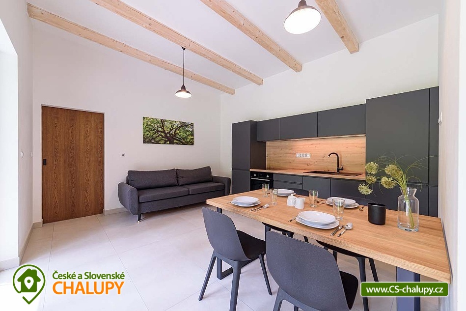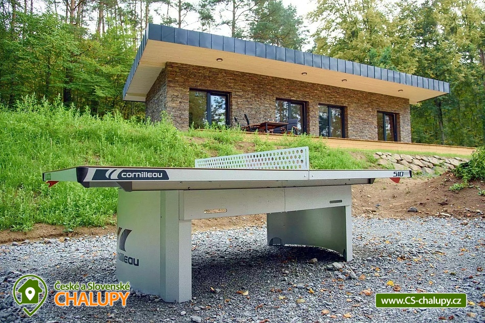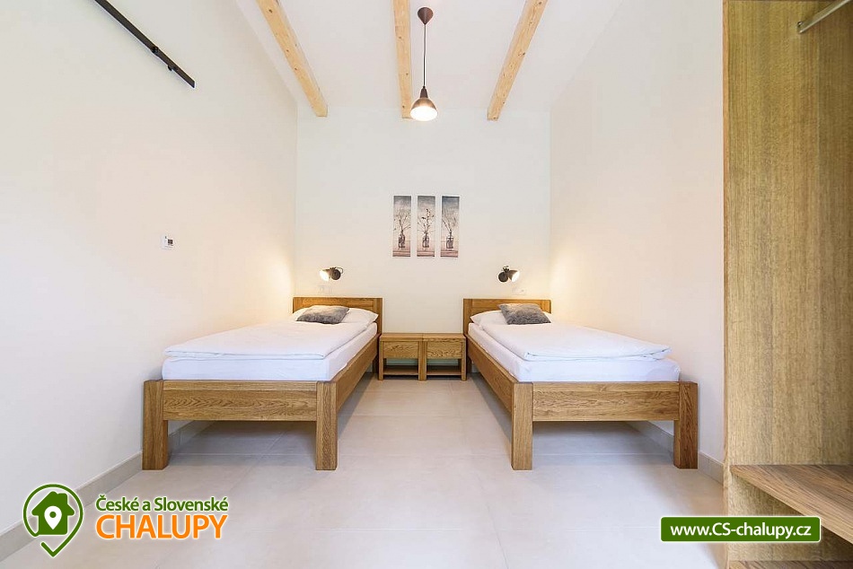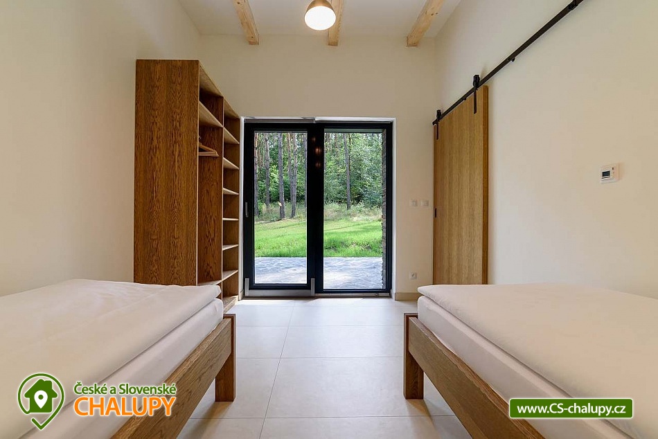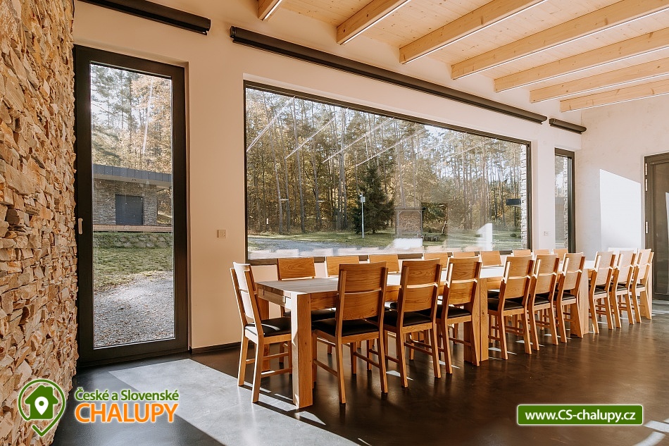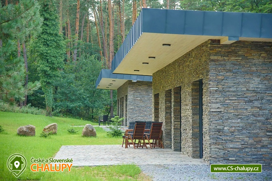 Chaty u lesa Slapská přehrada (4x chata pro 5 osob) se nachází na samotě v lese u obce Hrachov u Slapské přehrady, mezi městy Příbram a Sedlčany. Jedná se o čtyři samostatně stojící chaty Dub, Buk, Jasan a Javor s vlastní kuchyní, koupelnou a terasou. Každý objekt nese jméno dřeviny, ze které má vyrobený nábytek v interiéru. Tedy zatímco v Dubu ulehnete do masivní dubové postele, tak v Jasanu posnídáte u stolu z jasanového dřeva. V okolí si budete užívat klid, soukromí a čistou přírodu. Chaty nabízí ubytování pro až 20 osob v pětilůžkových samostatně pronajímaných a stejně zařízených objektech. Všechny chaty jsou 3+kk a mají k dispozici dvě dvoulůžkové ložnice, jednu s manželskou postelí a druhou s dvěma jednolůžky, a jednu přistýlku řešenou rozkládací pohovkou v obývacím pokoji. Postele jsou vybavené luxusními matracemi a součástí ložnic jsou prostorné šatní skříně. Dětská postýlka je k zapůjčení. Ložní prádlo a ručníky jsou samozřejmostí. Ke společným chvílím slouží obývací pokoj s rozkládací pohovkou, stolem z masivního dřeva a židlemi. Součástí pokojů jsou velká panoramatická okna s výhledem do přírody. V každém objektu je součástí obývací místnosti plně vybavená kuchyň (lednice, mrazák, trouba, sklokeramická deska, myčka, toustovač a varná konvice, moka konvice, nádobí pro vaření, pečení a stolování). K dispozici je dětská jídelní židlička. Sociální zařízení zahrnuje v každém objektu jednu koupelnu vybavenou sprchovým koutem, dvěma umyvadly a WC. Vytápění je řešeno podlahovým topením s regulací teploty v jednotlivých místnostech. Ve všech objektech je k dispozici WIFI připojení na internet. V každém objektu lze z ložnic a obývacího pokoje vstoupit přímo na částečně zastřešenou terasu s posezením. Jako samostatně stojící objekt je zde též moderně vybavená společenská místnost s krbem, která poskytuje ideální prostor pro konání rodinných oslav, večírků, svateb či firemních akcí. Velký jídelní stůl je k dispozici pro zábavu, společnou snídani či večerní posezení. Nechybí plně vybavená kuchyně s výčepním zařízením, lednicí, myčkou, sklokeramickou deskou, kávovarem, a koupelna s WC. Pro všechny ubytované je k dispozici travnaté hřiště, venkovní stůl na stolní tenis, ohniště a uzamykatelná garáž pro kola. Areál je dostupný auty po štěrkové cestě. Každá chata má vlastní parkovací místo přímo u objektu. Součástí areálu je také dobíjecí stanice pro elektromobily. V okolí možnost turistiky, cykloturistiky, koupání, houbaření a rybaření. V blízkosti je jízdárna a tenisové kurty. Mezi možnosti koupání patří např.: Slapská přehrada, lom Hřiměždice, vodní nádrž Kamýk, lom Solopysky, lom Sychrov, lom Obciny - Kosova Hora, vodní nádrž Orlík, rybník Papež, Lom Štětkovice (Bořená Hora), atd. K výletům v okolí láká Slapská přehrada s možností koupání, rybaření nebo plavby, Kulajův lom, Rozhledna Milada, Hrachovský dolmen, Váchův špejchar nebo historické městečko Kamýk nad Vltavou. Těšíme se na Vás u nás.