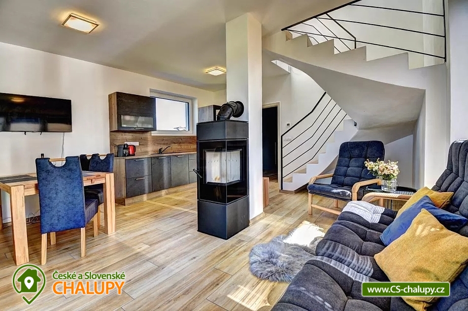 Vybavení objektu - vnitřní:dětská postýlka, dětská stolička, krb / krbová kamna, internet - wifi, vybavená kuchyně, rychlovarná konvice, varná deska, lednička, mrazák, mikrovlnná trouba, myčka, kávovar, topinkovač, toustovač, el. bojler pro ohřev vody, koupelna s wc společné, koupelna se sprchovým koutem, infrasauna, TV, společenské hry