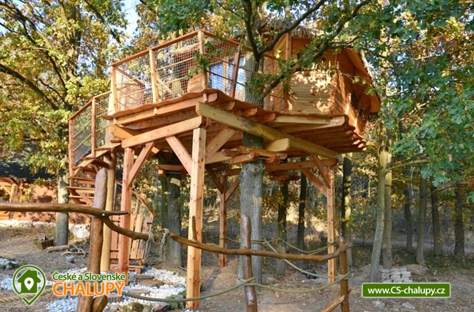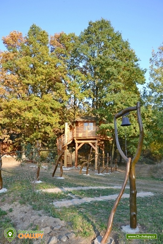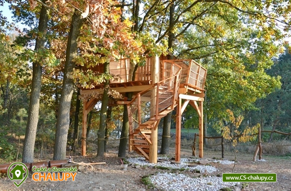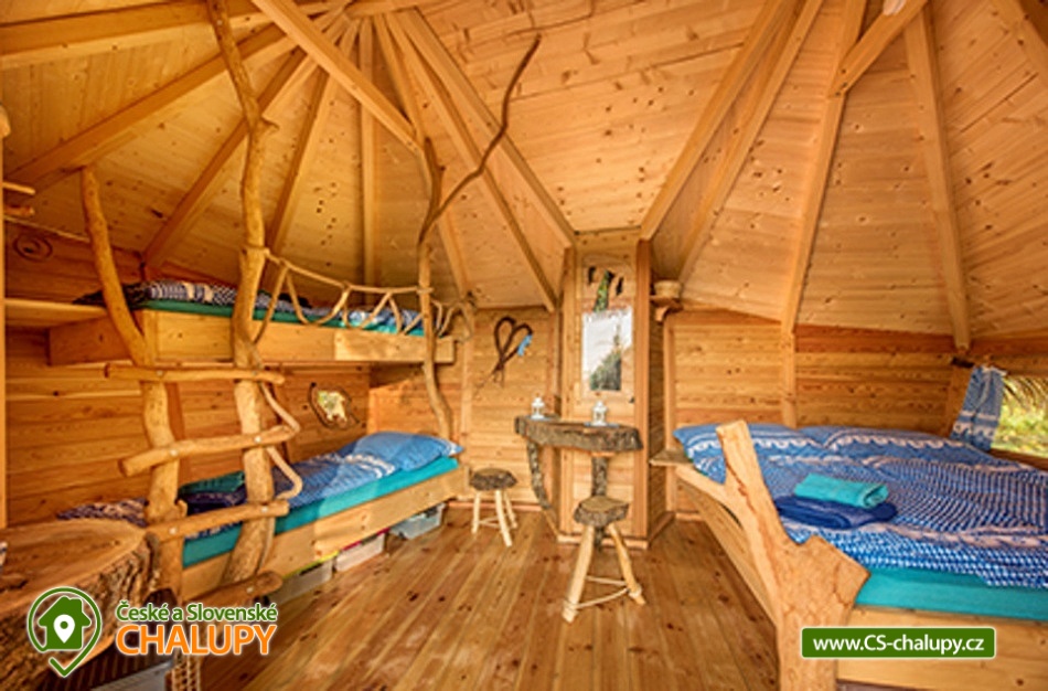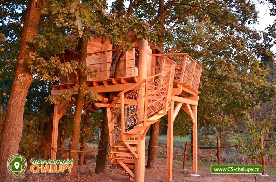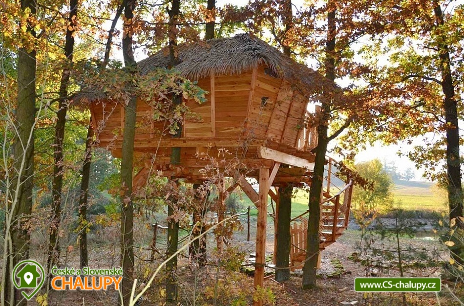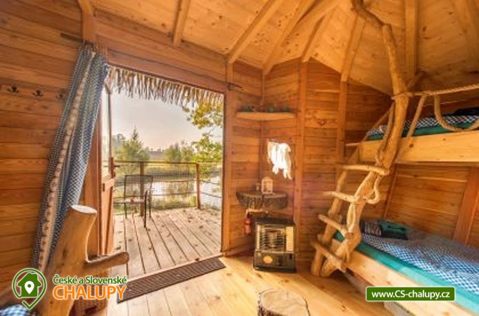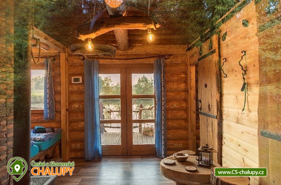 „Glamping = Srub na vodě (4 osoby) + Treehouse (4 osoby) + wellness“