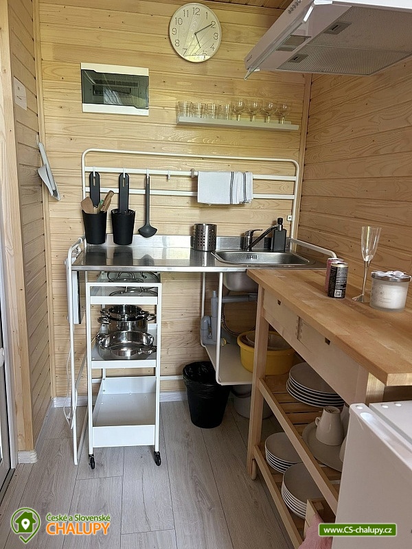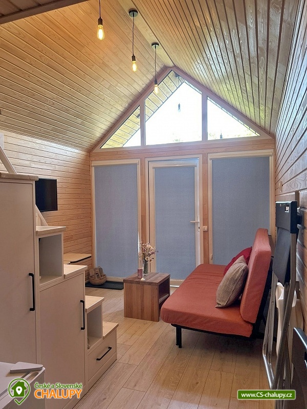 Glamping Kyjov - Chřibské lesy - Uherské Hradiště. Jedná se o dva stejně zařízené tiny housy nacházející se v obci Osvětimany v blízkosti přírodního lesnatého parku Chřiby a Osvětimanské přehrady, která je ideálním místem ke koupání, paddleboardingu, rybaření a pro další vodní sporty. Okolí je protkané řadou cyklostezek. Glamping v Osvětimanech nabízí od dubna do října klidné a útulné ubytování pro až 8 osob ve dvou samostatně pronajímaných vedle sebe umístěných tiny housech. Oba tiny housy jsou dispozičně stejně zařízené a mají kapacitu pro 4 osoby. V každém je k dispozici jedna ložnice v podobě otevřené galerie s manželskou postelí a jedním jednolůžkem a jedna přistýlka řešená rozkládací pohovkou v obývací části. K ložnici vedou strmější schody, ve kterých jsou zabudované úložné prostory. V přízemní části Tiny house je umístěná TV, stolek, pohovka a vybavená kuchyňka (lednice, kávovar, dřez, varná konvice, základní nádobí, hrnce a pánve). V přízemí se dále nachází koupelna se sprchovým koutem, umyvadlem, ručníky a WC. Vytápění je řešeno podlahovým topením. K dispozici je také klimatizace, která ochladí i zahřeje. Samozřejmostí je WIFI připojení na internet. Venku lze posedět u ohniště. Parkovat je možné přímo u objektu. K dispozici jsou 2 parkovací místa. V okolí glampingu možnost turistiky, cykloturistiky, koupání, houbaření a rybolov. V blízkosti jsou tenisové kurty, fotbalové, volejbalové a dětské hřiště. Mezi možnosti koupání patří např: Přehrada Osvětimany, koupaliště Smraďavka, vodní nádrž Koryčany, přehrada Nad Sovínem - Smraďavka, Koupaliště Koryčany, Koupaliště Těmice, Koupaliště Kyjov, Aquapark Uherské Hradiště atd. K výletům v okolí láká místní barokní kostel sv. Havla, přírodní park Chřiby, chráněné území - Ježovský lom se stepní faunou a flórou, národní kulturní památka Hradisko sv. Klimenta, zřícenina hradu Cimburk, hrad Buchlov, zámek Buchlovice se zámeckou zahradou, národní poutní místo Velehrad s Bazilikou a Lapidáriem, Expozice Živá voda s podvodním tunelem, archeoskanzen Modrá z období Velké Moravy, letecké muzeum v Kunovicích nebo Slovácké muzeum v Uherském Hradišti. Těšíme se na vás u nás.