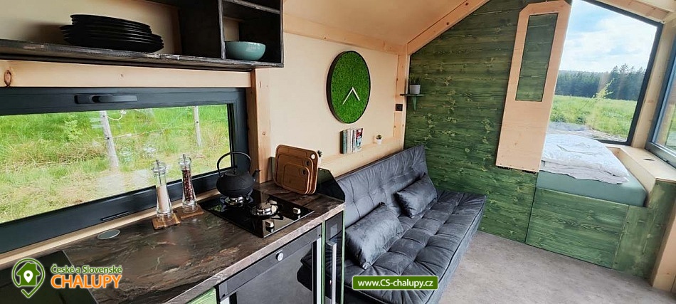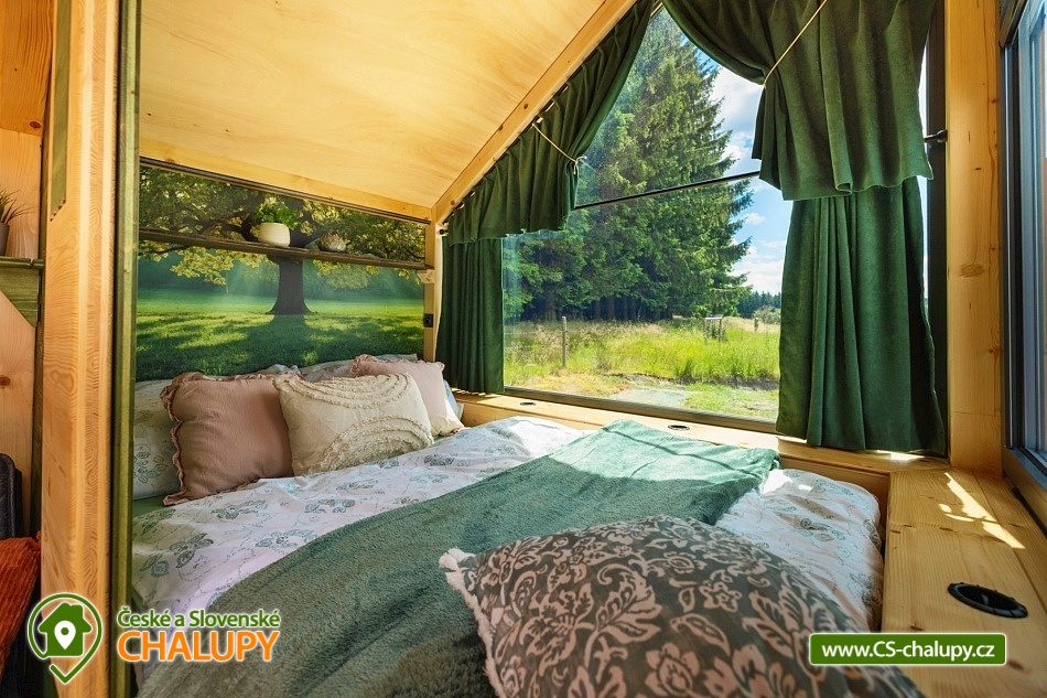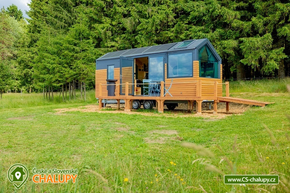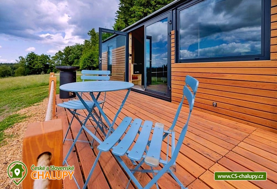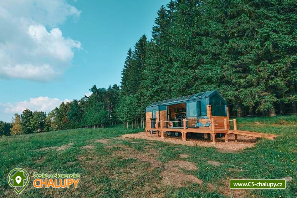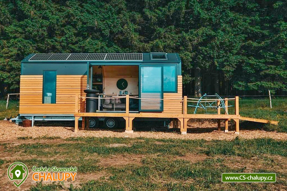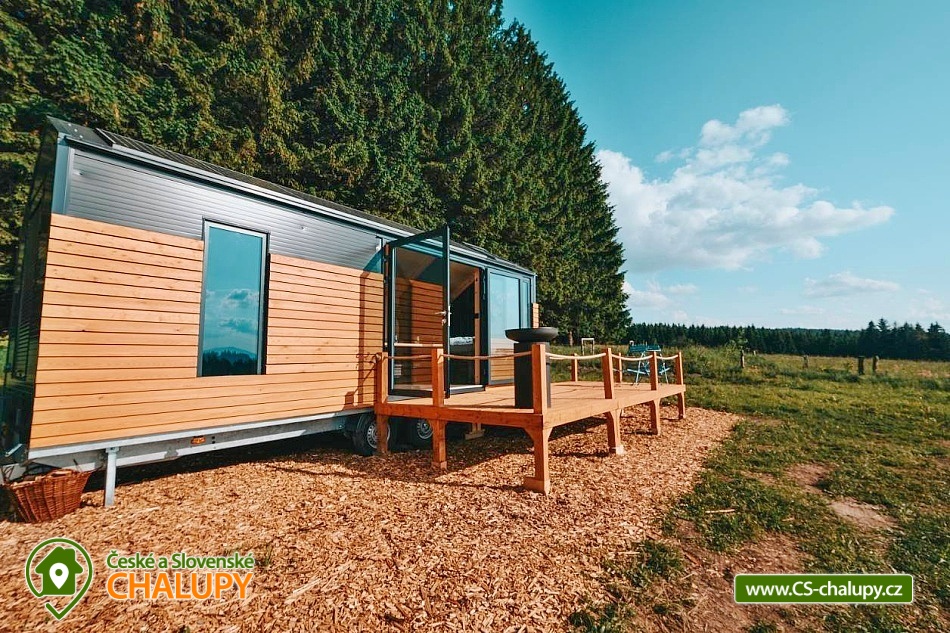 Glamping Lipno nedaleko Stezky v korunách stromů - Tiny House se nachází na samotě u obce Světlík v krásné přírodě jižních Čech u lesa uprostřed pastvin a luk. Nedaleko k výletům láká přehrada Lipno nebo turisticky oblíbené město Český Krumlov. Dominantou chaty je krásná terasa s grilem, ze které si lze užívat y nejhezčí západy slunce, kde se slunce ztrácí až za dalekým horizontem. Těšit se můžete na veškerý komfort od sprchy s teplou vodou, přes lednici, vinotéku, vařič, topení až po stropní ventilátor. Tiny House s krásnými přírodními motivy nabízí ubytování pro 4 osoby, k dispozici je jedna manželská postel a dvě přistýlky řešené rozkládací pohovkou. Ložní prádlo a ručníky jsou k zapůjčení. Součástí domku je jídelní stolek a vybavený kuchyňský kout (lednice, nádobí, plotýnka na vaření, varná konvice a základní potřeby na vaření). Sociální zařízení zahrnuje jednu stylovou koupelnu se sprchovým koutem a WC. Vytápění je řešeno ústředním topením. Venku lze posedět na terase s grilem. Parkovat lze přímo u objektu. V okolí domku možnost turistiky, cykloturistiky, koupání, houbaření, rybaření a lyžování. Mezi možnosti koupání patří např.: vodní nádrž Lipno, aquapark Frymburk, aquapark Lipno, koupaliště Větřní , Hornobranský rybník, bazén Český Krumlov, rybník Olšina, koupaliště Kaplice, koupaliště Velešín, požární nádrž koupaliště Třísov atd. V zimním období jsou k dispozici blízká lyžařská střediska Lipno - Kramolín a Frymburk. Lipenská oblast nabízí spoustu možností pro výlety - Stezka korunami stromů s výhledem na Lipno, Mini zoo Lipno, Hopsárium, gotický Hrad Rožmberk, Plešné jezero nebo Boubínský prales, Bobová dráha Slideland a Aquaworld Lipno. Dále láká Český Krumlov pro svou proslulou architekturu s malebnými uličkami a romantickou atmosférou a svým hradem a zámkem nebo obec Frymburk s unikátní expozicí Svět pod hladinou s více jak 30 akvárii. Těšíme se na Vás u nás.