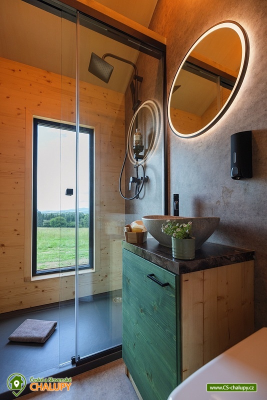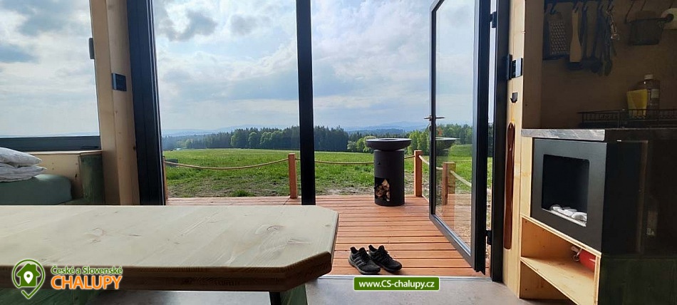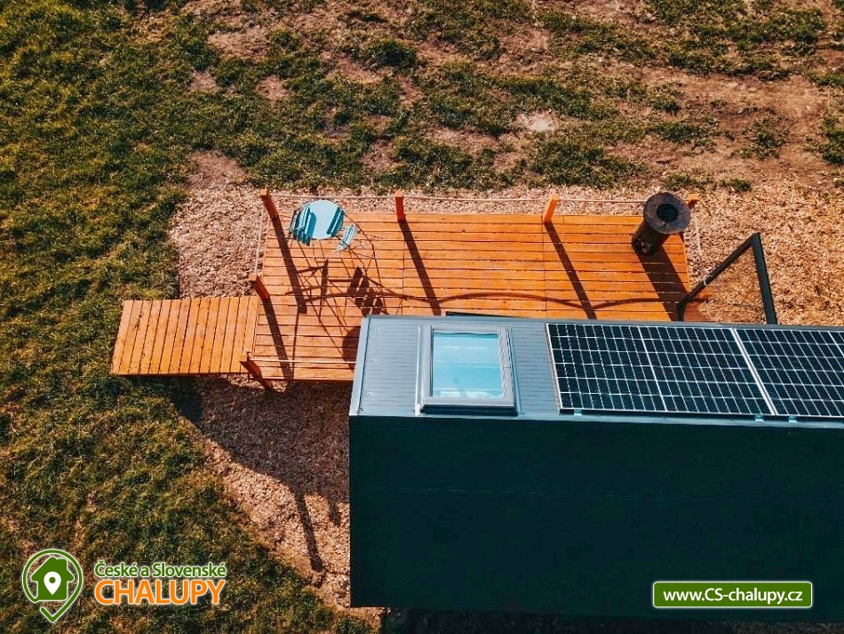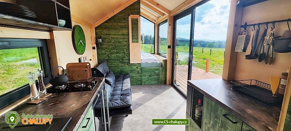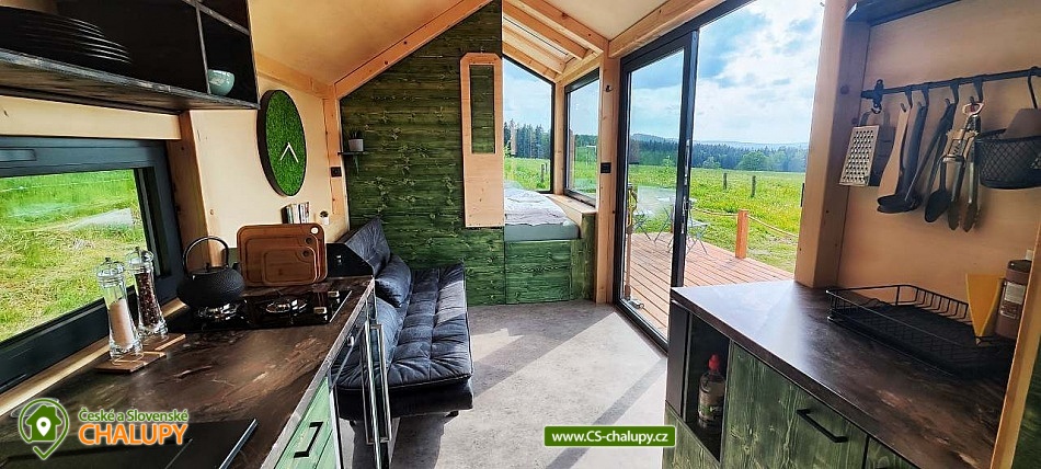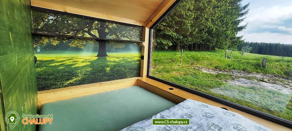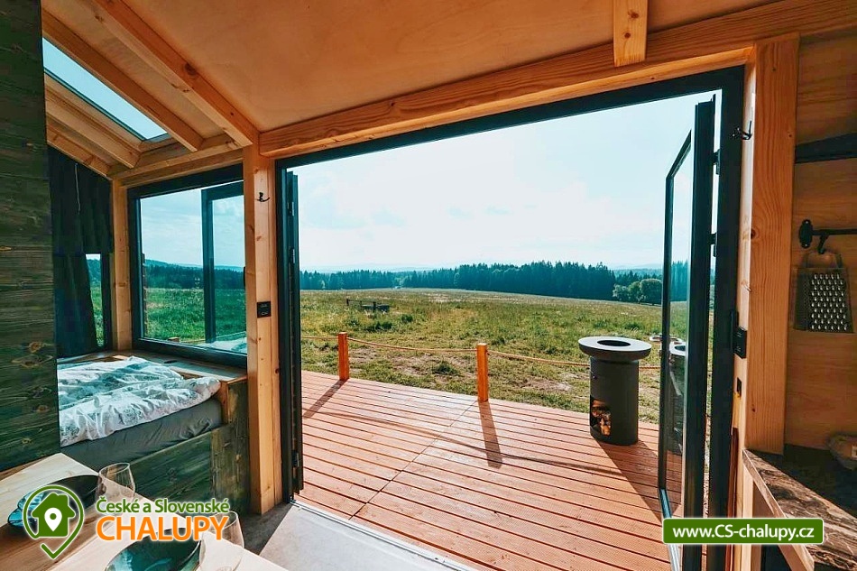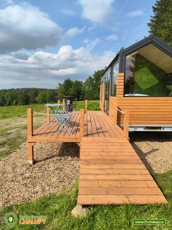 Glamping Lipno nedaleko Stezky v korunách stromů - Tiny House se nachází na samotě u obce Světlík v krásné přírodě jižních Čech u lesa uprostřed pastvin a luk. Nedaleko k výletům láká přehrada Lipno nebo turisticky oblíbené město Český Krumlov. Dominantou chaty je krásná terasa s grilem, ze které si lze užívat y nejhezčí západy slunce, kde se slunce ztrácí až za dalekým horizontem. Těšit se můžete na veškerý komfort od sprchy s teplou vodou, přes lednici, vinotéku, vařič, topení až po stropní ventilátor. Tiny House s krásnými přírodními motivy nabízí ubytování pro 4 osoby, k dispozici je jedna manželská postel a dvě přistýlky řešené rozkládací pohovkou. Ložní prádlo a ručníky jsou k zapůjčení. Součástí domku je jídelní stolek a vybavený kuchyňský kout (lednice, nádobí, plotýnka na vaření, varná konvice a základní potřeby na vaření). Sociální zařízení zahrnuje jednu stylovou koupelnu se sprchovým koutem a WC. Vytápění je řešeno ústředním topením. Venku lze posedět na terase s grilem. Parkovat lze přímo u objektu. V okolí domku možnost turistiky, cykloturistiky, koupání, houbaření, rybaření a lyžování. Mezi možnosti koupání patří např.: vodní nádrž Lipno, aquapark Frymburk, aquapark Lipno, koupaliště Větřní , Hornobranský rybník, bazén Český Krumlov, rybník Olšina, koupaliště Kaplice, koupaliště Velešín, požární nádrž koupaliště Třísov atd. V zimním období jsou k dispozici blízká lyžařská střediska Lipno - Kramolín a Frymburk. Lipenská oblast nabízí spoustu možností pro výlety - Stezka korunami stromů s výhledem na Lipno, Mini zoo Lipno, Hopsárium, gotický Hrad Rožmberk, Plešné jezero nebo Boubínský prales, Bobová dráha Slideland a Aquaworld Lipno. Dále láká Český Krumlov pro svou proslulou architekturu s malebnými uličkami a romantickou atmosférou a svým hradem a zámkem nebo obec Frymburk s unikátní expozicí Svět pod hladinou s více jak 30 akvárii. Těšíme se na Vás u nás.