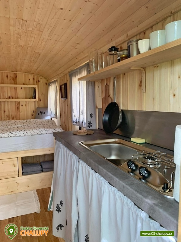 Glamping Šumava se nachází na samotě, uprostřed lesů a luk v podhůří Boubína, nedaleko od obce Lažiště, na půl cesty mezi Prachaticemi a Vimperkem, na dohled údolí řeky Blanice. Glampingová Maringotka vám poskytne ideální prostor pro odpočinek od města a od lidí. Těšit se můžete na úžasný klid, který občas zpestřuje pouze houkání sovy, zvuky datla anebo srnce potulující se po okolí. Okolí maringotky je přímo stvořené pro výlety v krásné šumavské přírodě. Tato útulná dřevem obložená maringotka poskytuje ubytování pro 2 osoby. V maringotce je pro vás připraveno dvoulůžko se zdravotní matrací. Postele jsou pro návštěvníky vždy povlečené a k dispozici jsou peřiny i deka pro zimomřivce. Samozřejmostí jsou i ručníky. Pro vaření je k dispozici vybavený kuchyňský kout (plynovým dvouvařič, dřez, jídelní nádobí, příbory, skleničky a vše potřebné pro vaření). Pitná voda je k dispozici. Posedět nebo si číst můžete u rozkládacího stolu pro dvě osoby se svítilnou na baterky nebo na plyn. Sociální zařízení zahrnuje jednu venkovní sprchu a suchý záchod. Topení je v chladnějších měsících řešeno plynovými kamny. Na zahradě je k dispozici venkovní posezení a ohniště. Také si můžete lehnout a odpočívat v hamace a večer z ní třeba pozorovat hvězdy, které zde budou jasnější než kdekoliv jinde. Po domluvě je možné u maringotky postavit stan nebo přenocovat jen pod širákem. Pakrovat lze přímo u objektu. V okolí maringotky možnost turistiky, cykloturistiky, koupání, houbaření a rybolov. V nedaleké obci Lažiště (cca 1km) je obchod, kostel i hospoda a koupaliště se sportovišti. Za návštěvu stojí rozhledna Libín, Svatá Máří, Boubínská rozhledna i s přilehlým pralesem nebo město Husinec, rodné město mistra Jana Husa. Krásně je i na nedalekém Křišťanovickém rybníce. Ve městě Prachatice lze navštívit krytý bazén, letní kino nebo muzeum. Přijeďte si odpočinout od všedního shonu a ruchu. Těšíme se na Vás u nás.
