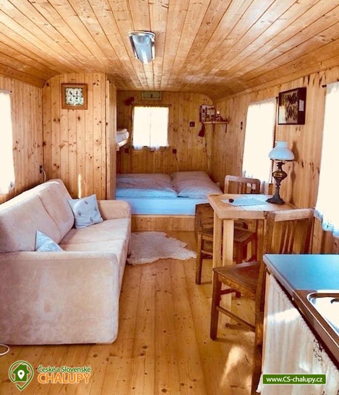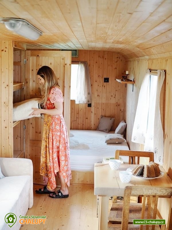 Glamping Šumava s finskou saunou a koupacím jezírkem najdete v ne zcela objevené části Šumavy, ve východním podhůří hory Boubín a téměř na samotě u lesa nedaleko Národní přírodní rezervace Boubínský prales. Maringotka poskytuje ubytování pro až 4 osoby. K této zelené, dřevem obložené maringotce vás zavede cesta z vesnice Nicov. Kromě toho ale kolem maringotky nevede žádná hlavní ani turistická trasa a tak si můžete dopřát naprostý klid. U maringotky se můžete těšit na koupací jezírko, které můžete využívat celoročně, v létě k ochlazení a v zimě k otužování. Za poplatek si zde můžete užít i wellness relaxování v sauně. Menší prostor je sice ideální spíše pro páry, ale ubytovat se zvládne i čtyřčlenná rodina. K dispozici je 2x2 metry velká postel, nad níž je vyvýšené ještě jednolůžko. Jako další přistýlka slouží rozkládací pohovka. Vnitřek maringotky je jednoduchý, ale komfortně zařízený ve světlém dřevě. Kuchyňský koutek je vybavený malou ledničkou, rychlovarnou konvicí, nádobím i vařičem pro přípravu jednoduchých jídel. Pitná voda je k dispozici v ledničce, kde také najdete produkty na snídani, výhradně od lokálních dodavatelů a v bio kvalitě. Toaleta a sprcha jsou umístěny v sousední usedlosti, kde žijí majitelé. K dispozici jsou ručníky, ložní prádlo, mýdlo a toaletní papír. Na zahradě je připraveno příjemné posezení, kde lze grilovat nebo opékat buřty na ohništi. Děti se mohou těšit na houpačku a skluzavku. Parkovat lze přímo u objektu. V okolí možnost turistiky, cykloturistiky, koupání, houbaření a rybaření. Pro koupání lze využít koupaliště ve Vimperku, Lažištích, Žárovné, nebo přehradu v Husinci. Dále lze navštívit vrch Boubín s rozhlednou, zámek Vimperk, tvrz Drslavice, rozhlednu Mařský vrch, Libínské Sedlo (rozhledna, lanový park, lyžařský vlek). Ve městě Prachatice lze navštívit krytý bazén, letní kino nebo muzeum. Těšíme se na Vás u nás.