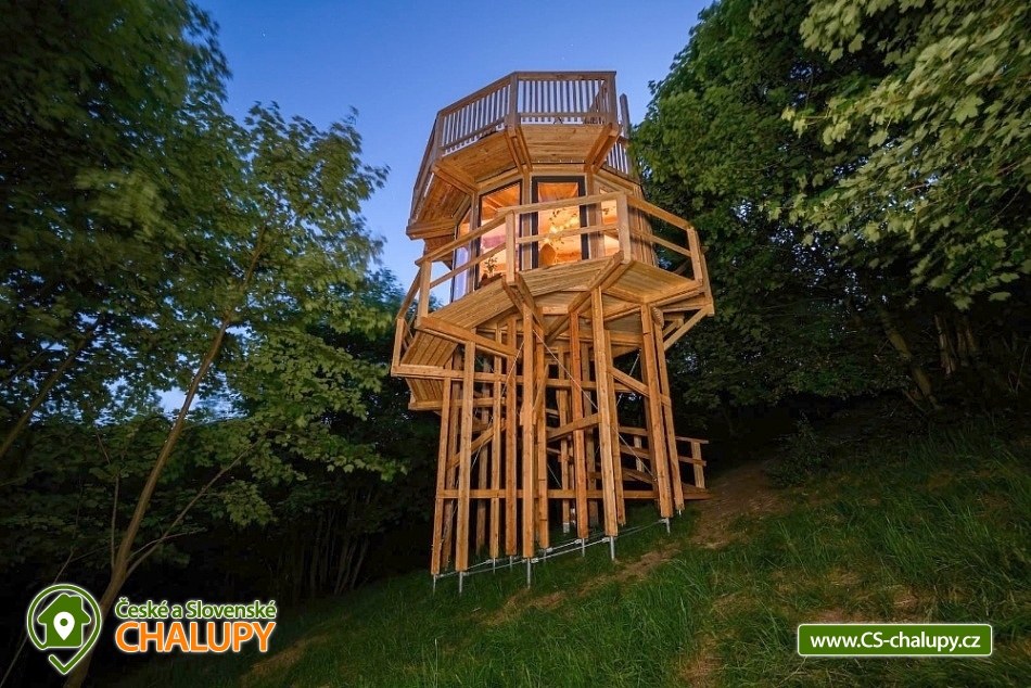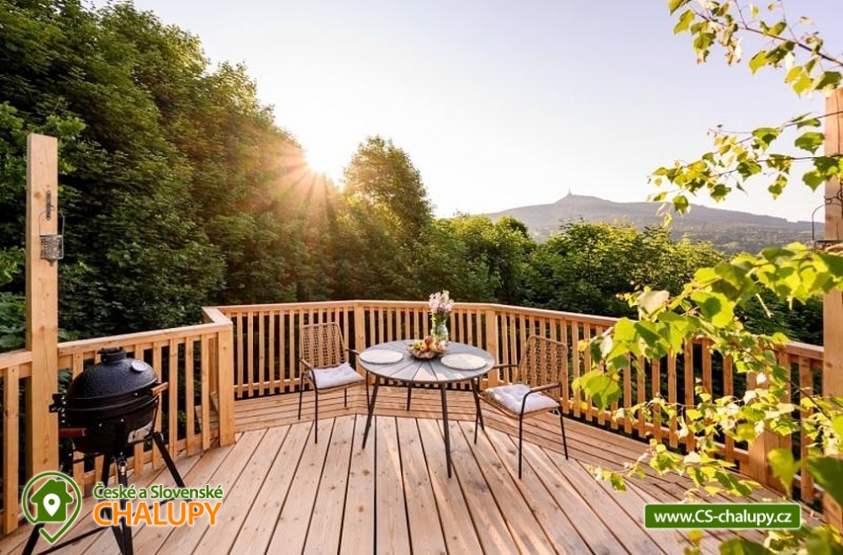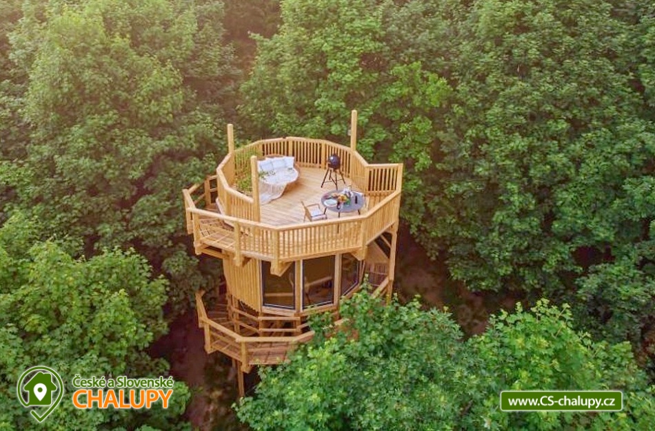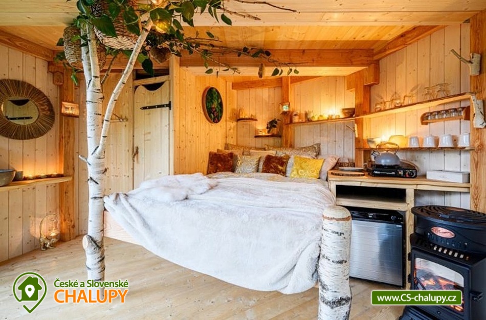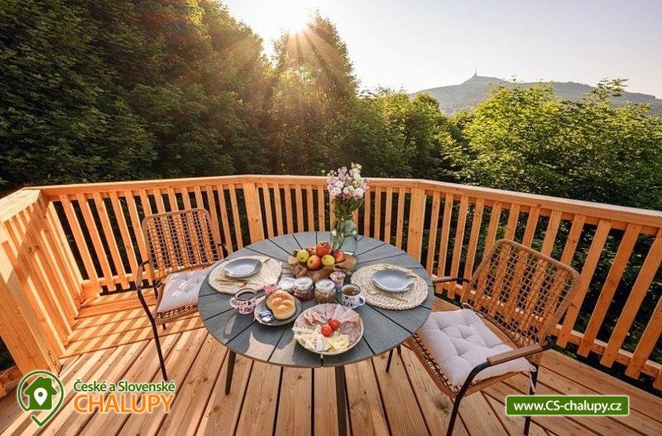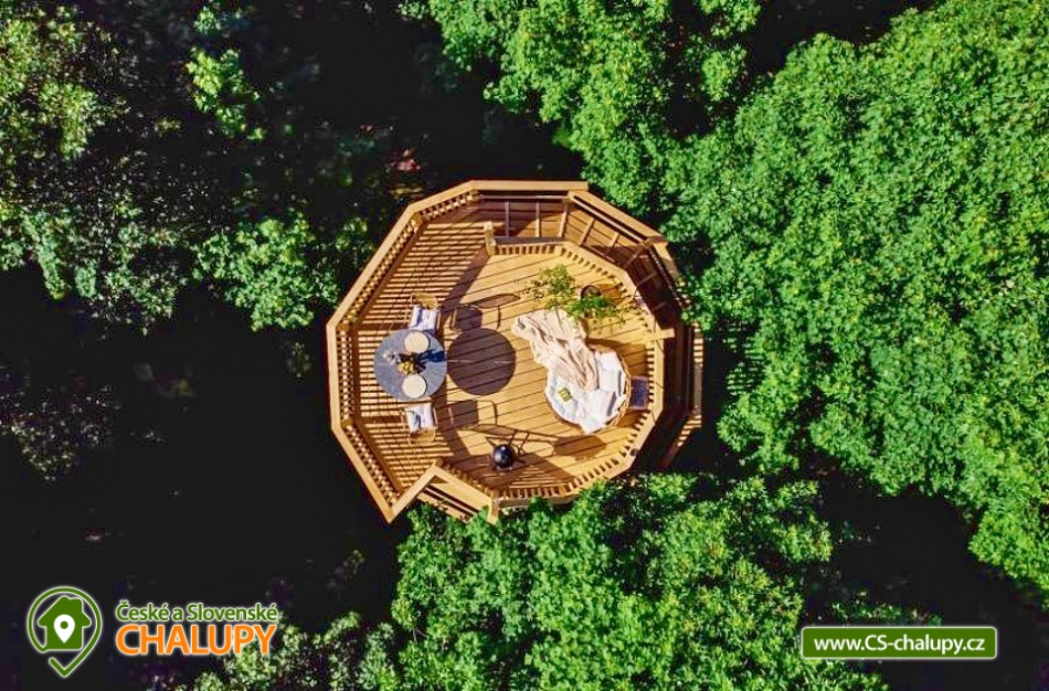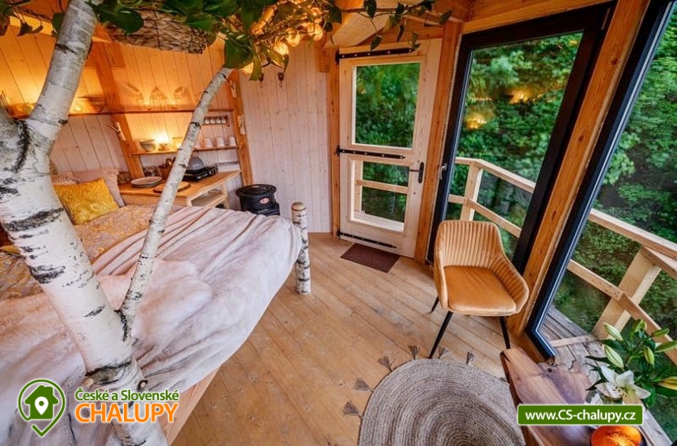 Unikátní glamping s venkovní saunou na samotě v lese. Originální ubytování u vrcholků stromů s obytným patrem a panoramatickou terasou na střeše. Užívat si můžete omamné šumění lesa a uvidíte nádherná panoramata s dominantou hory Ještěd. Glampingu dominují přírodní materiály, od postele z masivu až po dekorace na stěnách, všude je cítit vůně dřeva a samotného lesa. Glamping poskytuje ubytování se snídaní pro 2 dospělé osoby. V prvním patře chaty je připravený útulný obytný prostor, kde je k dispozici malá kuchyňka, posezení, kamínka na vytápění, toaleta, umyvadlo a především velká postel. Druhé patro s terasou slouží pro grilování a nekonečné kochání se místní přírodou. Vybavení zahrnuje střešní terasu, keramický gril, privátní saunu, plnohodnotnou lednici, vařič na kávu a čaj a luxusní chodící spací pytle pro pobyt na střešní terase. Součástí kuchyňského koutku je také káva, čaj, cukr, mléko do kávy a pitná voda. Osprchovat se tu můžete přímo pod korunami stromů ve venkovní sprše (voda ve venkovní teplotě). K dispozici jsou 2 toalety, jedna přímo v ubytování a druhá venku. Obě jsou suché a splachují se unikátně pilinami. Vytápění zajišťuje litinový automatický krb. Objekt nemá k dispozici wifi připojení a elektřinu. Tu pravou atmosféru si lze vytvořit světlem svíček nebo si užívat hvězdy nad hlavou. Na střešní terase nechybí luxusní venkovní postel, protože není nadto se po grilovačce natáhnout a koukat přímo na hvězdy. Na pozorování cvrkotu na Ještědu je připravený dalekohled. Gurmánské zážitky podtrhne portugalský porcelán. Voňavoučké peřiny nejvyšší třídy se značkovým saténovým povlečením Vás zahřejí i v chladnějších dnech. A atmosféru dotváří i živé květiny. Parkovat lze 650 m od objektu. V okolí možnost turistiky, cykloturistiky, koupání, houbaření a lyžování. V blízkosti je také in – line stezka a golfové hřiště. Mezi možnosti koupání patří např.: vodní nádrž Hamr na Jezeře, koupaliště Kryštofovo Údolí, aquapark Centrum Babylon - Liberec, plavecký bazén Liberec, Vesecký rybník - Tajch, přehrada Harcov, koupaliště Obří sud - Javorník, vodní nádrž Horka - Stráž pod Ralskem. V zimním období blízká lyžařská střediska patří: Ještěd, Světlá pod Ještědem, Dolní Pláně, Vesec a Obří sud - Javorník. K výletům láká příroda Jizerských hor, Ještěd, ZOO a Botanická zahrada Liberec, Kryštofovo údolí, Kouzelné Lázně Kundratice, Zámek Nový Děvín či Zámek Nový Falkenburk. Těšíme se na Vás u nás.
