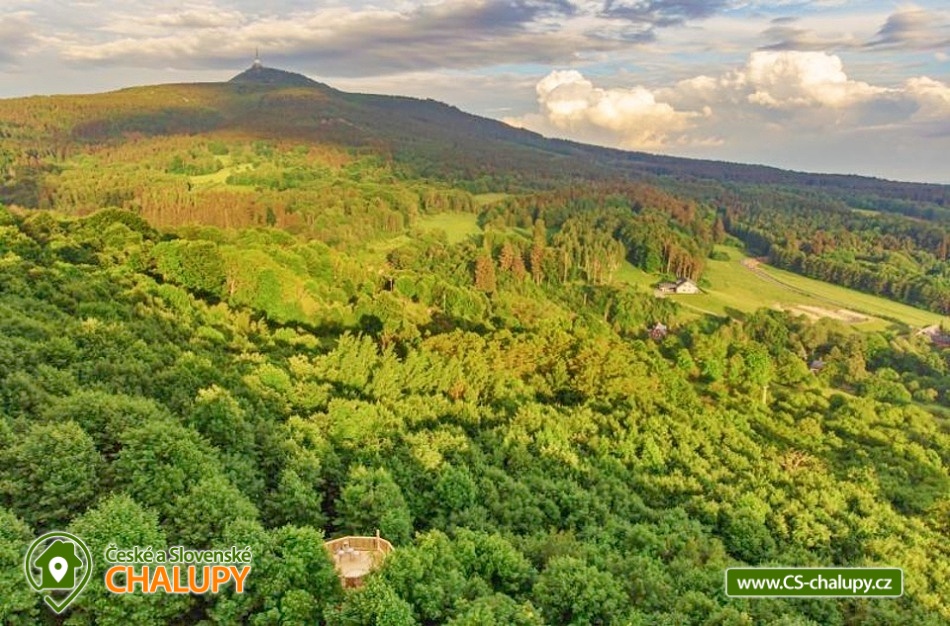 Glamping v korunách stromů - výhled na Ještěd Jizerské hory