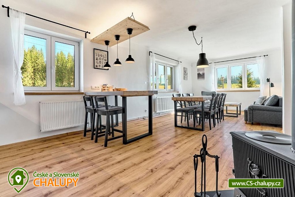 Komfortní Horská chata (2 apartmány 8 + 8 osob) u Bukového potoka v Krušných horách. Poloha nedaleko přírodní památky Rolavská vrchoviště a obce Horní Blatná - lokalita v těsné blízkosti státní hranice s Německem nabízí nespočet možností pro letní i zimní aktivity – od turistických tras a cyklostezek vedoucích panenskou krajinou až po běžkařské trasy a nedaleké sjezdovky pro milovníky zimních sportů. Kapacita moderní horské chaty je až 16 osob ve 2 apartmánech (8 + 8 osob). Dva prostorné apartmány v severském stylu jsou ideální pro rodiny i přátele, kteří hledají místo k odpočinku i dobrodružství. Čeká vás designový interiér, plně vybavená kuchyně, Wi-Fi, parkování zdarma a kouzelná příroda všude kolem. POPIS: Oba apartmány nabízejí - Širokoúhlá LED televize s běžnými programy a možností připojení Netflix a dalších služeb. Wi-Fi Vysokorychlostní připojení. Plně vybavená kuchyně - lednice, myčka nádobí a tablety, trouba, mikrovlnná trouba, indukční varná deska, toustovač, kávovar a varná konvice. Ložnice č.1 - velká manželská postel, Ložnice č.2 - 6 jednolůžkových postelí a Obývací pokoj - rozkládací pohovka. Koupelna se sprchovým koutem, samostatná toaleta. Parkování u domu. Hosté mají k dispozici společnou místnost pro uložení kol, lyží a dalšího vybavení. Oba apartmány disponují vlastním posezením na zahradě. Okolí: Nové Hamry jsou malebná horská obec v Krušných horách, ideální pro milovníky klidu, přírody a aktivního odpočinku. V zimě lákají upravené běžkařské tratě a menší lyžařský areál vhodný pro rodiny s dětmi. V létě jsou skvělým výchozím bodem pro pěší i cyklistické výlety. Za návštěvu stojí rozhledna na Tisovském vrchu (Pajndl) s výhledem na celé Krušné hory, nebo Jelení vrch, odkud je krásný výhled na údolí. Okolí je protkáno značenými trasami a láká k procházkám lesem i výletům k technickým památkám, jako jsou pozůstatky těžby a hutnictví železa. Mnoho turistických tras, po kterých je možno jezdit na kole a v zimě na běžkách. Výlet do Karlových Varů také stojí za to. Na Božím Daru je tzv. Ježíškova cesta, krásná zábava pro děti.