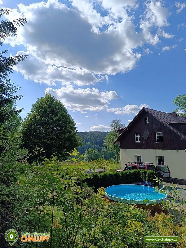 Horská chata s wellness a letním bazénem v CHKO Orlické hory. Kapacita chaty je až 25 osob v 8 ložnicích. V přízemí chaty se nachází prostorná kuchyň (el. sporák, lednička, mikrovlnná trouba, kávovar, rychlovarná konvice, kuchyňské nádobí) s jídelním koutem a společenská místnost (stolní fotbal, el. šipky, výčepní zařízení, kulečník, TV) s WC. V chatě jsou celkem 3 samostatné apartmány (objekt se vždy pronajímá pouze jako celek). 1. AP je v přízemí a má dva pokoje, první pokoj celkem 4 lůžka (1x palanda, 2x jedno lůžko). Druhý pokoj celkem 3 lůžka (1x lůžko, 1x dvojlůžko). Samostatné WC, sprcha a menší kuchyňský kout s el. sporákem, el. troubou a varnou konvicí. 2. AP je v prvním patře a má tři pokoje. První pokoj 1 samostatné lůžko a TV. Druhý pokoj celkem 4 lůžka (2x dvojlůžko). Třetí pokoj celkem 4 lůžka (1x palanda, 2x jedno lůžko). Samostatné WC a sprcha. 3. AP je také v patře a má tři pokoje. První pokoj celkem 4 lůžka (1x palanda, 2x jedno lůžko). Druhý pokoj celkem 4 lůžka (1x palanda, 2x jedno lůžko). Třetí pokoj celkem 1 samostatné lůžko a TV. Dále koupelna s WC a sprchou. K dispozici infrasauna a vířivka. Objekt je vytápěn ústředním topení automatickým kotlem. V okolí chaty je volné neoplocené prostranství nabízející příjemné posezení v zahradním nábytku u krbu nebo ohniště, či koupání ve venkovním bazénu (prům. 3,5 m). Pro děti pískoviště, houpačky, dětská opičí dráha a trampolína o průměru 3m. Okolí v letním období nabízí ideální podmínky cyklistům tj. horské silnice a cesty protínající Orlické hory téměř bez provozu, rozmanitý terén, zajímavou přírodu a množství kulturních památek daleko od průmyslových center. Obcí prochází hlavní cyklotrasa Orlických hor, která spojuje Deštné v Orlických horách, Říčky a Bartošovice. V zimě - Náročnější lyžaři mohou využít sjezdové tratě ve střediscích Říčky v Orlických horách nebo Deštné v Orlických horách. Poloha ve středu chráněné krajinné oblasti Orlické hory a nadmořská výška 680 m. n.m. je výhodná i pro milovníky běžek. Po 5 km stoupání po strojově upravené běžecké stopě se dostanete na hlavní lyžařskou magistrálu Orlických hor Jiráskovu cestu, která spojuje nejvyšší horu Orlických hor Velkou Deštnou a Komáří vrch. Těšíme se na Vás u nás.