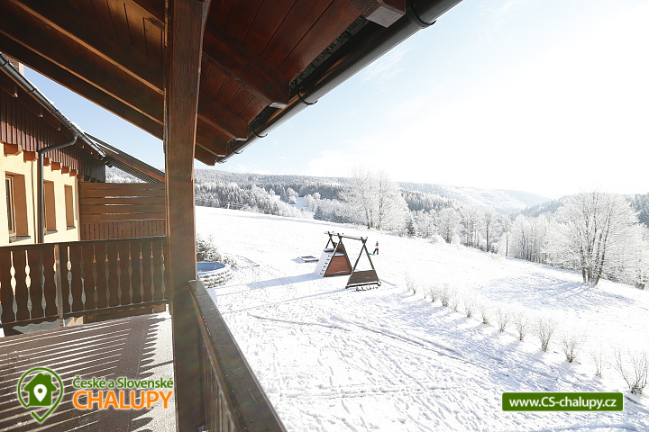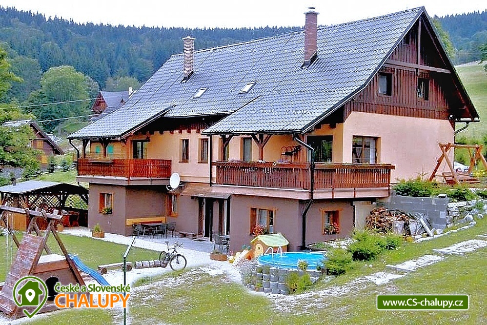 Jesenická horská chalupa nedaleko střediska Ostružná a Přírodní rezervace Šerálk-Keprník, obec Velké Vrbno. Svou polohou a vybavením je chalupa vhodná také pro rodiny s dětmi. Chalupa k pronajmutí poskytuje ubytování pro až 16 osob v 5 ložnicích. Ložnice a pokoje: Horní mezonetový apartmán - 2x 3 - lůžk. pokoj, 1x 2 - lůžk. pokoj, 2 lůžka v podkroví, 2 koupelny a jídelna s obývacím pokojem a kuchyní. Přízemní apartmány - 2x 4lůžkový - každý má svůj vchod, lyžárnu, kuchyň s obývací částí a lodžii, koupelnu. Apartmány nejsou průchozí. Sociální zařízení: 4x koupelna se sprchovým koutem a WC. Vytápění: Horní apartmán - elektrokotel + krbová kamna. Nově zrekonstruované spodní 4lůžkové apartmány - topení v podlaze. Parkování u objektu i v zimě - 5 parkovacích míst. Vybavení chalupy: V objektu dva 4 - lůžkové apartmány s přistýlkou v přízemí domu, kompletně zařízené s kuchyní, WC, sprchou, lyžárnou se samostatným vchodem. V 1.patře k dispozici mezonetový apartmán, 2x koupelna s WC, plně vybavená kuchyň(myčka, el. sporák s troubou, mikrovlnná trouba), obývák s krbovými kamny, jídelna, terasa a 3 pokoje (3+3+2)s 2 přistýlkami v podkroví apartmánu. U objektu možno využít zahradní altán s grilem a posezením, v létě dohřívaný bazén, dětské hřiště, zahradní kuželky, zatravněná plocha, u každého apartmánu venkovní posezení. V objektu možno zdarma využívat Wi - fi připojení. V okolí: 100 m od chalupy se nachází dvousedačková lanovka na chatu Paprsek (délka 1000 m). Sjezdovky jsou uměle zasněžovány, pravidelně upravovány, v areálu se nachází jeden z největších snowparků v ČR. V okolí chalupy jsou strojově upravené běžecké tratě. V létě cyklotrasy, horská turistika, houbaření, borůvky. Možnosti koupání: Hynčice pod Sušinou - rybník Úžas, lom Žulová - Brankopy, bazén Jeseník - Priessnitz, koupaliště Jeseník, bazén Domašov - Bělá pod Pradědem a termální koupaliště Velké Losiny.