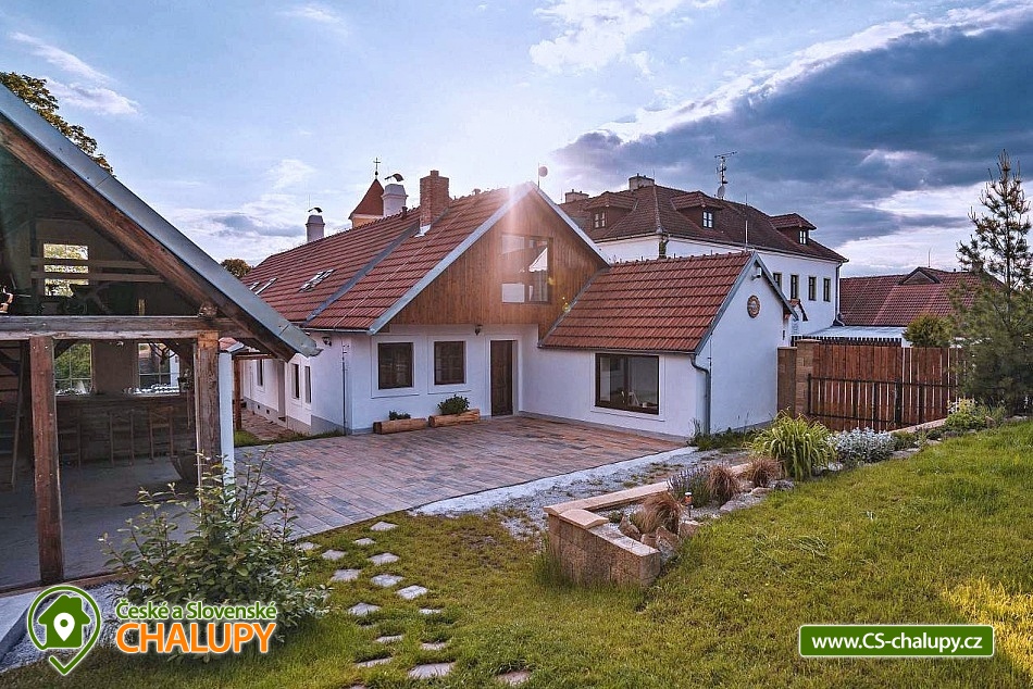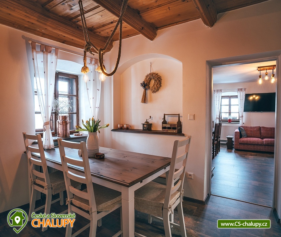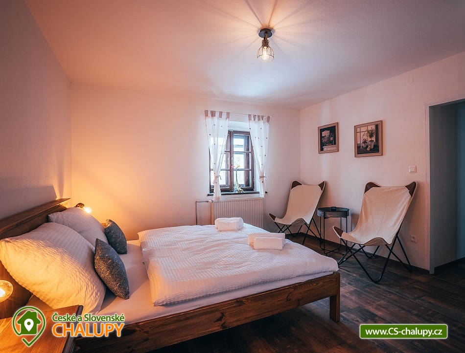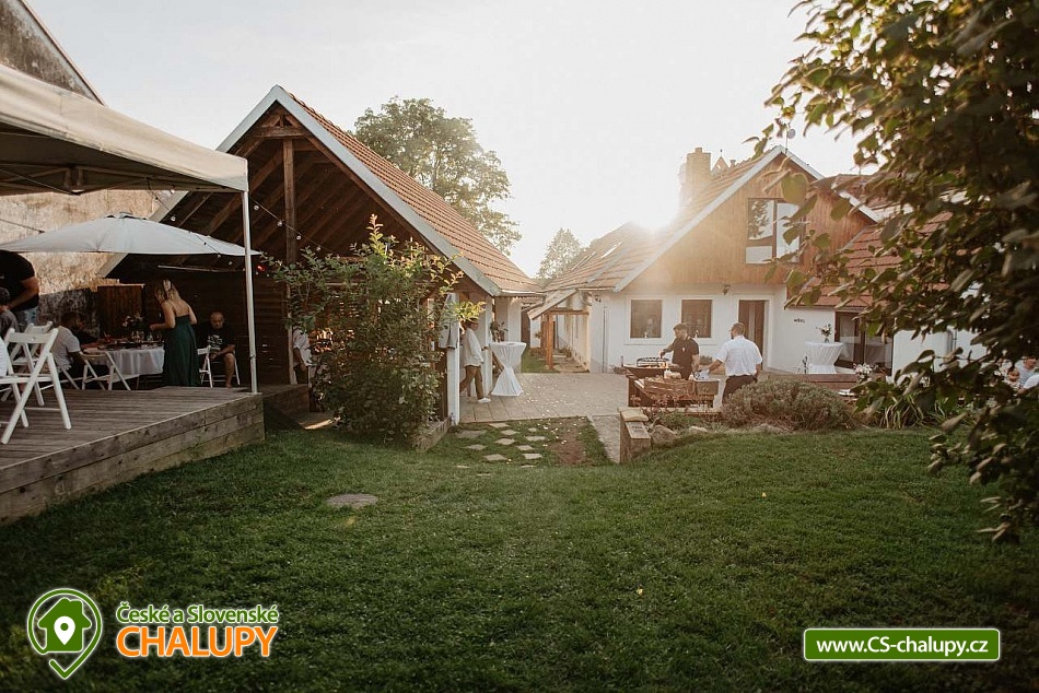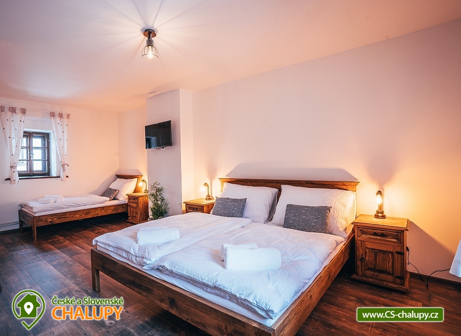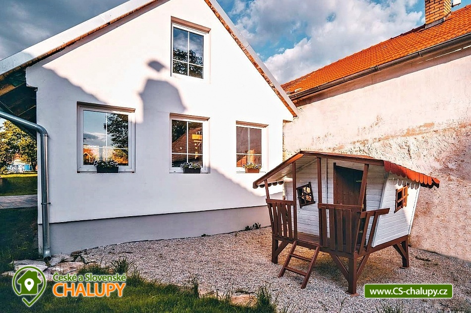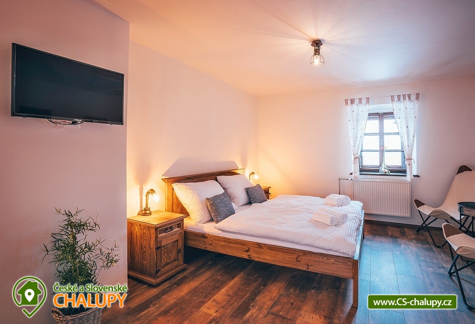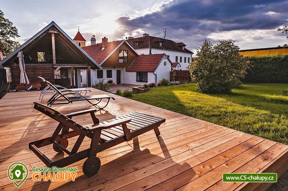 Jihočeská chalupa s wellness se nachází nedaleko turisticky oblíbeného města Český Krumlov (10 km) v malebné jihočeské obci Černice. Těšit se můžete na komfortní ubytování v sedmi pokojích s vlastní koupelnou a WC, dále na velkou společenskou místnost s krbovými kamny, kuchyní a jídelnou, knihovnu a wellness. Chalupa je ideální pro rodinnou pohodu, odpočinek s přáteli, setkání s kolegy nebo také po domluvě pro konání svateb. Chalupa nabízí ubytování pro až 20 osob v 7 pokojích, celkem je k dispozici 20 pevných lůžek. V přízemí se nachází jeden třílůžkový pokoj (manželská postel + jednolůžko) s velkou vanou a tmavým nábytkem a jeden čtyřlůžkový pokoj (2x manželská postel) - vejminek s vlastním vstupem ze dvora chalupy. V patře chalupy je umístěno dalších pět pokojů. První pokoj je třílůžkový (manželská postel a jednolůžko). Druhý pokoj je dvoulůžkový (2x jednolůžková postel) s dvěma přistýlkami řešenými rozkládací postelí. Další tři pokoje jsou dvoulůžkové (manželská postel). Nejhezčí je „svatební apartmán“ s volně stojící vanou, výhledem do zahrady a stylovým spaním na posteli z trámů. K zapůjčení je dětská postýlka a jídelní židlička. Společné chvíle lze trávit v přízemí ve společenské místnosti s krbovými kamny, sedací soupravou, TV, jídelním sezením a společenskými hrami. Dále je k dispozici plně vybavená kuchyň (elektrická trouba, keramická varná deska, mikrovlnná trouba, rychlovarná konvice, lednička, mraznička, kávovar, myčka nádobí, jídelní sezení a topinkovač). V přízemí se také nachází wellness se saunou a vířivkou a vlastním vchodem. V patře pro chvíle odpočinku slouží prostorná knihovna s gaučem. V celém objektu je k dispozici WIFI připojení na internet. Sociální zařízení zahrnuje v každém pokoji jednu koupelnu s WC, sprchovým koutem nebo vanou. Vytápění je řešeno elektrokotlem a krbovými kamny ve společenské místnosti. Venku lze volné chvíle trávit na uzavřeném dvoře a krásnou prostornou stodolou s barem, posezením a grilem. Děti se mohou na zahradě těšit na malou kouzelnou chaloupku a dětské hřiště s klouzačkou a pískovištěm. Zahrát si můžete šipky nebo stolní tenis. Parkovat lze přímo u objektu. V okolí chalupy možnost turistiky, cykloturistiky, koupání, rybaření, houbaření a lyžování. V blízkosti jsou tenisové kurty a golfové hřiště. Mezi možnosti koupání patří např.: rybník Štilec, požární nádrž koupaliště Třísov, bazén Český Krumlov, koupaliště Velešín, koupaliště Holubov, koupaliště Větřní, České Budějovice - plavecký stadion, koupaliště České Budějovice. K výletům v okolí láká Český Krumlov – zámek, Minoritský klášter, Hradní muzeum, Muzeum tortury, Muzeum marionet či Muzeum voskových figurín, dále zřícenina Dívčí Kámen, typická jihočeská vesnice Holašovice, Římovská přehrada nebo přehrada Lipno. V zimě oceníte blízké lyžařské středisko Ski areál Kramolín, Věžovaté pláně nebo rybník Olšina. Těšíme se na Vás u nás.