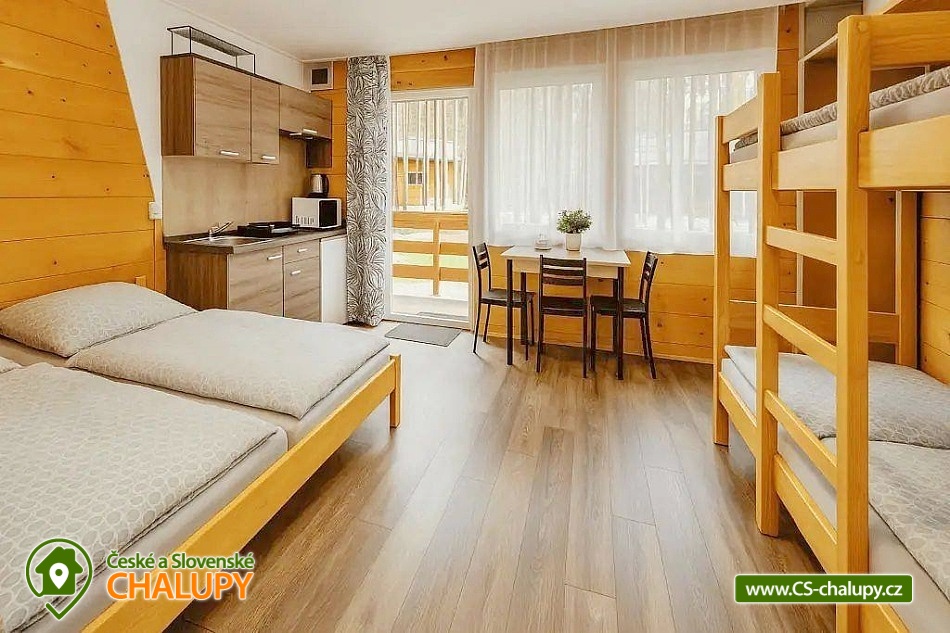 Kemp chaty u Máchova jezera se nachází v krásné přírodě oblasti Kokořínsko a Máchův kraj. Ubytování v chatkách v borovicovém lese je ideální pro páry, rodiny i skupiny přátel. Kemp s 18 chatkami s celkovou kapacitou 73 osob nabízí dvoulůžkové chaty, třílůžkové, čtyřlůžkové a šestilůžkové. Většina chatek (kromě 2-lůžkových) má kuchyňský kout s elektrickým vařičem, mikrovlnnou troubou, rychlovarnou konvicí, lednicí a jídelním sezením, a také vlastní sociální zařízení (sprchový kout, toaleta, umyvadlo). V 2-lůžkových chatkách je k dispozici pouze základní vybavení s postelemi, ale hostům slouží společné koupelny a toalety v areálu rozdělené na dámské a pánské sprchy a toalety. Každá chatka je vybavena vlastní terasou se sezením a bezplatným WiFi připojením k internetu. V areálu se nachází dětské hřiště (pískoviště, houpačky, prolézačky, skluzavka, trampolína), což potěší zejména rodiny s malými dětmi. Pro sportovně založené hosty je připraveno basketbalové a volejbalové hřiště. Parkování je zajištěno pro hosty každé chatky. Kemp se nachází jen několik minut chůze od břehů Máchova jezera. Toto oblíbené letovisko nabízí širokou škálu aktivit - od koupání na písečných plážích přes projížďky na šlapadlech a lodích až po vodní sporty, cykloturistiku či pěší túry v okolních borových lesích. Pro milovníky kultury a společenského života je v sezóně připraven bohatý program v podobě koncertů, festivalů, sportovních akcí i zábavy pro děti. Rybáři si svůj oběd mohou ulovit ve vodách Nového rybníka, který je zarybněn kaprovitými a lososovitými rybami. Milovníci přírody mohou navštívit Národní přírodní památku Swamp. V blízkém okolí naleznete tenisové kurty, minigolfové hřiště i Aquapark Staré Splavy. Tipy na výlety: muzeum Čtyřlístek, muzeum Karla Hynka Máchy, městské muzeum Mimoň, zámek Doksy, skalní hrad Jestřebí, hrad Bezděz, zámek Nový Berštejn, hrad Houska, ZOO Ralsko. Krásné výhledy na okolní přírodu se Vám naskytnou z rozhledny Josefská vyhlídka. Těšíme se na Vás u nás.