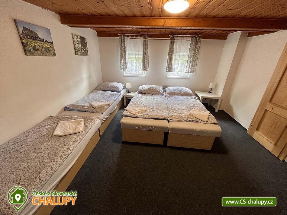 Rodinná chalupa Jizerky u Rozhledny Štěpánka na rozhraní Jizerských hor a Krkonoš. Chalupa má kapacitu až 28 osob (24 lůžek + 4 přistýlky) - 4 čtyřlůžkové pokoje, 3 dvoulůžkové pokoje a 1 apartmán s vlastní kuchyňkou. Chalupa nabízí plně vybavenou kuchyň včetně myčky nádobí. Chalupa má prostornou společenskou místnost s TV, sedačkou a dětským koutkem. Vítány jsou rodiny s dětmi, pro které máme připravený dětský vnitřní koutek nebo venkovní pískoviště s posezením. Za chalupou je terasa s posezením a možností grilování a opékání buřtů. Ubytování je vhodné také pro cyklisty, lyžaře a běžkaře, pro které chalupa nabízí možnost uschování kol v kolárně/lyžárně. POPIS: 4 x čtyřlůžkový pokoje (do 2 čtyřlůžkových pokojů je možné přidat 1 přistýlku), 3 x dvoulůžkový pokoj (do 1 dvoulůžkového pokoje je možno přidat přistýlku) a 1x čtyřlůžkový apartmán (1x manželská postel a 1x rozkládací pohovka - spíše pro 1 dospělou osobu, případně 2 děti). K zapůjčení 2x cestovní postýlka s matrací, polštářkem, peřinkou a povlečením). Sociální zařízení je na každém pokoji (sprchový kout + WC). Kuchyň s myčkou nádobí, troubou, plynovým sporákem, mikrovlnnou troubou, toustovačem, topinkovačem, rychlovarnou konvicí a veškerým kuchyňským vybavením. K zapůjčení 2x WC sedátko pro děti. Vytápění - Elektrické topení na každém pokoji. Parkování u objektu. Stravování vlastní v plně vybavené kuchyni, popř. možnost zajištění polopenze v nedalekém penzionu (nutná rezervace minimálně 3 dny předem). V okolí je nespočet možných letních i zimních výletů např.: Rozhledna Štěpánka, Protržená přehrada, Rozhledna Královka, Rozhledna Tanvaldský Špičák, Jizerka, Muzeum ozubnicové dráhy, Mumlavské vodopády a Harrachov. Lyžařská střediska Černá Říčka, areál U Čápa (Příchovice), areál Rejdice a areál Paseky nad Jizerou. Těšíme se na Vás u nás.