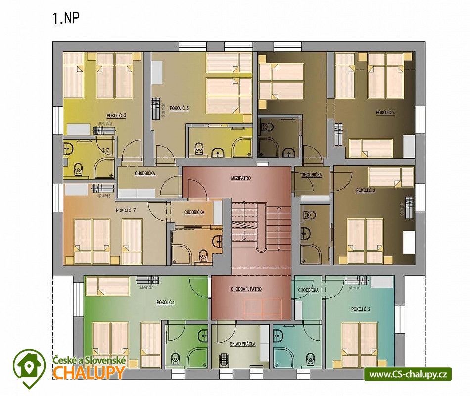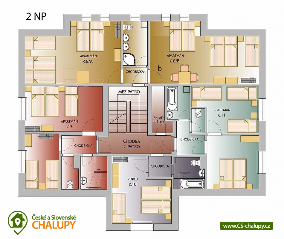 - 14 ložnic: 3x 5, 8x 3, 3x 2