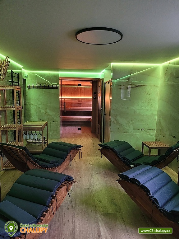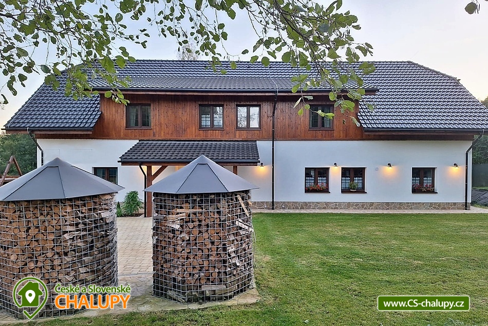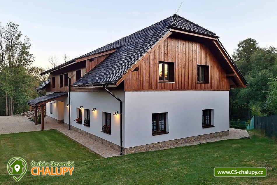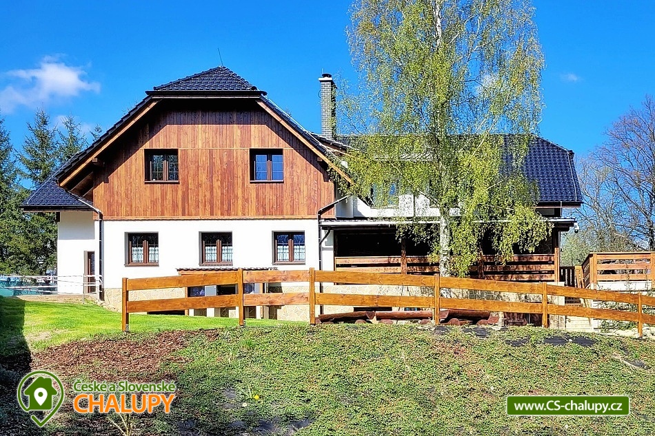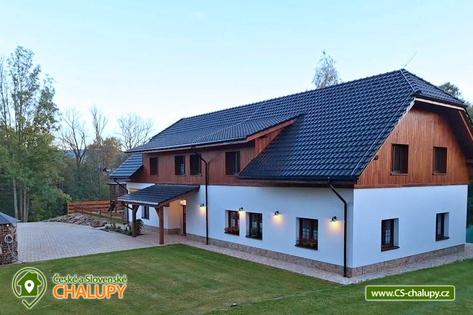 Rodinná wellness chalupa s bazénem se nachází v obci Červený Potok u města Králíky, nedaleko střediska Dolní Morava s adrenalinovými atrakcemi jako je bobová dráha, Dětský park Amálka, Mamutí horská dráha a Stezka v oblacích. V blízkém okolí potěší spousta turistických tras vedoucích krásnou přírodou Orlických hor a okolím majestátního Králického Sněžníku. Stylově zařízená chalupa nabízí ubytování pro 27 osob v devíti ložnicích. Pobyt je ideální také pro teambuildingy a oslavy. Celkem jsou k dispozici čtyři dvoulůžkové ložnice (2x manželská postel a 2x dvě jednolůžka), tři třílůžkové ložnice (3x manželská postel a jednolůžko), dvě čtyřlůžkové ložnice (2x manželská postel a dvě jednolůžka) a dvě přistýlky řešené rozkládací postelí. K zapůjčení jsou dvě dětské postýlky. Všechny ložnice jsou útulné, prakticky vybavené a poskytují dostatek úložného prostoru pro pohodlí hostů. Příjemné chvíle lze trávit ve společenské místnosti s krbovými kamny, sedací soupravou, jídelnou s masivními lavicemi a TV. Pro chvíle zábavy slouží billiard a PartyBox JBL. K dispozici je také výčepní zařízení. Na obývací část navazuje plně vybavená kuchyň (dvě velké lednice, prostorný mrazák, dvě horkovzdušné trouby a indukční varné desky, myčka nádobí, kávovar, rychlovarná konvice, kontaktní gril, výrobník ledu a kompletní sada nádobí). Děti ocení prostorný dětský koutek s televizí, pestrou paletou hraček, stavebnic, sedacích vaků a herní konzolí PlayStation 5. Sociální zařízení zahrnuje celkem čtyři koupelny, jednu v přízemí a tři v patře. Všechny jsou vybaveny sprchovým koutem, WC, umyvadly a fénem. Nechybí jedinečné designové prvky, koupelnová kosmetika, ručníky a osušky. K dispozici je také pračka, žehlička, žehlící prkno a sušák na prádlo. Vytápění je řešeno krbovými kamny, podlahovým topením, elektrickým topením a tepelným čerpadlem. Ke chvílím odpočinku slouží wellness zóna s prostornou vnitřní saunou až pro 12 osob (dřevěný design, tlumené osvětlení), doplněná o aromaterapii a ozvučení pro vlastní hudbu. Po saunování lze relaxovat v komfortní odpočívárně s lehátky. Celoročně je také součástí relaxační zóny venkovní zastřešená vířivka pro 5 osob s hydromasážními tryskami a LED osvětlením, umístěná v zahradě s výhledem. Při zakoupení wellness lze využívat další sprchu a samostatnou toaletu. Zdarma jsou k dispozici prostěradla k saunování. Pro větší bezpečnost a komfort je wellness vybaveno speciálním nerozbitným nádobím s elegantním designem. V celém objektu je k dispozici WIFI připojení na internet. Součástí chalupy je také úschovna pro kola, lyže a snowboardy. Kolem chalupy se rozléhá prostorný oplocený pozemek (3 000 m²) nabízející spoustu možností zábavy pro hosty všech věkových kategorií. Posedět lze na zastřešené terase s venkovním krbem. K dispozici je gril a ohniště. Od jara do podzimu je možné si užívat venkovní vyhřívaný bazén se zastřešením. U bazénu jsou připravená pohodlná lehátka. Děti potěší moderní hřiště s houpačkami, pískovištěm a skluzavkou. Na prostorné travnaté ploše si lze zahrát také fotbal nebo volejbal. U objektu je k dispozici 10 parkovacích míst. Pro ochranu hostů a jejich majetku je celá chalupa zajištěna kamerovým a bezpečnostním systémem. V okolí objektu možnost turistiky, cykloturistiky, koupání, houbaření, lyžování a běžkování. V blízkosti jsou také tenisové kurty a bowling. Mezi možnosti koupání patří např.: Koupaliště Králíky, Hynčice pod Sušinou - rybník Úžas, Koupaliště Mezilesí, Koupaliště Ruda nad Moravou, Štíty - Acrobat Park, Přehrada Pastviny atd. K dispozici jsou blízká lyžařská střediska: Dolní Morava - Větrný vrch, Malá Morava - Vysoká, Šanov, Hynčice - Kraličák a další. K výletům v okolí láká Muzeum celnictví a Vojenské muzeum v obci Králíky, blízké poutní místo Hora Matky Boží Králíky, nejdelší vysutý most pro pěší na světě SKY BRIDGE, Velké Losiny - Termály, zámek a Ruční papírna nebo Pivovarské muzeum Hanušovice. Těšíme se na Vás u nás.