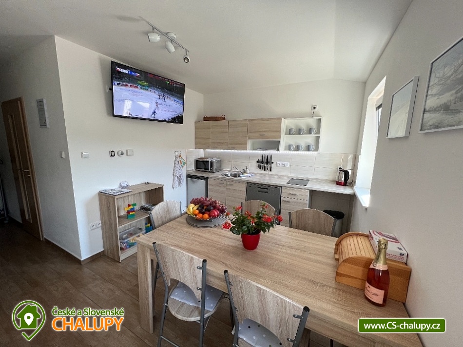 Rodinný penzion Kralický Sněžník a Rychlebské hory s bazénem na zahradě, lokalita Staré Město, obec Kunčice. Kde strávit dovolenou? No přeci u nás - Rodinný penzion sestává ze tří apartmánů pro celkem 18 osob (apartmány pro 8, 5 a 5 osob). Vyberte si apartmán, který nejlépe vyhovuje vaší chuti a rozpočtu. Apartmán M1 - s krásným výhledem na lyžařský areál „SKITECH“, je určený pro větší partu kamarádů nebo dvě rodiny, které chtějí spolu sdílet dovolenou. Je umístněný v přízemí domu. Má chodbu s lyžárnou; samostatné WC; koupelna - 2x sprchový kout, 2x umyvadlo, WC; kuchyň s jídelnou a společenskou místností; 1x ložnice A s postelí (90x200) a dvoulůžkem (160x200); 1x dětský pokoj s palandou (90x200) a postelí (90x200); 1x ložnice B s dvoulůžkem (160x200). Apartmán M2 i M3 se nachází v 1. podlaží domu a každý tento apartmán a je vybaven vstupní halou se schodištěm a lyžárnou; sociální zařízení - 1x sprchový kout, 1x umyvadlo, WC; kuchyň s jídelnou; 1x ložnice A s postelí (90x200) a dvoulůžkem (160x200); 1x ložnice B s dvoulůžkem (140x200). Zahrada je oplocená, pro děti houpačky, skluzavka. K dispozici zastřešené sezení s grilem, ohništěm a krbem. Obec Kunčice se nachází v Olomouckém kraji, okres Šumperk. Leží severně od Starého Města pod Sněžníkem ve vzdálenosti cca 3 km. Je to malebné údolí mezi oblastí Kralického Sněžníku a Rychlebských hor. V blízkosti doporučujeme navštívit velkou zajímavost: přečerpávací vodní elektrárnu Dlouhé stráně, jež je jedním z divů. Jedná se o nejvýkonnější vodní elektrárnu v Česku uvnitř chráněné krajinné oblasti. Dominantou Staroměstska je Kralický Sněžník (1424 m), na jehož vrcholu kdysi stávala rozhledna. Pramení zde řeka Morava. Blízká lyžařská střediska v okolí: Skitech Kunčice, Stříbrnice - Skiareál Kraličák, , Paprsek, Branná. Zajímavosti: Dolní Morava Sky Bridge 721, visutý most, Stezka v oblacích , Mamutí horská dráha, Stříbrnice- rozhledna Štvanice, Trail X Enduro Park, Paddlebordy na rybníku Úžas, Větrov - Dalimilova rozhledna - replika rozhledny z Králického Sněžníku, Jeseník - Priessnitzovy lázně- malebné procházky po areálu s vodoléčebnými prameny k dispozici. Lázně Velké Losiny - termální koupaliště, renesanční zámek, čokoládovna a ruční papírna a Praděd.