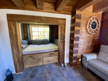Novostavba roubenky Kamennka s koupacím jezírkem se nachází u lesa na kraji malebné obce Kamenná Lhota u Borotína, je ideální pro rodinnou dovolenou, a to jak v aktivním, tak relaxačním stylu. Zahradě dominuje koupací jezírko se slanou vodou, které je ideální pro celodenní dovádění, ale i otužování či noční koupání. Základní ubytovací kapacita je 14 osob ve čtyřech ložnicích s využitím dvoulůžka ve výklenku obývacího pokoje - se všemi lůžkovinami a ručníky k dispozici. Maximální ubytovací kapacita 22 osob je při využití rozkládacího dvoulůžka (včetně lůžkovin a ručníků) ve 2 lůžkovém pokoji se samostatnou koupelnou a dalším využití třech dvoulůžkových matrací na půdě s množstvím polštářů a příjemných dek na přikrytí (bez standardních lůžkovin), ručníky jsou k dispozici. Tato varianta je možná pouze po předchozí domluvě. Pro vaše nejmenší jsou dále k dispozici 2 dětské rozkládací postýlky. Vnitřnímu prostoru dominují kachlová kamna s krbem a plotnou, která jistě přispějí k příjemné atmosféře společenského života uvnitř roubenky. V obývacím pokoji je dvoulůžko ve výklenku oddělené roletou, pohodlná kožená sedací souprava, velkoplošná televize. Na druhé straně se nachází jídelna. Kuchyň je plně vybavená s americkou lednicí s mrazákem a výrobníkem ledu, pečící troubou, indukční varná deskou, myčkou na nádobí, mikrovlnkou, kávovarem na mletou kávu, rychlovarná konvicí na vodu, topinkovačem, toustovačem, ručním mixerem a šlehačem a kompletním jídelním vybavením, nádobím a nástroji pro přípravu jídel. V patře se nachází 4 ložnice: 2x 4-lůžkový pokoj (každý se dvěma podkrovními postelemi pro 2 osoby), 1x 2-lůžkový pokoj s vlastní koupelnou (manželská postel a případně přistýlka - rozkládací pohovka pro 2 osoby), 1x 2-lůžkový pokoj s podkrovní postelí pro 2 osoby. Herna v suterénu je místem pro aktivity zejména v deštivém počasí, kde můžete hrát, stolní tenis, elektronické šipky, nebo se naopak přesunete s dětmi na půdu, kde je zázemí pro klidné sledování filmů, ale i jiné hry a lumpárny jako "polštářová válka", "nerfková střílečka" a podobně. Suterén zároveň slouží pro uložení kol a v zimě lyží či snowboardů, ale i saní a pekáčů a jiného náčiní a sportovního vybavení pro hry na zahradě jako jsou fotbalové branky, síť na míčové sporty, míče, rakety, slaměný terč s lukem a šípy, elektrické šipky. V roubence Kamennce jsou celkem 4 koupelny. Jedna v přízemí se dvěma umyvadly a osvětlenou sprchou a WC, 2. je v patře s jedním umyvadlem, vanou a WC, 3. je součástí jedné z ložnic. 4. koupelna se nachází v herně v suterénu, kam je přístup pouze z venku. V každé koupelně je k dispozici vysoušeč vlasů. Roubenka má elektrické podlahové vytápění v přízemí i patře s ložnicemi. Přitápí se kachlovými kamny v krbu nebo pod plotnou. V suterénu naleznete elektrický sušák na boty. Z roubenky vstoupíte přímo na zastřešenou terasu s venkovní kuchyní a lednicí, pohodlným i barovým posezením, grilem. Z trasy se dostanete na travnatou plochu zahrady a nebo skočíte přímo do jezírka. To si můžete v noci rozsvítit a zaplavat si i při měsíčku. Nebo dále do finské sauny a vířivky. Ohniště s posezením tvoří další kout zahrady. Naleznete zde také trampolínu. Vydáte-li se do okolí pěšky nebo na kole, budete poznávat krásnou přírodu jižních Čech - lesy plné hub, rybníky i lesní jezírka. Borotín je malebnou vesnicí - na romantické zřícenině zámku Borotín se natáčela pohádka Honza málem králem. Najdete zde i kozí farmu. V zimě potom můžete navštívit blízký areál Monínec (9 km), který je ideální pro výuku začínajících lyžařů nebo vyrazit na běžky po okolí. Určitě se nebudete nudit a věříme, že přijedete znova, protože nemůžete stihnout vše za jeden pobyt. Hned na zahradě nasednete na kolo a za Roubenkou nastoupíte na cyklostezku 1059a, která je součástí borotínského mikroregionu „Čertovo břemeno“ a navazuje na mezinárodní dálkovou cyklotrasu č.11 Greenways Praha – Vídeň. Další výlety: Muzeum veteránů, Chotoviny (8 km), Adrenalinový park Monínec (9 km), ZOO Větrovy u Tábora (16 km), Kozí hrádek – národní památka a zřícenina, Sezimovo Ústí (18 km), Muzeum loutek, Mladá Vožice (18 km) a Chýnovská jeskyně, Chýnov (25 km). Těšíme se na vás u nás!