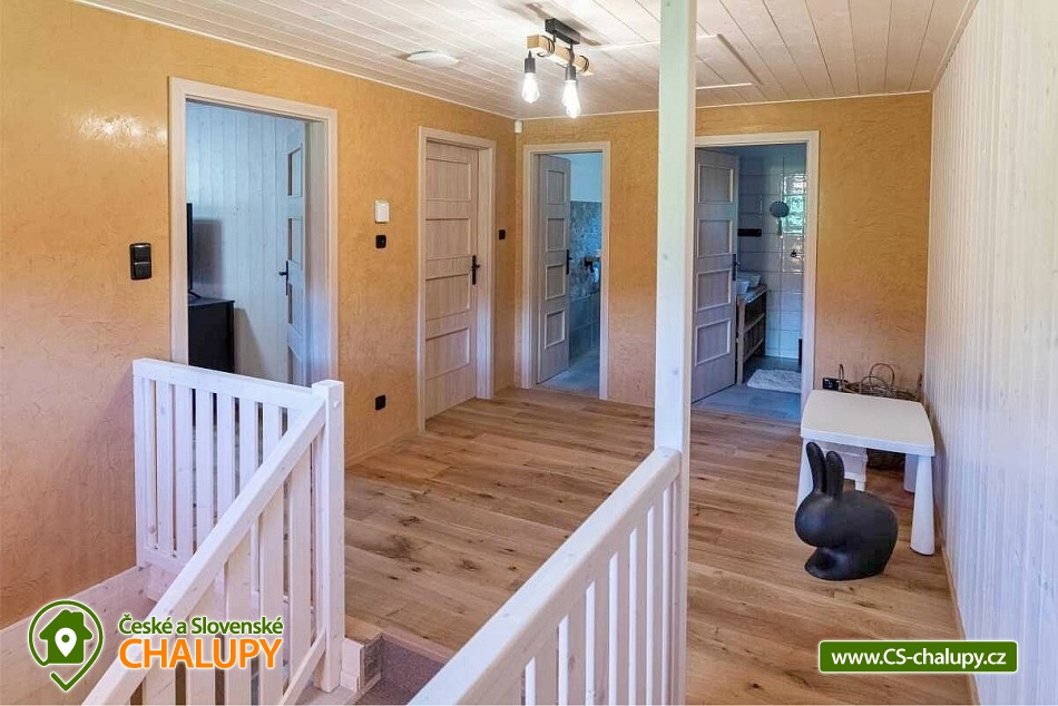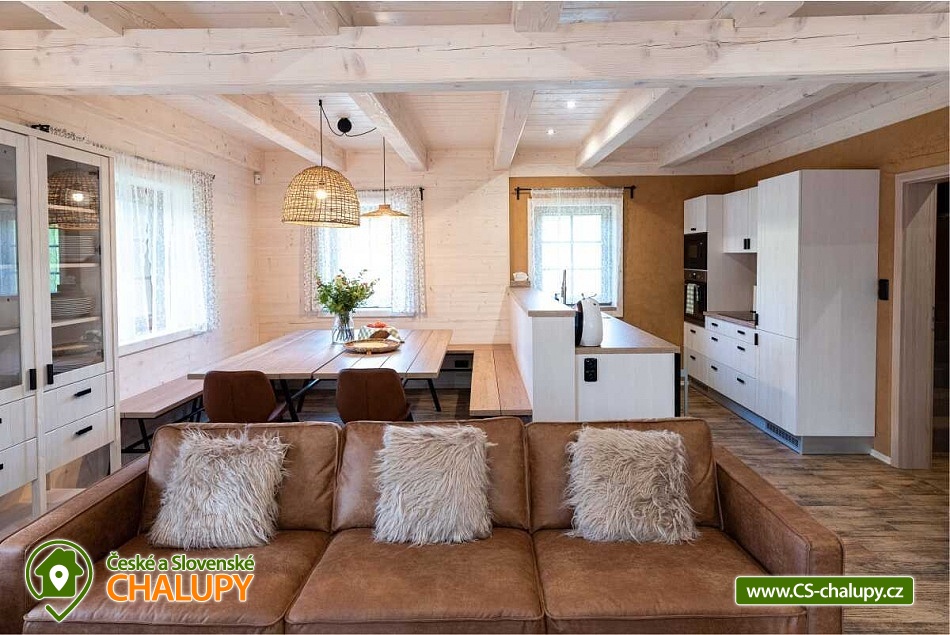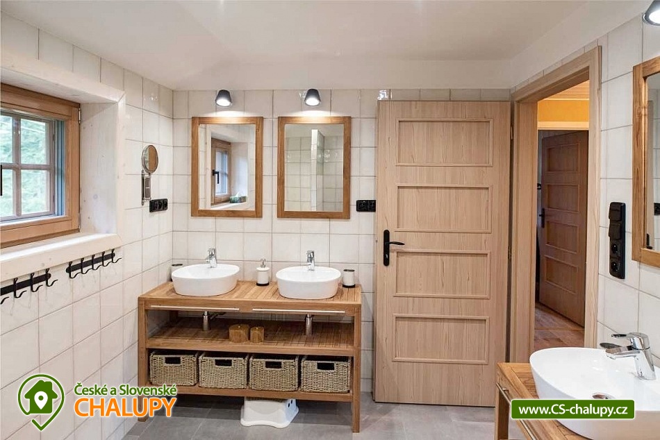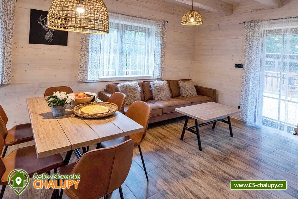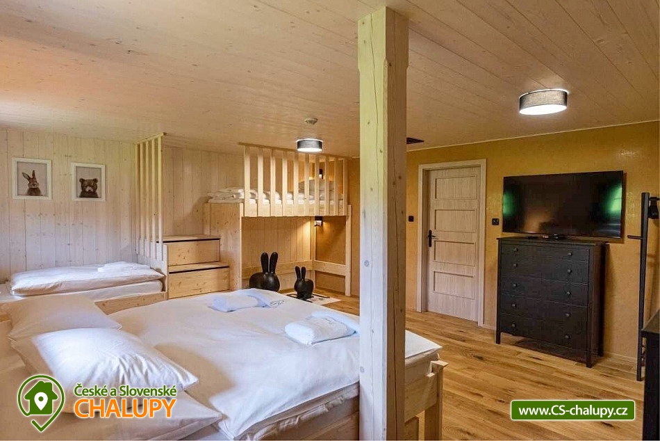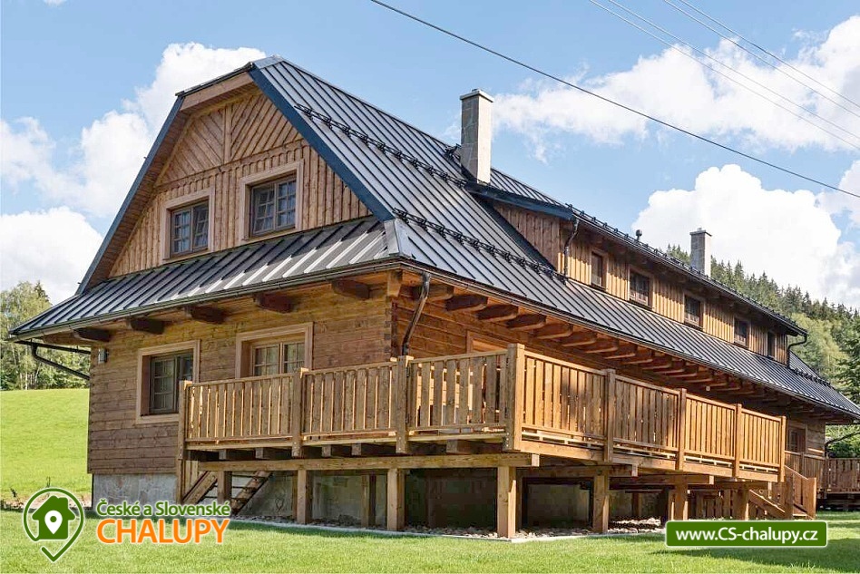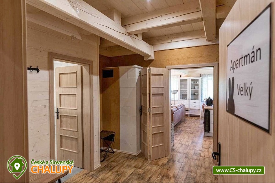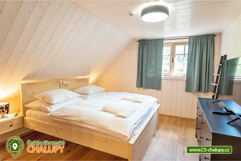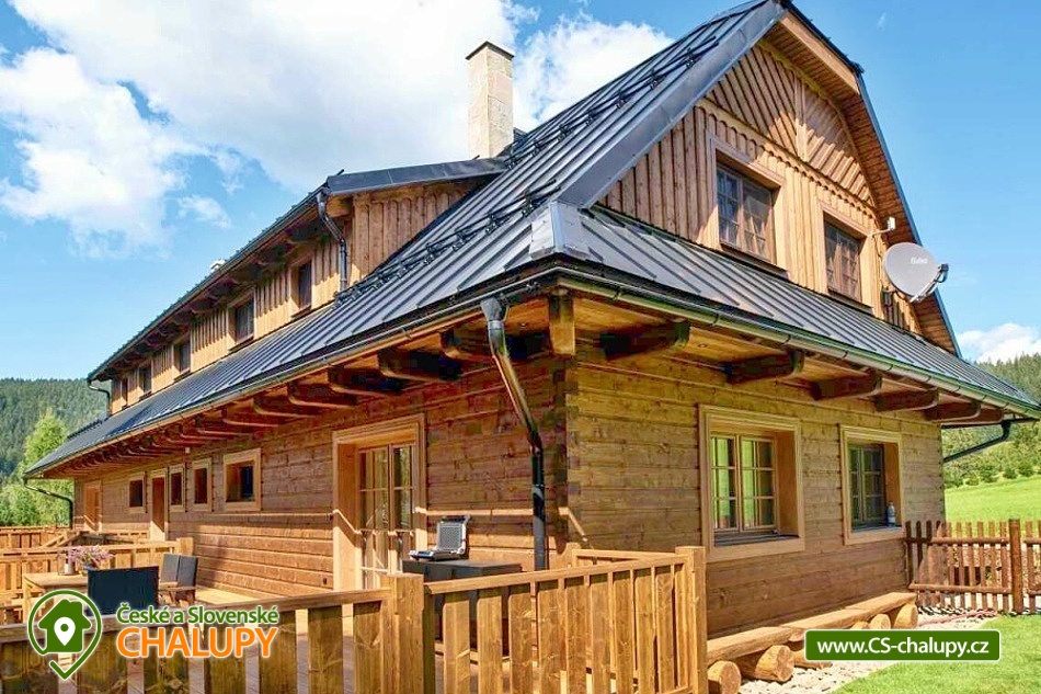 Roubená chalupa s finskou saunou v Beskydech u Vsetínské Bečvy je obklopena nádhernými loukami a lesy. Okolí je vyhledávané díky nádherné horské krajině a spousty možnostem pro lyžování, turistiku, cykloturistiku a koupání. Chalupa s výhledem na pasoucí srny a vrcholky kopců zalité sluncem nabízí relax ve finské sauně s vůni dřeva. Můžete se podívat také na naše dvě další chalupy v okolí (3M-207 a 3M-208). Stylová chalupa nabízí ubytování pro až 20 osob ve dvou samostatně pronajímaných apartmánech s vlastní kuchyní, koupelnou s WC, terasou a grilovací kotou. Do apartmánů se vstupuje přes společnou chodbu v zádveří, kde je také vstup do společné prádelny se zadním východem na terasu a zahradu a do technické místnosti. Popis: MALÝ APARTMÁN má kapacitu pro 6 osob. V patře jsou umístěné 2 samostatné ložnice s manželskou postelí (180×200 cm) a s TV. V přízemí v obývací místnosti jsou k dispozici další dvě přistýlky umístěné u kamen. Dále je součástí místnosti TV, sedací souprava, jídelní stůl, kuchyň a vstup na terasu. VELKÝ APARTMÁN má kapacitu pro 14 osob. V patře apartmánu jsou umístěné 3 ložnice. První dvě jsou čtyřlůžkové a mají k dispozici manželskou postel (180×200 cm) a dvě přistýlky řešené dvoulůžkem (160×200 cm). Třetí ložnice je šestilůžková a krom manželské postele (180x200 cm) má k dispozici dvě pevná lůžka (90×200 cm) z toho jedno je palandové a dvě přistýlky též řešené dvoulůžkem (160×200 cm). V přízemí je prostorný obývací pokoj s kachlovými kamny, sedací soupravou, velikým jídelním stolem, kuchyň a vstup na terasu. Do obou apartmánů se vstupuje přes zádveří, kde lze odložit své oblečení. Součástí apartmánů je plně vybavená kuchyň - lednice s mrazákem, myčka na nádobí, indukční varná deska, trouba s parním čištěním, mikrovlnná trouba, integrovaná malá vinotéka, kávovar Nespresso, varná konvice, toustovač, mixér, ruční mixér, atd. V obou apartmánech je k dispozici WIFI připojení na internet. Sociální zařízení zahrnuje v Malém apartmánu jednu koupelnu se sprchovým koutem a WC v přízemí a druhou koupelnu v patře s malou vanou a sprchovým koutem a jedno samostatné WC. Velký apartmán má k dispozici 3 koupelny. V přízemí jednu koupelnu se sprchovým koutem a WC. V patře jednu společnou koupelnu s velkou vanou, sprchovým koutem a samostatným WC a druhou samostatnou koupelnu patřící ke třetí ložnici se sprchovým koutem a WC. Vytápění je řešeno kachlovými kamny na dřevo, ve velkém apartmánu se vzduchovým rozvodem. Koupelny a přízemí jsou vytápěny elektrickými podlahovými rošty, v ložnicích jsou k dispozici pro přitápění sálavé infra radiátory. Ve všech oknech jsou sítě proti hmyzu v ložnicích a obývacích pokojích kouřové hlásiče. Oba apartmány jsou oplocené a mají k dispozici terasu s dřevěným posezením a malý grilovací domeček a ohniště s posezením. Každý apartmán má vlastní úschovnu pro uchovávání kol, lyží, kočárků a dalších potřebných věcí. Vstupy do těchto místností jsou před hlavním vchodem do budovy po levé a pravé straně. Pro děti je na zahradě připravené velké, společné, dětské hřiště s klouzačkami a houpačkami. Pro všechny ubytované je také k dispozici společná, pravá finská sauna Kota na dřevo s mnohaletou tradicí. Parkovat lze přímo u objektu. Malý apartmán má k dispozici stání pro 2 auta a velký apartmán pro 4 auta. K chalupě je příjezd do většího břehu, proto je v zimním období vhodná výbava sněhovými řetězy. Pozemek je ze zadní strany zabezpečen oplocením z důvodu velkého srázu. V okolí chalupy možnost turistiky, cykloturistiky, koupání, houbaření, běžkování, in -line bruslení a lyžování. V blízkosti jsou také tenisové kurty a golfové hřiště. Mezi možnosti koupání patří např.: koupaliště Velké Karlovice, Vodní svět Velké Karlovice, bazén Velké Karlovice, přehrada Horní Bečva, koupaliště Balaton, koupaliště biotop Bečva, koupaliště Hutisko-Solanec, koupaliště Vigantice, koupaliště Rožnov pod Radhoštěm, bazén Rožnov pod Radhoštěm, atd. V zimním období jsou k dispozici blízká lyžařská střediska: Velké Karlovice - Machůzky, Razula, Velké Karlovice - Bambucha, Synot - Kyčerka, LS zona snow Makov - Kasárne, Soláň - Bzové, Třeštík – Celnica, Karolínka a další. K výletům v okolí láká Valašské muzeum v přírodě - Rožnov pod Radhoštěm, Pustevny s vycházkou na Radhošť, Kopřivnice - muzeum Tatrovky, Čeladná - bobová dráha, ZOO Lešná nebo Valašské Meziříčí. Těšíme se na Vás u nás.