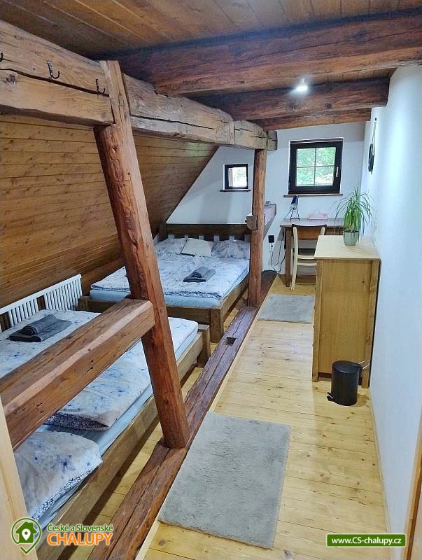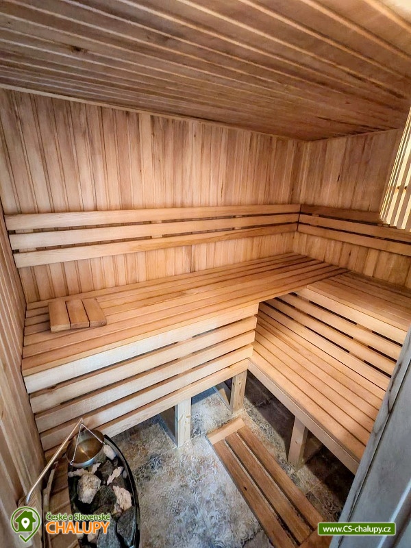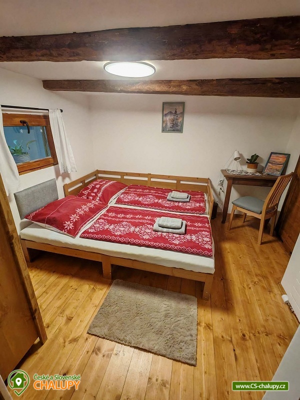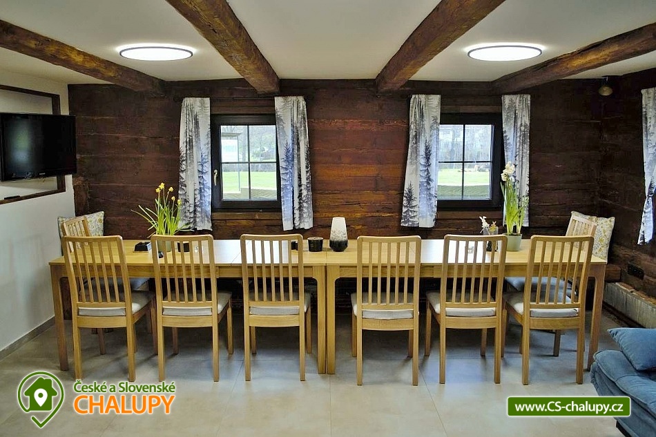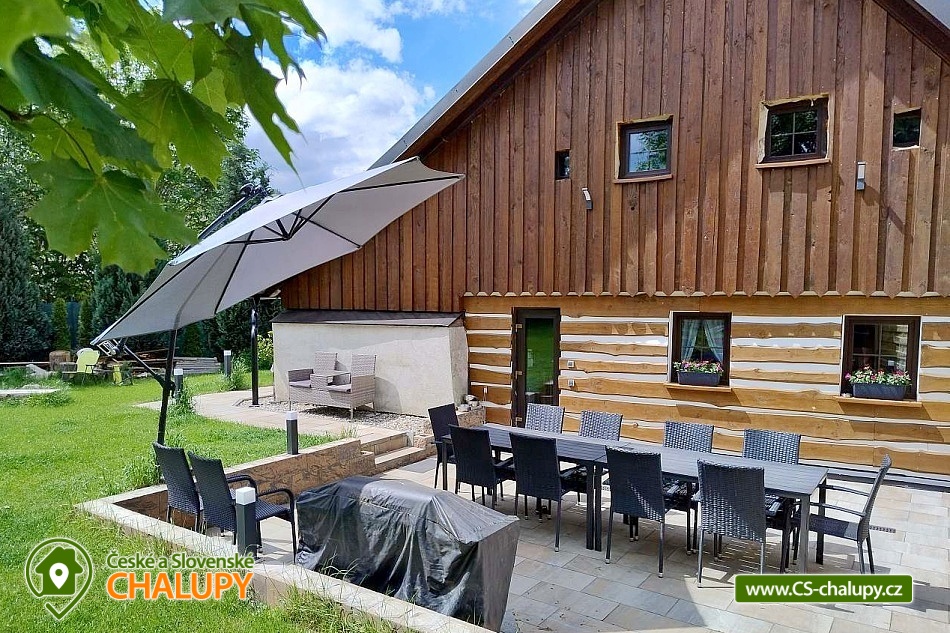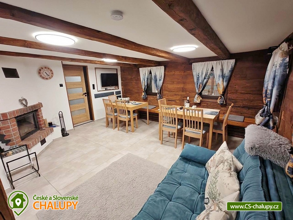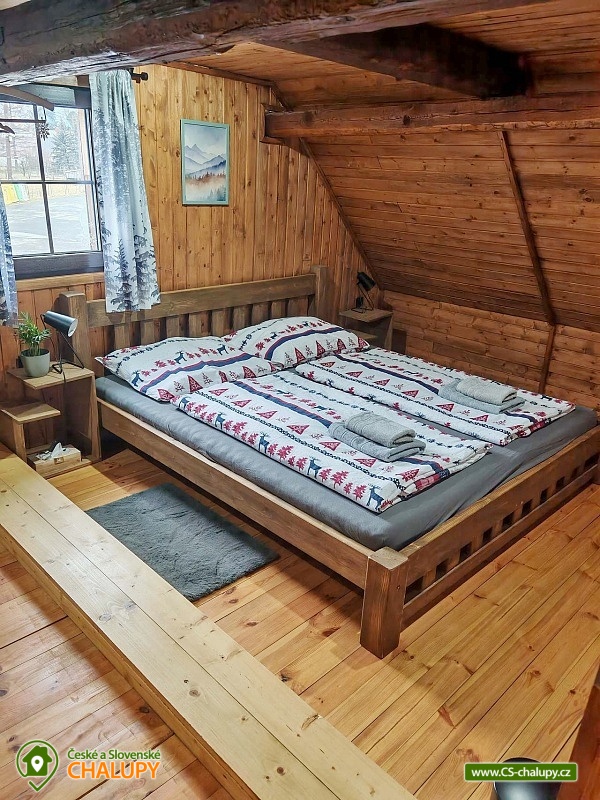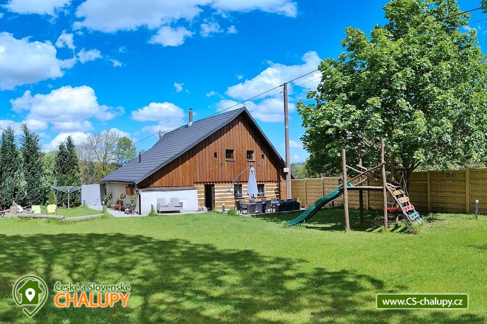 Roubenka se saunou u Rychlebských stezek v Jeseníkách. Během ubytování se můžete těšit na relaxování ve finské sauně s odpočinkovou zónou nebo na posezení na prostorné terase s grilem či na hraní společenských her přímo u krbu. Roubenka nabízí ubytování pro až 15 osob v 5 ložnicích. V přízemí je umístěná 2x dvoulůžková ložnice s rozkládací postelí, která může sloužit jako jednolůžko (90x200) nebo po rozložení jako dvoulůžko s plnohodnotnými matracemi (180x200). Tyto ložnice jsou propojené dveřmi. Součástí jedné z nich jsou také hračky pro děti různých věkových kategorií. Další tři samostatné ložnice jsou umístěné v patře. K dispozici je 2x čtyřlůžková ložnice, jedna s dvěma dvoulůžky (140×200) a druhá s jedním dvoulůžkem (180x200) a dvěma jednolůžky (90x200), a 1x třílůžková ložnice s dvoulůžkem (140x200) a jednolůžkem (90x200) a s přenosnou dětskou postýlkou. Součástí ložnic jsou noční stolky, skříně a u některých ložnic také stůl a křesílka. Pro všechny ubytované jsou k dispozici lůžkoviny, povlečení, ručníky a osušky. Interiér roubenky je velmi útulný a je potřeba v něm zohlednit zachované velmi autentické nízké stropy a průchody. V přízemí se z hlavního vchodu vejde na chodbu, ze které je možné vejít do obývacího pokoje s krbem, posezením pro cca 12 osob, sedací soupravou, TV a Bluetooth repráčkem. Součástí pokoje je plně vybavená velká kuchyň s indukční deskou, lednicí s mrazákem, troubou, kávovarem, příklopným grilem, mikrovlnnou troubou, atd. K dispozici je také sadu hrnců a dva tlakové hrnce, pekáče, misky různých velikostí, vařečky, příbory, talíře, hrnky, sklenice (voda, víno, pivo), džbány, termo konvice i základní koření, olej, ocet, čaj a cukr. Zapůjčit lze výčepní zařízení s chlazením. Dále se v zadní části chalupy nachází relaxační místnost s finskou saunou, sprchou a přístupem na zahradu. Místnost lze v v letním období využít jako další společenskou místnost. K dispozici je zde projektor a plátno. Pro chvíle zábavy v roubence slouží spoustu společenských her pro nejmenší až po zkušené hráče (Krycí jména, šachy, 100+ her do každé domácnosti, KrisKros, karty, kostky atd.) a multifunkční stůl 15 v 1, na kterém je možné hrát např. kulečník, stolní fotbálek, ping - pong, shuffleboard, kuželky a spoustu dalších her. Součástí domu je také úschovna pro kola, lyže, běžky, snowboardy a kočárky. V celém objektu je k dispozici WIFI připojení na internet. Sociální zařízení zahrnuje dvě koupelny s WC. V jedné koupelně je umístěná rohová vana a ve druhé velký sprchový kout s multifunkční sprchou. K dispozici je také koupelnová předsíňka, kde se nachází umyvadlo se skříňkou a zrcadlem. Vytápění je řešeno radiátory s inteligentní thermohlavicí, napojenými na kondenzační kotel, který zajišťuje vytopení celého domu. Dále krbovými kamny s rozvodem teplého vzduchu do koupelen a patra. K dispozici je také elektrický teplovzdušný ventilátor. Venku lze trávit příjemné chvíle na oplocené travnaté zahradě. K dispozici je posezení na terase s grilem nebo u ohniště. Děti ocení dětské hřiště s houpačkou a skluzavkou. K zapůjčení jsou dětská kola, odrážedla a koloběžky. Parkovat lze přímo u objektu. V okolí roubenky možnost turistiky, cykloturistiky, koupání, houbaření, lyžování a běžkování. Přímo v obci také možnost volejbalu, nohejbalu, fotbálku, dětského hřiště venkovního i vnitřního herního světa. V blízkosti jsou také tenisové kurty. Mezi možnosti koupání patří např.: bazén Jeseník - Priessnitz, bazén Domašov - Bělá pod Pradědem, koupaliště Jeseník, bazén Česká Ves, lom Žulová - Brankopy, lom Rampa, lom Žulová, Bazén Karlova Studánka, atd. K dispozici jsou blízká lyžařská střediska: Filipovice, Lyžařský areál Na Smrťáku, Lázeňský vrch, Jeseník - Lázně, Miroslav - Lipová Lázně, Červenohorské sedlo a další. K výletům v okolí lákají Rychlebské stezky, Jeskyně na Pomezí, Praděd, Karlova Studánka, Termální lázně Velké Losiny nebo přečerpávací vodní elektrárna Dlouhé Stráně. Těšíme se na Vás u nás.
