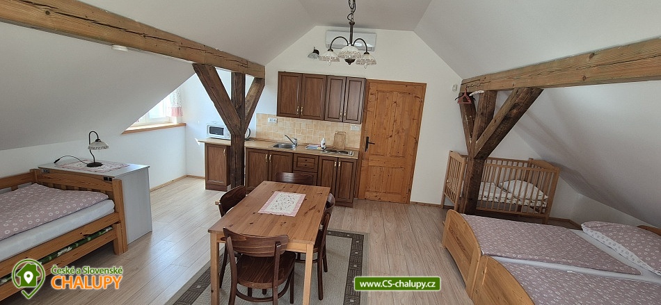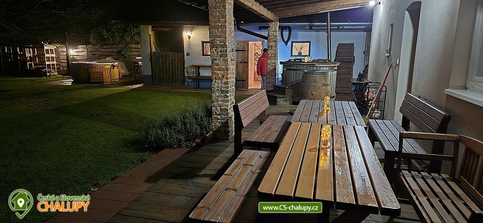 Chalupa a koupací sud - Slovácko. Útulná chalupa s koupacím sudem a terasou se nachází v malebné vesničce Hostějov, v samotném srdci Slovácka. Svou polohou je tak ideálním místem pro zasloužený odpočinek, cyklovýlety a pěší turistiku. Chalupa poskytuje ubytování pro 12 osob v pěti ložnicích. V přízemí objektu se nachází 3x 2-lůžková ložnice, vybavená kuchyň (lednice, mikrovlnná trouba, rychlovarná konvice, kávovar, sporák se sklokeramickou varnou deskou a nádobí) s kachlovými kamny a jídelním posezením, obývací pokoj s rozkládacím gaučem a TV. V podkroví se nachází 2x 3-lůžková ložnice. Každý pokoj má svou vlastní vybavenou kuchyň (lednice, mikrovlnná trouba, rychlovarná konvice, sporák se sklokeramickou varnou deskou a nádobí) a jídelní posezení. V objektu se také nachází posezení s barem. Na vyžádání je možné zapůjčit dětskou postýlku a dětskou jídelní židličku. Sociální zařízení zahrnuje: v přízemí koupelnu se sprchovým koutem se samostatnou toaletou, v podkroví koupelnu se sprchovým koutem, toaletou, dětským přebalovacím pultem a dále samostatná toaleta. Vytápění chalupy je řešeno elektrickým kotlem. V objektu možnost zdarma WI-FI připojení na internet. Chalupu obklopuje oplocená extra velká zahrada s možností parkování přímo u objektu. Součástí zahrady je velká zastřešená terasa, gril, ohniště, přístřešek na kola a velký koupací sud s možností vyhřívání a světelnou terapií, v létě se využívá jako nadzemní bazén. Ti nejmenší jistě ocení pískoviště s hračkami, dětský dřevěný domeček, balanční klády z akátu, trampolínu nebo odrážedlo. V okolí chalupy možnost turistiky, cykloturistiky, koupání, rybaření, houbaření, běžkování a lyžování. Mezi možnosti koupání patří např.: přírodní nádrži v Osvětimanech, koupaliště v Těmicích, koupaliště v Kyjově nebo aguapark v Uherském Hradišti. V zimě jsou výhodou blízká lyžařská střediska např.: Skiareál Osvětimany, Skiareál Stupava a Skiareál Břestek. K výletům v okolí láká: pohoří Chřiby, zřícenina hradu Cimburk, hora sv. Klimenta, hrad Buchlov, zámek Buchlovice, zámek Milotice, Velehrad, archeoskanzen Modrá, Baťův kanál nebo město Uherské Hradiště. V okolních městech a obcích probíhají v průběhu roku různé folklorní akce s návštěvou vinných sklepů. Můžete obdivovat krásu místních krojů, poslechnout si cimbálovky nebo si zatančit a pokoštovat dobré vínečko. Těšíme se na Vás u nás.