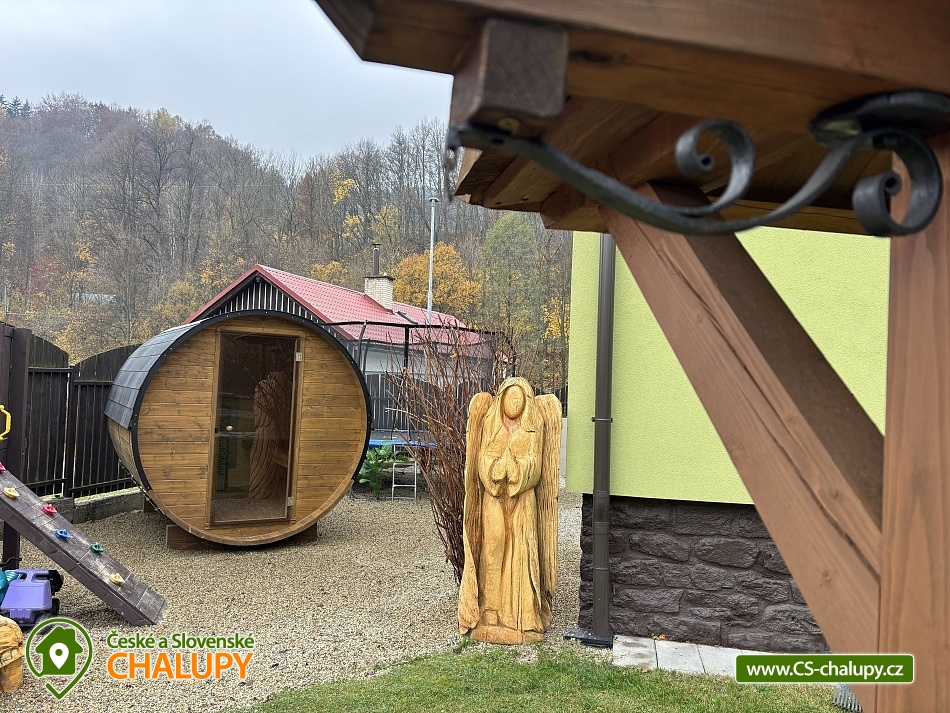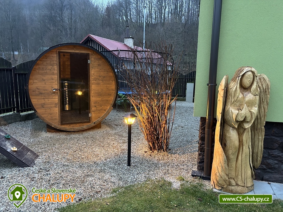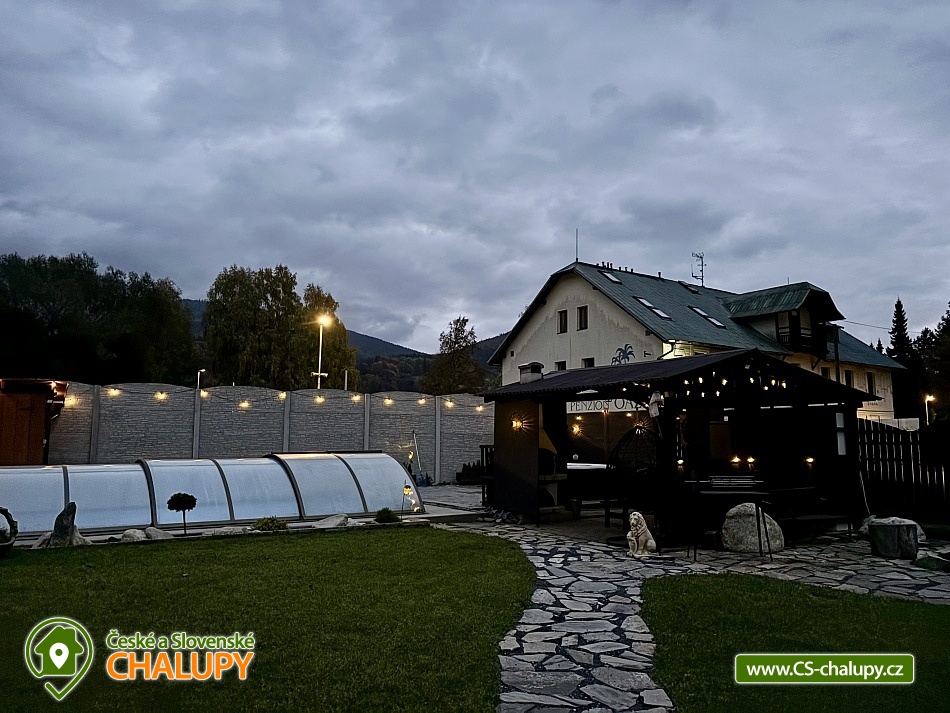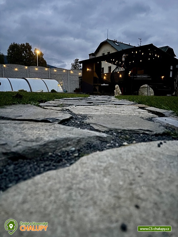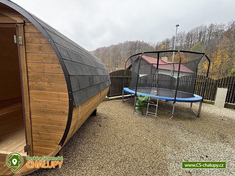 Chalupa bazén a vířivka a sauna - Jeseníky - Šumpersko. Luxusně zařízená chalupa s bazénem, saunou a vířivkou se nachází v klidné části vesničky Rejhotice u obce Loučná nad Desnou v krásné přírodní krajině Hrubého Jeseníku. Loučná a blízké Červenohorské sedlo jsou ideálními výchozími body pro řadu turistických a cyklistických tras. V zimním období výhodou těsná blízkost lyžařských areálů (cca 250 m od chalupy). Chalupa nabízí ubytování pro 13 osob ve 4 ložnicích umístěných v patře. Celkem je k dispozici: dvoulůžková ložnice (2x jednolůžko + dětská postýlka), dvě čtyřlůžkové ložnice (1x dvoulůžko + 1x patrová postel) a třílůžková ložnice (2x jednolůžko + 1x zkrácené lůžko 170 cm vhodné jako přistýlka). V přízemí se nachází obývací pokoj s rohovou sedací soupravou, krbovými kamny, křeslem, houpacím křeslem, TV a dětským koutem se spoustou hraček, panenek, plyšáků, pohádkových kostýmů a menším stolním fotbálkem. Dále je v přízemí samostatná plně vybavená kuchyň (el. sporák s troubou, myčka, lednička, mikrovlnná trouba, kávovar, varná konvice, topinkovač, toustovač a nádobí). S kuchyní sousedí jídelna s rohovou sedací lavicí a rozkládacím stolem. Sociální zařízení zahrnuje: v přízemí 1x samostatné WC, 2x koupelnu s umyvadlem, sprchovým koutem a WC a v patře 1x samostatné WC. K dispozici je pračka a ručníky. Osušky je nutné mít vlastní. Vytápění je řešeno elektrokotlem. V celém objektu je k dispozici WIFI připojení na internet. Chalupa se nachází na oploceném pozemku. Součástí zahrady je zastřešené venkovní posezení v pergole s krbem, grilem a menší kuchyňkou s lednicí. Vedle pergoly je umístěná vířivka, závěsné houpací křeslo a bazén 6x3m se zastřešením, lehátky a sprchou. Dále je k dispozici posezení u ohniště a pro děti pískoviště, trampolína, skluzavka a houpačka. Ke chvílím zábavy slouží šipky a ping pong. Parkovat lze přímo u objektu na parkovišti u příjezdové silnice. V okolí objektu možnost turistiky, cykloturistiky, koupání, houbaření, lyžování a běžkování. V blízkosti jsou tenisové kurty a jízdárna. Součástí obce Loučná je wellness, bazén, horské minikáry, koloběžky, bungee trampolíny, sportovní hřiště, venkovní posilovna, posilovna, discgolf, bowling a spousta dalších aktivit. Mezi možnosti koupání patří např.: Velké Losiny Termály, termální koupaliště Velké Losiny, koupaliště Rapotín, přehrada Krásné, koupaliště Šumperk - Bratrušák, bazén Šumperk - Aquacentrum, Bazén Karlova Studánka, koupaliště Jeseník atd. V horkých letních dnech osvěží procházka k řece Desné, která protéká téměř za chalupou. V zimním období jsou k dispozici blízká lyžařská střediska: OAZA Loučná nad Desnou, areál Kouty - horské centrum zábavy a sportu, Červenohorské sedlo, Kareš - Kouty nad Desnou, Lyžařský areál Přemyslov a další. K výletům v okolí láká: Areál Kocián - ski, dětské hřiště, minigolf a skatepark, dále přečerpávací vodní elektrárna Dlouhé stráně, Areál Kouty - nejdelší sjezd na koloběžce (17 km), bikepark, Velké Losiny - termály, zámek a Ruční papírna, Pivovarské muzeum Hanušovice či Praděd. Těšíme se na Vás u nás.