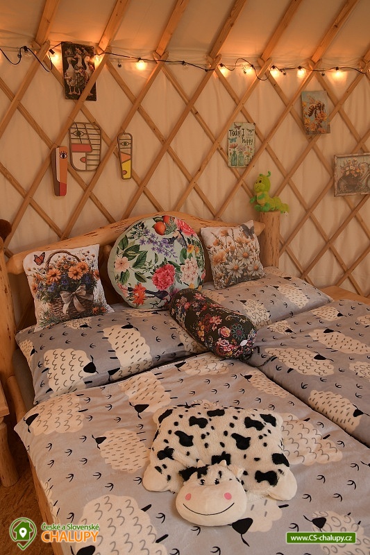 Jurta 02- hnědá v jablečném sadu v "Boho uměleckém stylu." Statek s jurtami je obklopen farmářským dřevěným plotem, který chrání jeho kouzelný svět. Představte si, jak se probouzíte do ticha přírody, obklopeni krásou a klidem. Jurty jsou vybaveny elektrickým proudem a v některém z 8-mi elektro pilířů si můžete dobít třeba i své elektrické auto. Statek je ideální pro rodinné pobyty - dovolené, romantické víkendy nebo meditativní úniky do přírody. V okolí: Turistická oblast Toulava, Monínec, Čapí hnízdo, Albertovy skály, zřícenina hradu Zvěřinec s vyhlídkou do kraje a Chýnovské jeskyně. Kouzlo Petrova statku - Zamilují si to tady jak dospělí, tak děti. Ty se mohou až do konce října vydovádět zdarma na skákacím hradě přímo na pozemku. Projděte se zahradou, kterou zdobí ladovské vrby a vrbové igloo, usedněte na některou z ručně vyřezávaných laviček z dubu a akátu, které zdobí motivy zvířat a je z nich pokaždé trochu jiný výhled na okolní přírodu. Co dělat v Toulavě? Vyrazte třeba na romantickou zříceninu hradu Borotín, objevujte magickou Chýnovskou jeskyni, která je nejhlubší svého druhu v Čechách. V Sedlci navštivte kostel sv. Jeronýma a expozici Českého Meránu nebo v Prčici zajděte na zámek. Za překrásnými výhledy vyšplhejte na zříceninu hradu Zvěřinec, kterou si zamiloval i Karel Hynek Mácha. Za zvířátky vyrazte do Cunkova, kde chovají bizony a huculské koně. Fanoušky skanzenů nadchne Vysoký Chlumec, který vám přiblíží život vesnických předků. Za pozornost stojí také zámek Červený hrádek s romantickým parkem nebo zámek v Jistebnici.