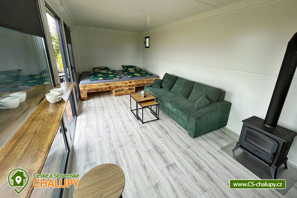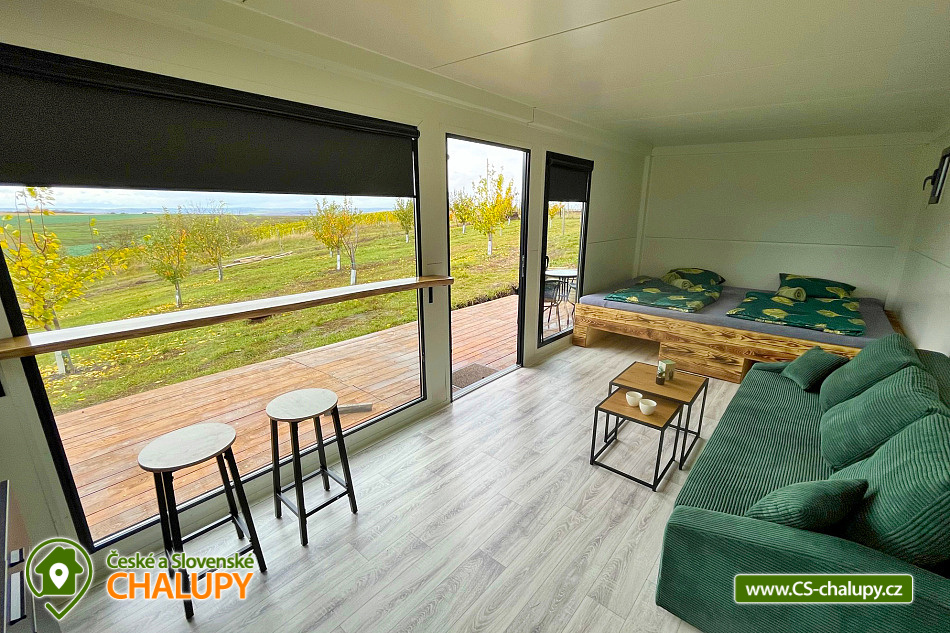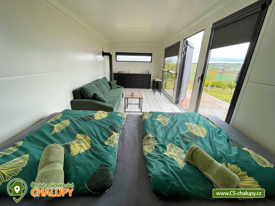 Glamping uprostřed moravských vinic - jižní Morava. Glamping se nachází na kopci v meruňkovém sadu přímo uprostřed moravských vinic v pěší vzdálenosti od vesničky Čejkovice a nedalo města Hodonín na jižní Moravě. Přímo v Čejkovicích je možné navštívit Templářské sklepy, Domek T. G. Masaryka, Zámek Čejkovice nebo výrobnu bio čajů Sonnentor. Během ubytování se můžete těšit na nerušený výhled do krajiny, probuzení uprostřed přírody či na západy slunce se sklenkou výborného vína z rodinného vinařství Příroda v pohodlí proskleného glampingového kontejneru. Glamping v Tiny House nabízí ubytování pro až 4 osoby. V domku je k dispozici pohodlná, veliká dvoulůžková postel a dvě přistýlky řešené komfortní rozkládací pohovkou. Dále je součástí domku malá kuchyňka a krbová kamna. Sociální zařízení je řešené venkovní sprchou a toaletou. Venku lze posedět na terase. K dispozici je ohniště. Parkovat lze přímo u objektu. V okolí objektu možnost turistiky, cykloturistiky, koupání a houbaření. V blízkosti je také jízdárna a tenisové kurty. Po domluvě lze zajistit degustaci vín ve vinařství Příroda. Mezi možnosti koupání patří např.: koupaliště Němčičky, rybník Velký Bílovec, rybník Šutrák, koupaliště Horní Bojanovice, koupaliště Dubňany, rybník Lužice, bazén Hustopeče, koupaliště Hustopeče, bazén Hodonín, koupaliště Hodonín, Mlýnský rybník, bazén Břeclav, atd. K výletům v okolí láká Lednicko – valtický areál, Větrný mlýn ve Starém Poddvorově, Kobylí rozhledna, Zámek Milotice nebo Mikulov. Těšíme se na Vás u nás.