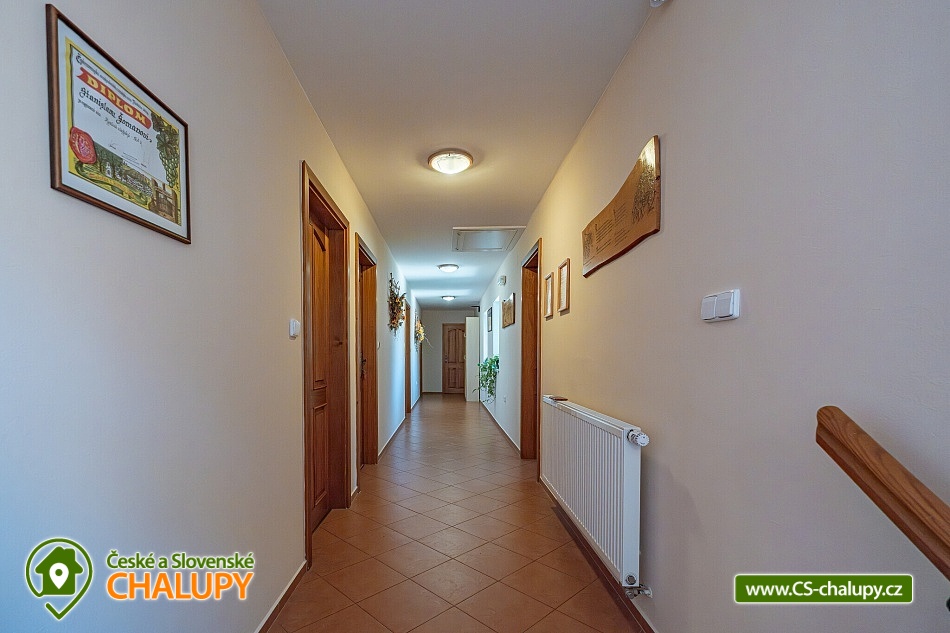 Penzion s možností řízené degustace vína se nachází v turisticky oblíbené lokalitě CHKO Pálava nedaleko města Mikulov, přehrady Nové Mlýny a Aqualand Moravia. Kapacita objektu je až 16 osob ve 4x samostatně pronajímaných čtyřlůžkových pokojích. Po domluvě lze objekt pronajmout také jako celek. Všechny pokoje jsou zařízené stejně. V každém je k dispozici 2x jednolůžková postel (možnost spojit do dvoulůžka), 1x patrová postel, TV, úložné prostory a koupelna se sprchovým koutem a WC. K zapůjčení je dětská postýlka. Všichni ubytovaní mohou příjemné chvíle trávit v prostorné společenské místnosti s jídelními stoly a nabídkou vín z vinařství majitelů objektu. Dále lze v penzionu využívat společnou a plně vybavenou kuchyň (elektrický vařič, mikrovlnná trouba, rychlovarná konvice, lednice, mrazák a nádobí) s posezením. V celém objektu je k dispozici WIFI připojení na internet. Součástí společných prostor je také jedno samostatné WC. Nechybí úschovna pro kola. Parkovat lze přímo u objektu. K dispozici jsou 4 parkovací místa. Po domluvě lze zajistit degustaci přímo v rodinném vinařství majitelů nebo prohlídku vinařství s vinicemi. V okolí penzionu možnost turistiky, cykloturistiky, koupání, rybaření a houbaření. V blízkosti jsou tenisové kurty, fotbalové hřiště, golfové hřiště, jízdárna a bowling. Mezi možnosti koupání patří: Novomlýnská nádrž, koupaliště Mikulov, koupaliště Březí a Aqualand Moravia. K výletům v okolí lákají Pálavské vrchy, pozůstatky hradu Neuhaus i Sirotčí hrádek, Zámek Mikulov, Zřícenina hradu Děvičky, Hustopeče nebo Lednicko - Valtický areál (UNESCO). Těšíme se na Vás u nás.
