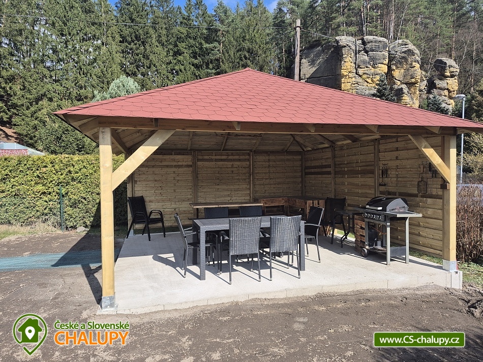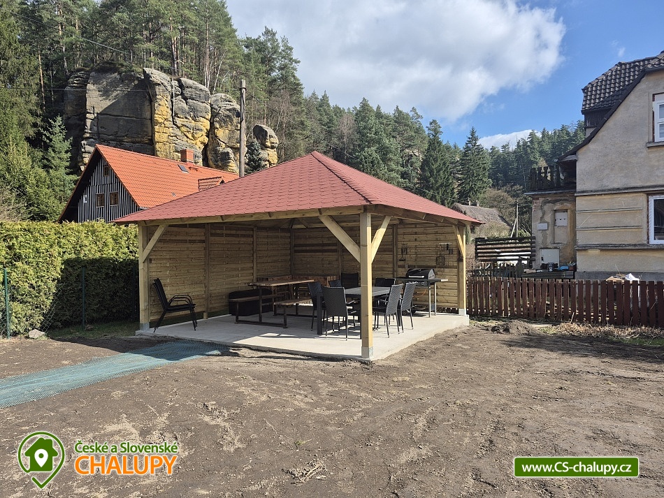 Roubenka U Slunce s výhledem na Mariinu vyhlídku - Jetřichovice - České Švýcarsko a CHKO Labské pískovce. Chalupa U Slunce Vám nabízí možnost oddychu v překrásném prostředí Českého Švýcarska přímo u CHKO Labské pískovce. Budete obklopeni lesy a kopci v malebné obci Jetřichovice. Nabízíme ubytování ve 2 samostatných chalupách pro 2 a 7 osob na jednom oploceném pozemku. Obě chalupy je možné pronajmout jako celek 1 skupině klientů (kapacita 9 osob), ale i samostatně. Jsou pro Vás připraveny 3 ložnice (2x2 lůžka 1x3 lůžka) v objektu U Slunce I a 1 ložnice (2 lůžka) v objektu U Slunce II. Vnitřní vybavení chalupy U Slunce I: obývací místnost (satelitní TV, elektrický krb, sedací souprava, jídelní stůl, koupelna, ložnice, infra-sauna. Kuchyně: lednice s mrazákem, el. varná deska, el. trouba rychlovarná konvice, mikrovlnná trouba, ruční elektrický mixer., kávovar DeLonghi. Koupelna zahrnuje vanu, WC a pračku. V 1.patře: 2 x ložnice, další vybavení žehlička, žehlící prkno. U chalupy U Slunce I je zázemí pro děti: dětská jídelní stolička, dětská postýlka, pískoviště, houpačka, stolní fotbálek, malá trampolína, dětské hřiště je vzdálené 300 m. Vnitřní vybavení objektu U Slunce II: obývací místnost, televize, sedací souprava, jídelní stůl, ložnice 2 lůžka, kuchyně, koupelna a WC. Kuchyně: lednice s mrazákem, el. varná deska, el. trouba rychlovarná konvice, mikrovlnná trouba, ruční elektrický mixer., kávovar DeLonghi. další vybavení žehlička. Vnější vybavení druhé chalupy U Slunce II: pergola s grilem, houpačka, malá trampolína, pískoviště, celý pozemek je oplocen. Vytápění v chalupě U Slunce I: elektrický kotel, U Slunce II: tepelné čerpadlo a přímotop. Parkování je možné na oploceném pozemku u chalup. Najdete zde široké vyžití, ať už koupání - přímo v obci je přírodní koupaliště a nedaleko městské koupaliště v České Kamenici, houbaření v lesích přímo u chalupy a bezpočet překrásných turistických tras, cyklistických tras a zajímavých míst jako Pravčická brána, Divoká soutěska, Kyjovské údolí, skalní hrad Bastei a další. Pro milovníky zimních sportů jsou v dosahu lyžařské areály Jedlová a Polevsko, Prácheň, Mezičky, Polevsko, Horní Podluží. Přímo z pozemku vidíte na Labské pískovce.