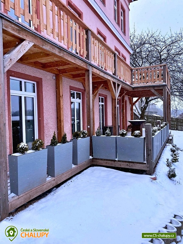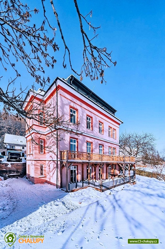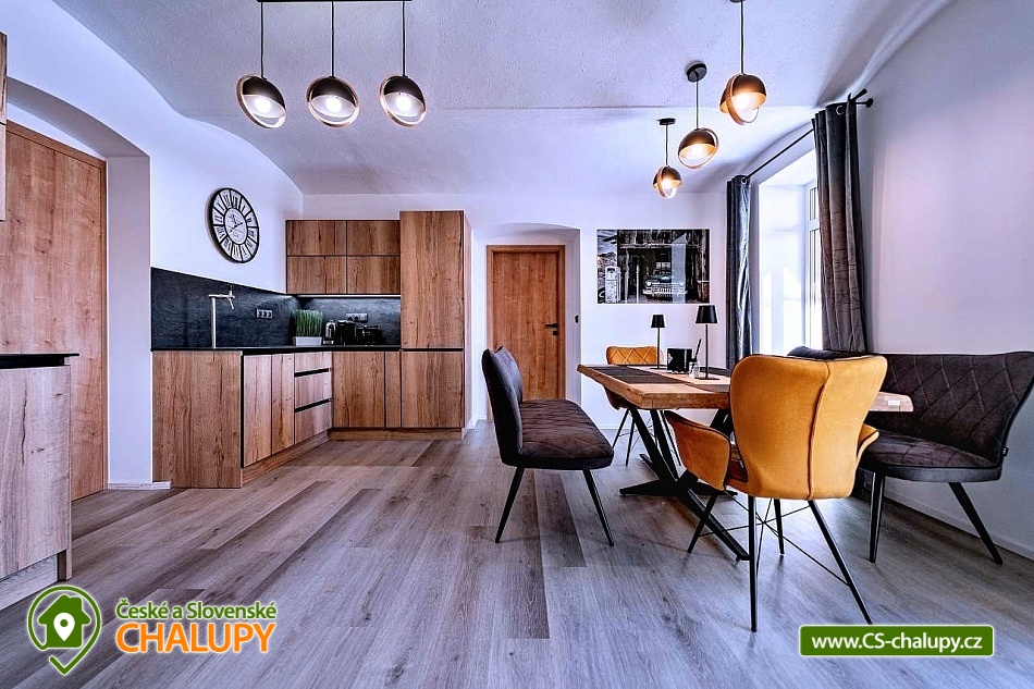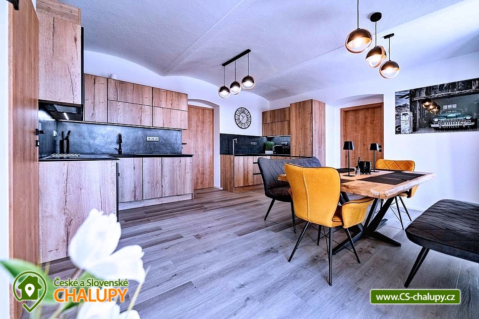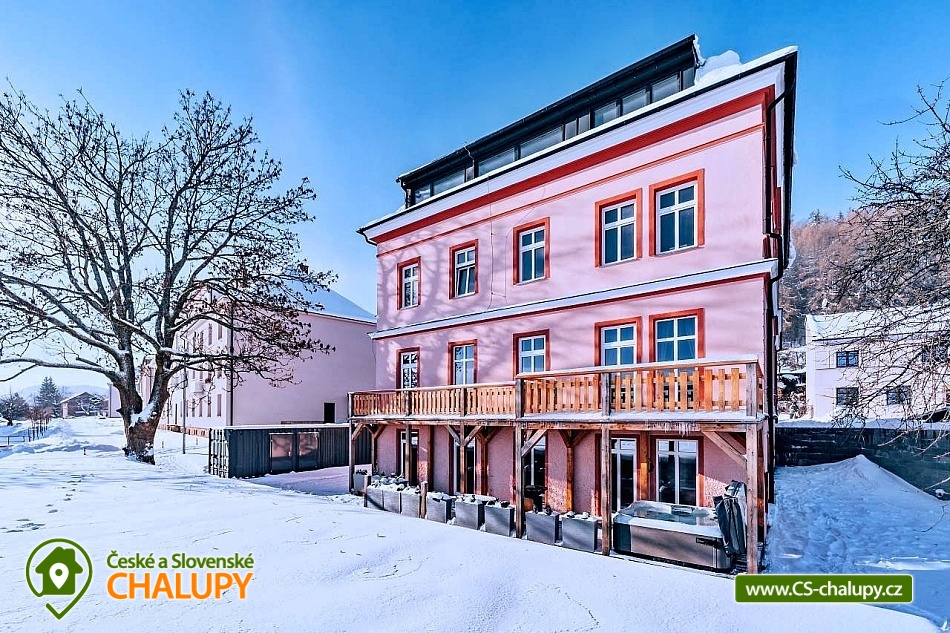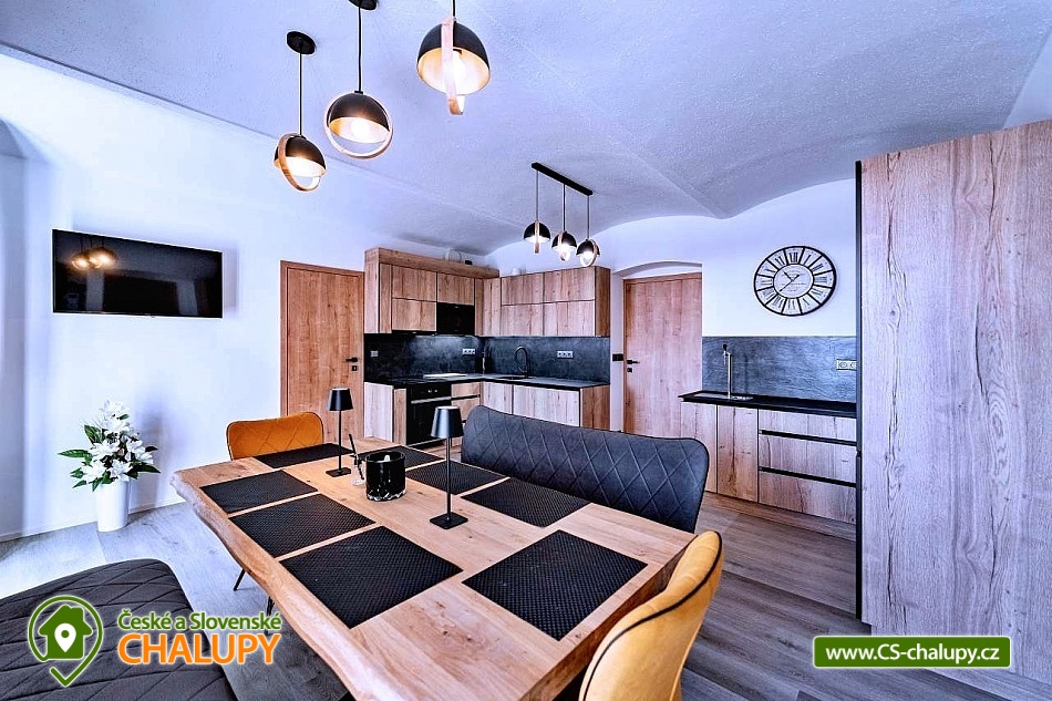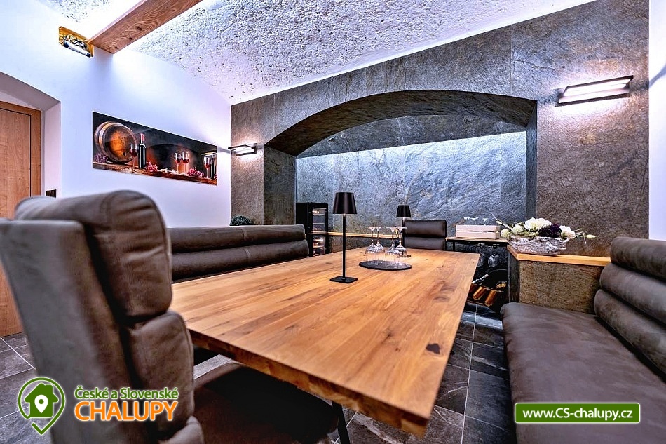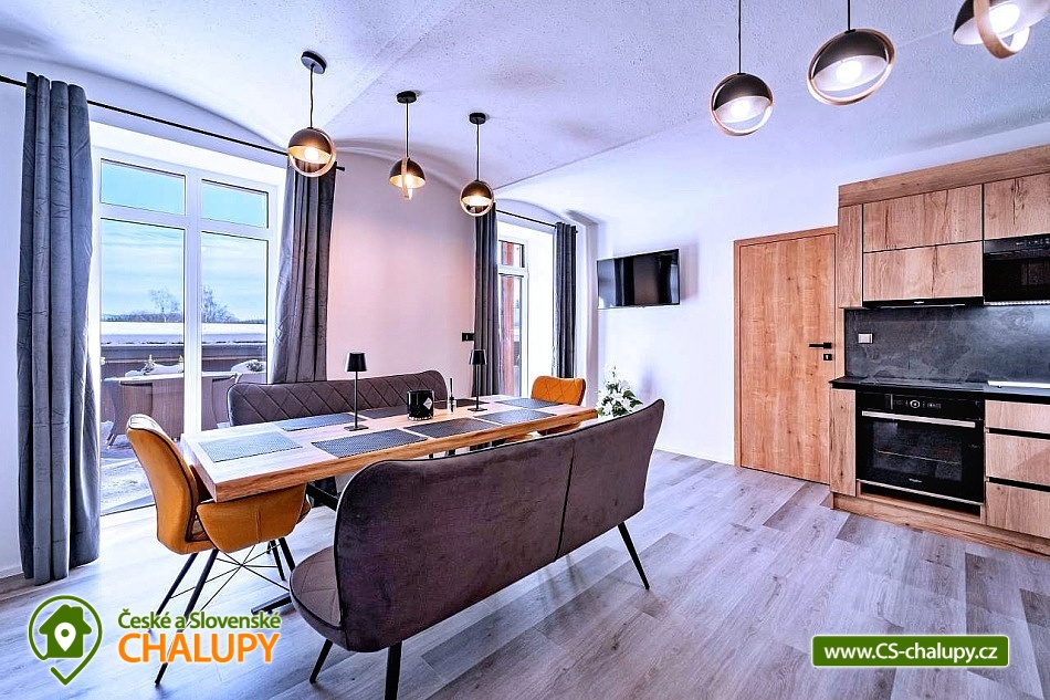 Apartmán Krkonoše (vlastní kinosál + vinný sklípek s vinotékou a krbem + venkovní terasa s vířivkou Villeroy & Bochse a grilem Ofyr) se pronajímá vždy jako celek 1 skupině, nachází se v obci Žacléř u Prkenného Dolu v Krkonoších. Je ideálním místem pro relaxaci a odpočinek v krásné přírodě Krkonoš pro rodiny s dětmi nebo uzavřenou skupinu. Součástí apartmánu je kinosál s velkou rozkládací pohovkou, která také slouží pro přespání. Kinosál má profesionální projektor s širokoúhlým plátnem, kvalitním ozvučením a pohodlnou pohovkou, aby jste se cítili jak v opravdovém kině. Venkovní terasa je vybavena vířivkou značky Villeroy & Boch pro 5 osob. Na venkovní terase je venkovní posezení s vyhlášeným grilem značky Ofyr. Gril můžete využít pro grilování vašich specialit nebo si objednat kvalitní flank steaky od kvalitního dodavatele. K dispozici je také vinný sklípek s posezením pro 10 osob s vinotékou a krbem. Apartmán Horský Sklípek poskytuje ubytování pro až 10 osob ve 3 ložnicích. POPIS: Pokoj 1 - manželská postel pro 2 osoby + výklopná manželská postel pro 2 osoby, koupelna se sprchovým koutem + WC, přímý vstup na terasu. Pokoj 2 - manželská postel pro 2 osoby + patrová postel pro 2 osoby, koupelna se sprchovým koutem + WC. Pokoj 3 - velké plátno s profesionálním projektorem, plně rozložitelná sedací souprava na přespání pro 2 osoby, herní konzole. Standardní ubytování lze pro 10 osob. V případě zájmu o ubytování většího počtu osob je po telefonické domluvě možný 4. pokoj s rozkládací pohovkou (pro 2 osoby) s koupelnou a WC. Sociální zařízení: První dva pokoje mají svou koupelnu + WC. V případě dokoupení čtvrtého pokoje je k dispozici další koupelna s WC. Vytápění: Celý objekt je centrálně vytápěný. V apartmánu je plně vybavená kuchyň s jídelní sestavou pro 10 lidí, s kuchyňským koutem včetně varné desky, trouby, mikrovlnné trouby, rychlovarné konvice, myčky, lednice, mrazáku, pípou s chlazením na pivo, kávovaru Catler s kapslemi Nespresso, Tchibo, Nescafé Dolce Gusto. K dispozici je také jídelní židlička pro děti. Region Žacléřsko je ideálním výchozím místem pro výlety na českou i polskou stranu Krkonoš. Na jedné straně Krkonoše, na druhé Vraní hory a mezi nimi otevřená cesta do polského příhraničí. Přírodní rozmanitost, historické památky i turistické zajímavosti regionu dělají ze Žacléřska ideální cíl pro jednodenní návštěvy, víkendové pobyty i delší dovolenou. Nad Prkenným Dolem na vrchu Stachelberg se nachází největší dělostřelecká tvrz v České republice a jedna z největších v Evropě. Těšíme se na Vás u nás.
