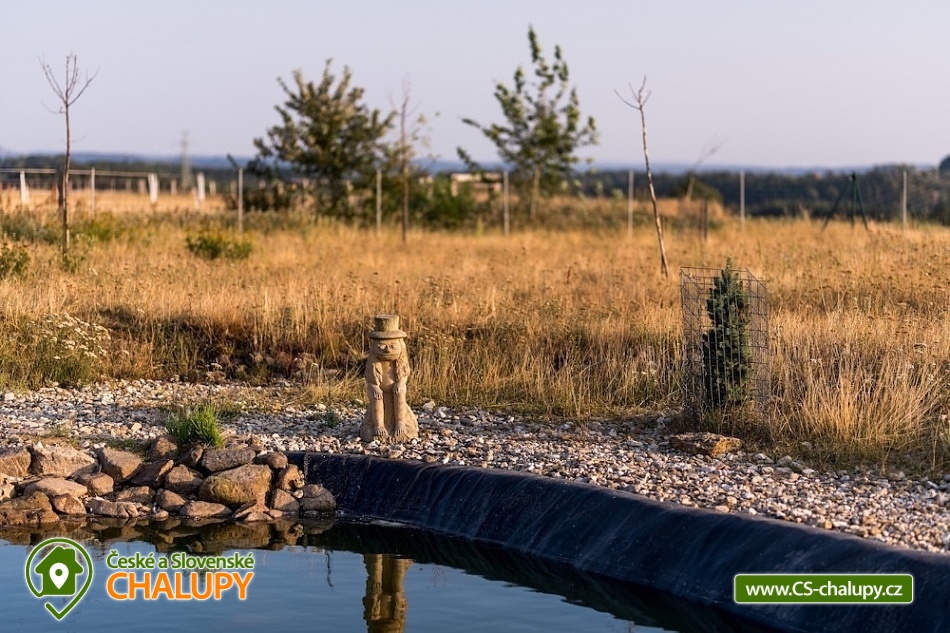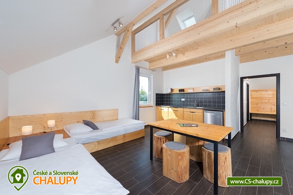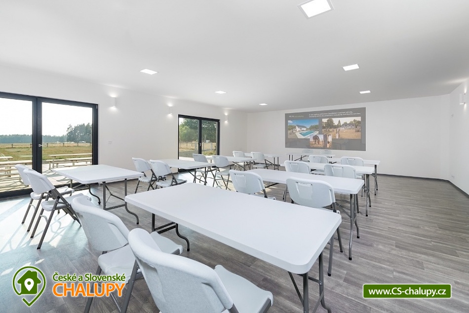 Wellness chalupa Český ráj nedaleko zámku Sychrov s bazénem a saunou. Luxusní chalupa pro až 25 osob, která se pronajímá vždy jedné skupině klientů v soukromí. Objekt je rozdělen do několika funkčních celků: ubytovací část tvoří apartmány, které jsou stylově zařízené, prostorné, postele velké, čisté a pohodlné, s podlahovým vytápěním, takže je všude sucho a teplo. K dispozici je 5 apartmánů pro 1x3os., 2x4os., 1x6os. a 1x8os, Každá rodina nebo skupinka 3 až 8 osob má k dispozici vlastní sociální zázemí (sprcha nebo vana) s minimalistickou kuchyňkou. Druhá část je velká společná jídelna s krbovými kamny, měkkými sedacími lavicemi, smart TV, dětským koutkem, klavírem a velkou poloprofesionální kuchyní oddělenou jen barovým pultem, kde je k dispozici profi pípa s 5 kohouty a chlazením. K jídelně jsou samostatná wc. Prostor je oddělen od ubytovací části chodbou - to aby se „sovy a skřivani“ vzájemně nerušili. Jídelnu obklopují venkovní terasy s posezením pod střechou. K dispozici je kvalitní kávovar s vlastní obsluhou a profi pípa na nápoje s 5 kohouty a chladícím zařízením. Použít můžete také prádelnu a bezplatné připojení k internetu. Jen pár metrů od hlavní budovy je v samostatném objektu sauna se sprchou a odpočívárnou a v těsné blízkosti je venkovní bazén se slanou vodou a terasou s lehátky. V rámci oploceného pozemku máte k dispozici rovněž velkokapacitní ohniště s dostatkem dřeva a dětské hřiště s houpačkami a skluzavkami. Nabízíme také univerzální halu 100m2 - hernu s vlastním sociálním vybavením, kde je ping - pongový stůl, může zde probíhat i společenská akce, cvičení, školení apod. Pozemky okolo areálu jsou našim hostům plně k dispozici vč. vstupu na naši rozhlednu, ze které je krásně vidět například Ještěd, Trosky a nebo hrad Bezděz. Příjezd je bezproblémový i v zimě. Parkování je na vlastním pozemku za zavřenými vraty s kamerovým dohledem. Výhodou obce je její naprostý klid, ze zahrady je vidět dominanta severních Čech – Ještěd 1012 mnm, v dálce pak siluety Trosek a Bezdězu. Tipy na výlety: bobová dráha Javorník, zimní stadion, pronájem lodí nebo koloběžek, liberecká ZOO, aquapark Liberec, IQ Landia, paragliding, letiště nejen pro větroně, golf a malebná příroda Českého ráje - všude kolem. Krátkou procházkou se od nás můžete zajít podívat například na Hodkovické letiště, k řece Mohelce, na státní zámek Sychrov a nebo můžete jen obejít naši klidnou obec a potkat pár srnek. Ze vzdálenějších míst s dojezdem 15minut můžeme vyjmenovat Malou Skálu, Frýdštejn, volnočasové středisko Javorník, přírodu Českého ráje, koupaliště přírodní i krytá, nebo zimní stadion v Turnově a samozřejmě Ještěd a lákadla Liberce.
