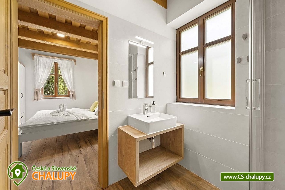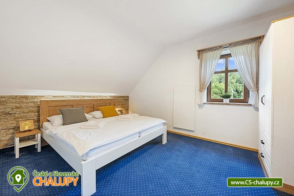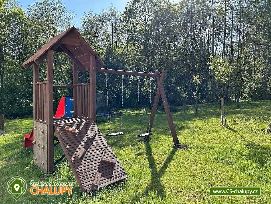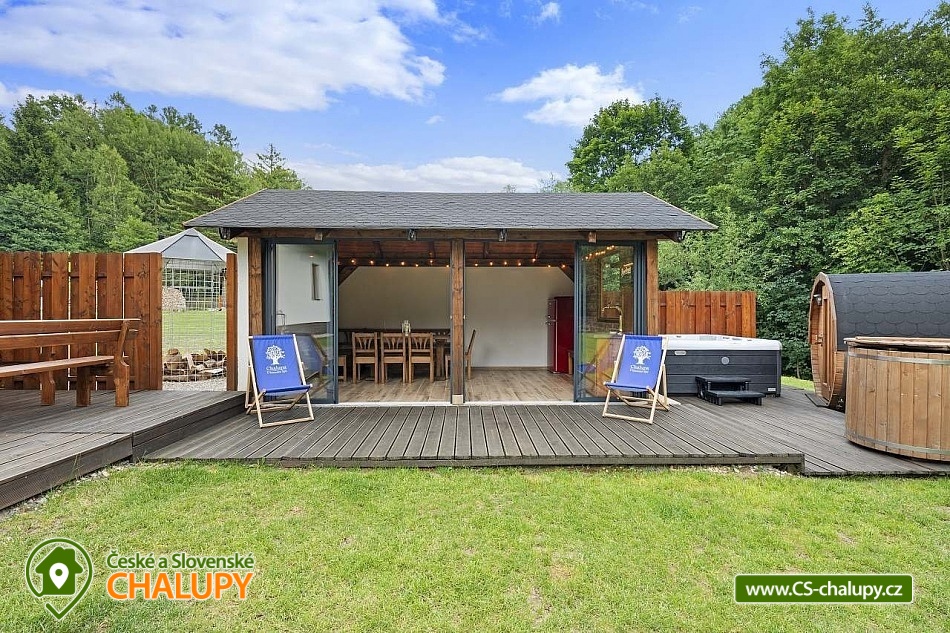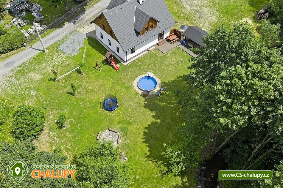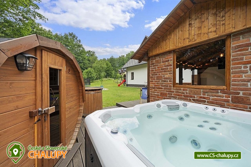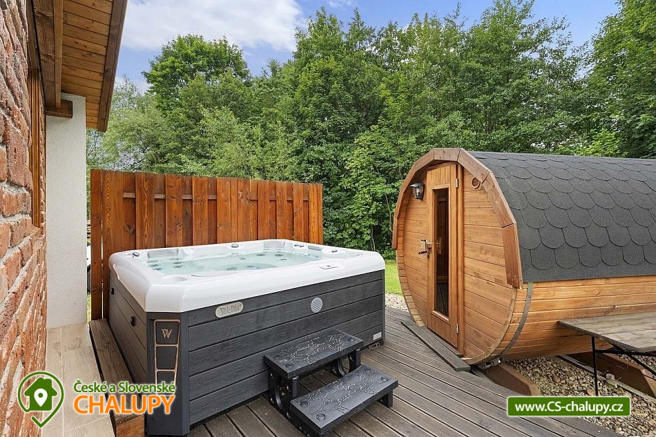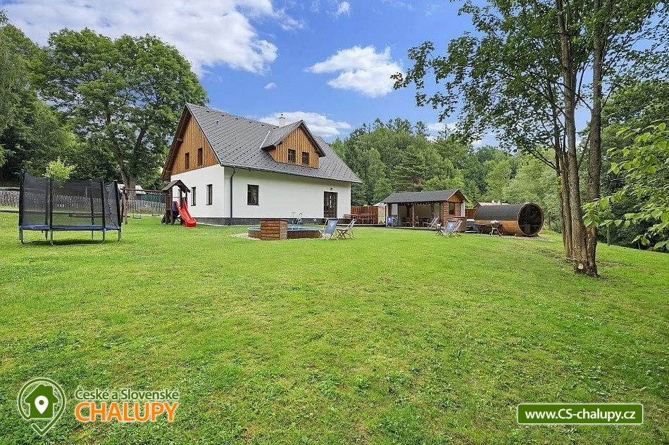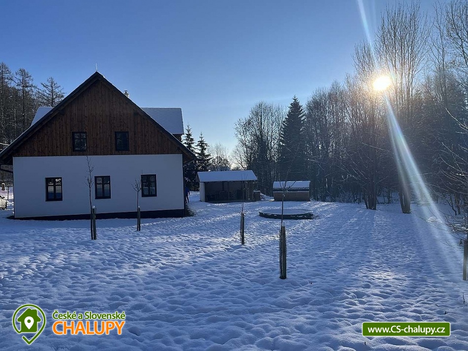 Wellness chalupa s bazénem a kachlovými kamny se nachází v CHKO Jeseníky nedaleko areálu Karlov, obec Dolní Moravice. Kapacita chalupy je až 12 osob v 5 ložnicích. Chalupa je obklopena nádhernou přírodou s čistým horským ovzduším a nabízí nadstandardní ubytování. Pozemkem protéká Moravický potok, který doplňuje kouzelnou atmosféru místa. K dispozici je vířivka (pro až 5 osob) a panoramatická dřevěná sauna s výhledem do přírody. K ochlazení slouží ochlazovací sud nebo tůňka v Moravickém potoku. POPIS - Přízemí: chodba, společenská místnost s kachlovými kamny a kuchyní (ležení za kamny), lyžárna s vysoušeči obuvi na 12 párů, pokoj č. 1 s manželskou postelí, koupelna se sprchovým koutem a WC, samostatné WC. Patro: pokoj č. 2 s manželskou postelí, pokoj č. 3 s manželskou postelí, koupelna se sprchovým koutem a WC, pokoj č. 4 s manželskou postelí a samostatnou postelí, pokoj č. 5 s manželskou postelí a samostatnou postelí, koupelna se sprchovým koutem a WC. V objektu je k dispozici: 3 x koupelna se sprchovým koutem a 4 x WC. Společenská místnost s kuchyní a posezením je bohatě dimenzována na větší množství osob. Kuchyň je plně vybavena spotřebiči (varná deska, trouba, mikrovlnka, myčka, lednice, mrazák, varná konvice, automatický kávovar). Vytápění je řešeno kachlovými kamny a podlahovým topením. Na zahradě dětské prolézačky, letní bazén a zastřešené posezení. Parkování na pozemku u chalupy. Okolí: Cyklotrasa vede přímo okolo chalupy a lze se po ní dostat na všechna zajímavá místa v Jeseníkách. Vyznavači sjezdů to mají do Bikeparku Kopřivná cca 20 minut pohodlné jízdy na kole. V Karlově pod Pradědem najdete také in - line dráhu. V zimě jsou hlavním lákadlem ski areály: SKi Aréna Karlov 4 km, Ski Čerťák 4 km, Ski Kopřivná 6 km. V blízkosti chalupy se nachází běžkařské stopy, ze kterých se lze dostat do celých Jeseníků. Těšíme se na Vás u nás.