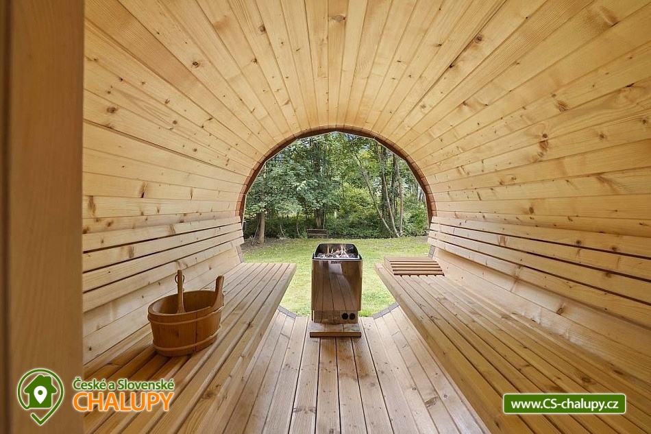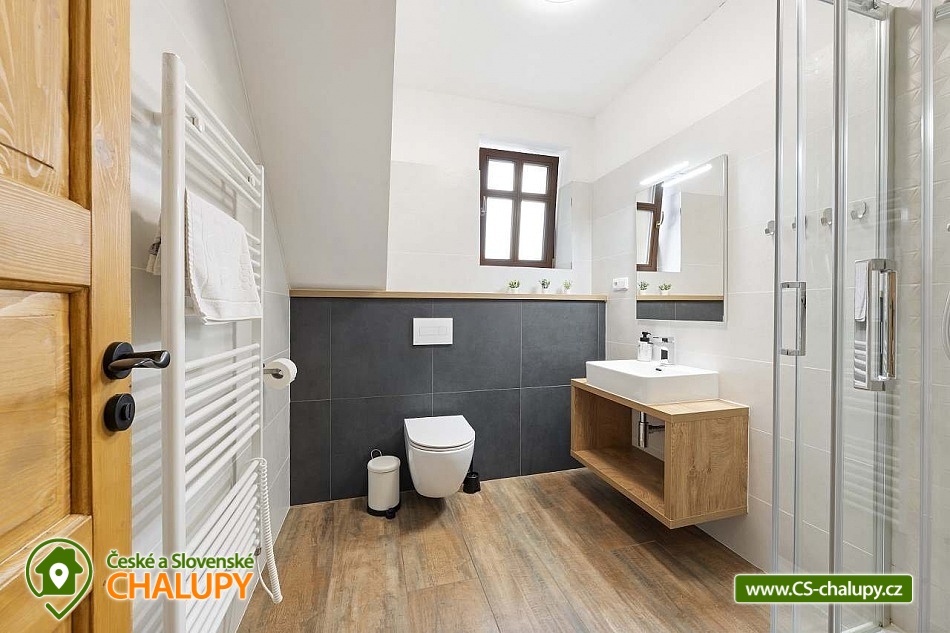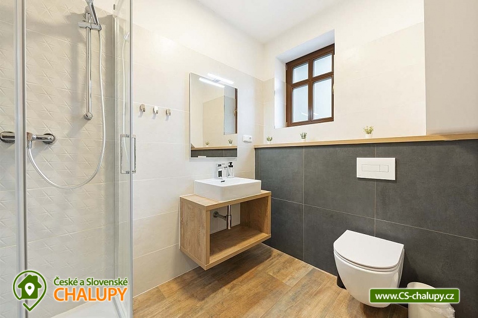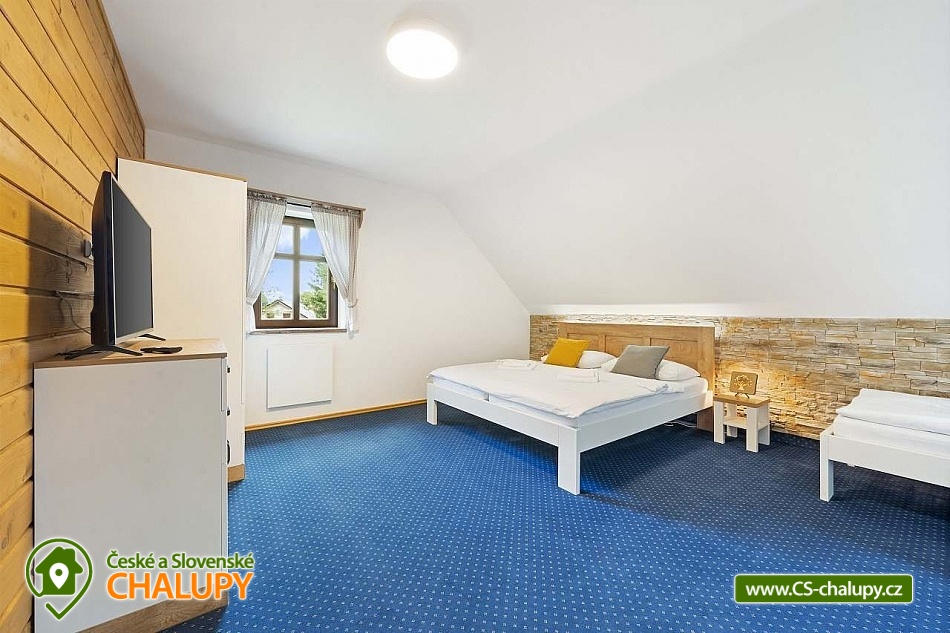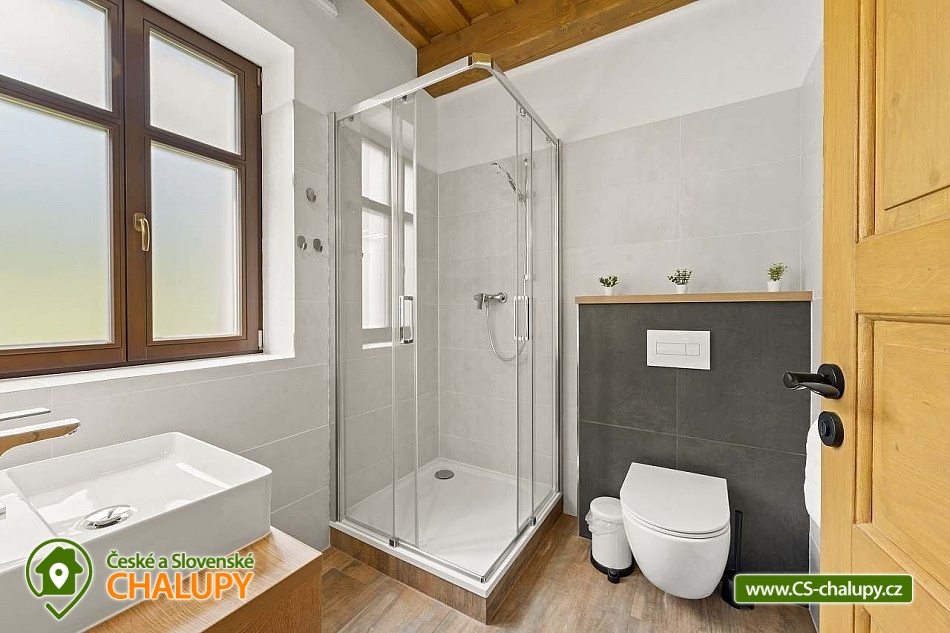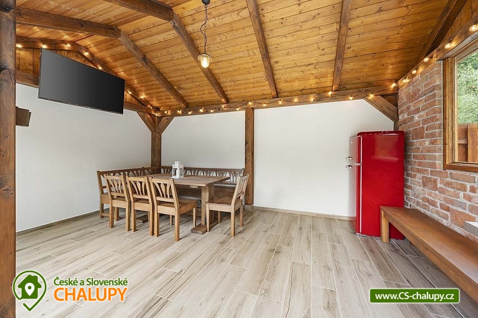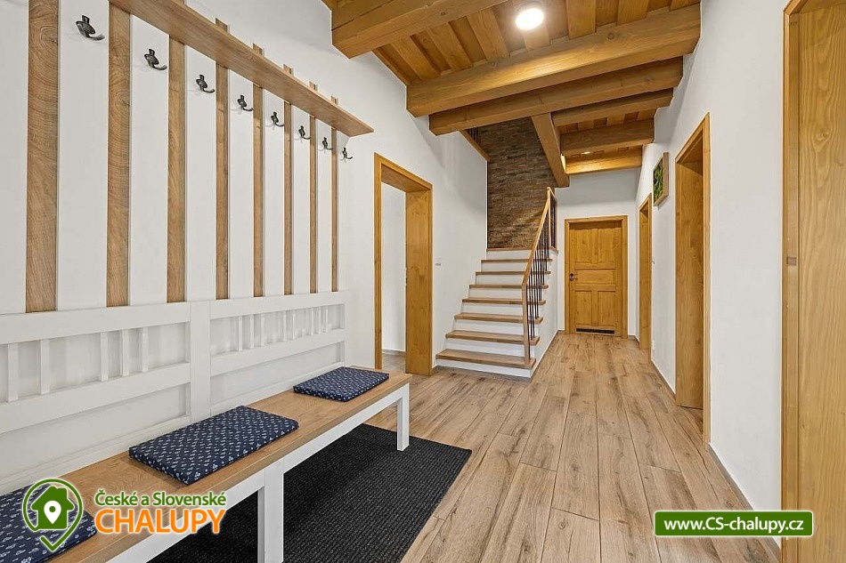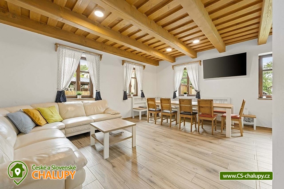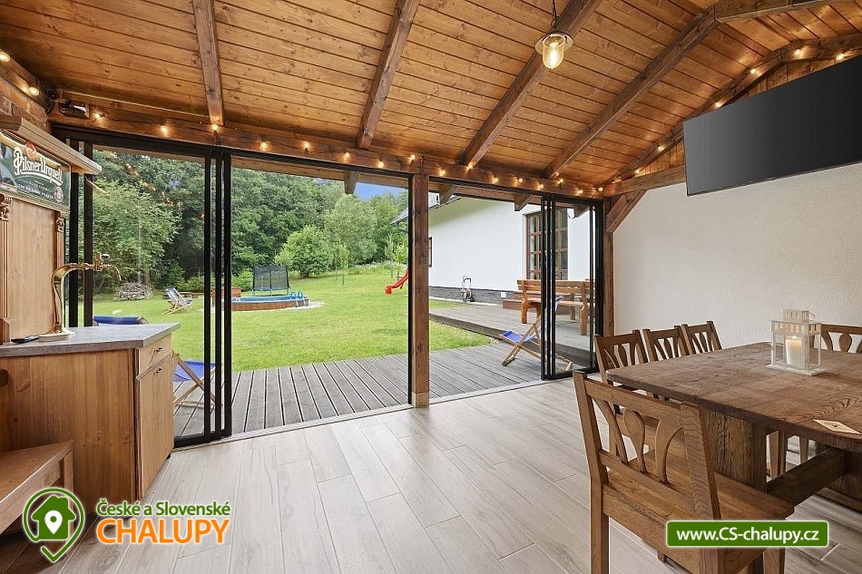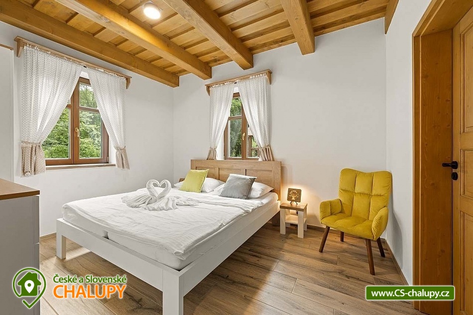 Wellness chalupa s bazénem a kachlovými kamny se nachází v CHKO Jeseníky nedaleko areálu Karlov, obec Dolní Moravice. Kapacita chalupy je až 12 osob v 5 ložnicích. Chalupa je obklopena nádhernou přírodou s čistým horským ovzduším a nabízí nadstandardní ubytování. Pozemkem protéká Moravický potok, který doplňuje kouzelnou atmosféru místa. K dispozici je vířivka (pro až 5 osob) a panoramatická dřevěná sauna s výhledem do přírody. K ochlazení slouží ochlazovací sud nebo tůňka v Moravickém potoku. POPIS - Přízemí: chodba, společenská místnost s kachlovými kamny a kuchyní (ležení za kamny), lyžárna s vysoušeči obuvi na 12 párů, pokoj č. 1 s manželskou postelí, koupelna se sprchovým koutem a WC, samostatné WC. Patro: pokoj č. 2 s manželskou postelí, pokoj č. 3 s manželskou postelí, koupelna se sprchovým koutem a WC, pokoj č. 4 s manželskou postelí a samostatnou postelí, pokoj č. 5 s manželskou postelí a samostatnou postelí, koupelna se sprchovým koutem a WC. V objektu je k dispozici: 3 x koupelna se sprchovým koutem a 4 x WC. Společenská místnost s kuchyní a posezením je bohatě dimenzována na větší množství osob. Kuchyň je plně vybavena spotřebiči (varná deska, trouba, mikrovlnka, myčka, lednice, mrazák, varná konvice, automatický kávovar). Vytápění je řešeno kachlovými kamny a podlahovým topením. Na zahradě dětské prolézačky, letní bazén a zastřešené posezení. Parkování na pozemku u chalupy. Okolí: Cyklotrasa vede přímo okolo chalupy a lze se po ní dostat na všechna zajímavá místa v Jeseníkách. Vyznavači sjezdů to mají do Bikeparku Kopřivná cca 20 minut pohodlné jízdy na kole. V Karlově pod Pradědem najdete také in - line dráhu. V zimě jsou hlavním lákadlem ski areály: SKi Aréna Karlov 4 km, Ski Čerťák 4 km, Ski Kopřivná 6 km. V blízkosti chalupy se nachází běžkařské stopy, ze kterých se lze dostat do celých Jeseníků. Těšíme se na Vás u nás.