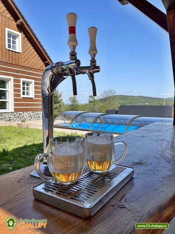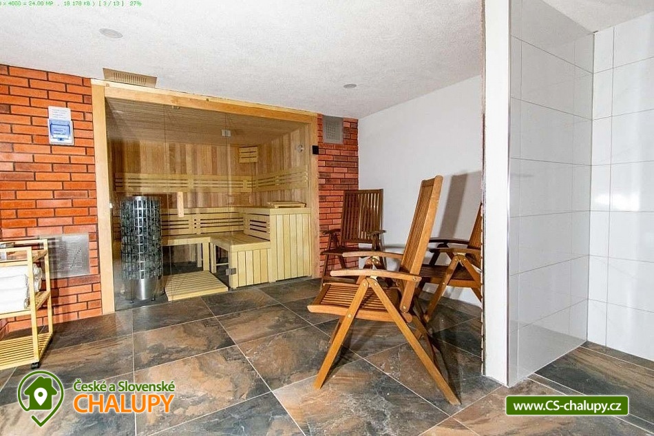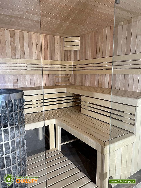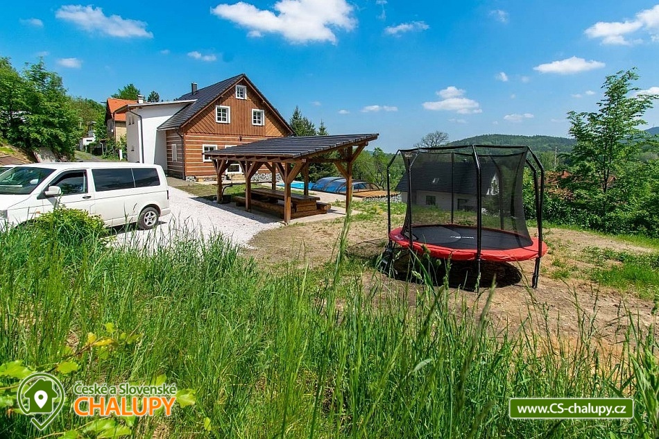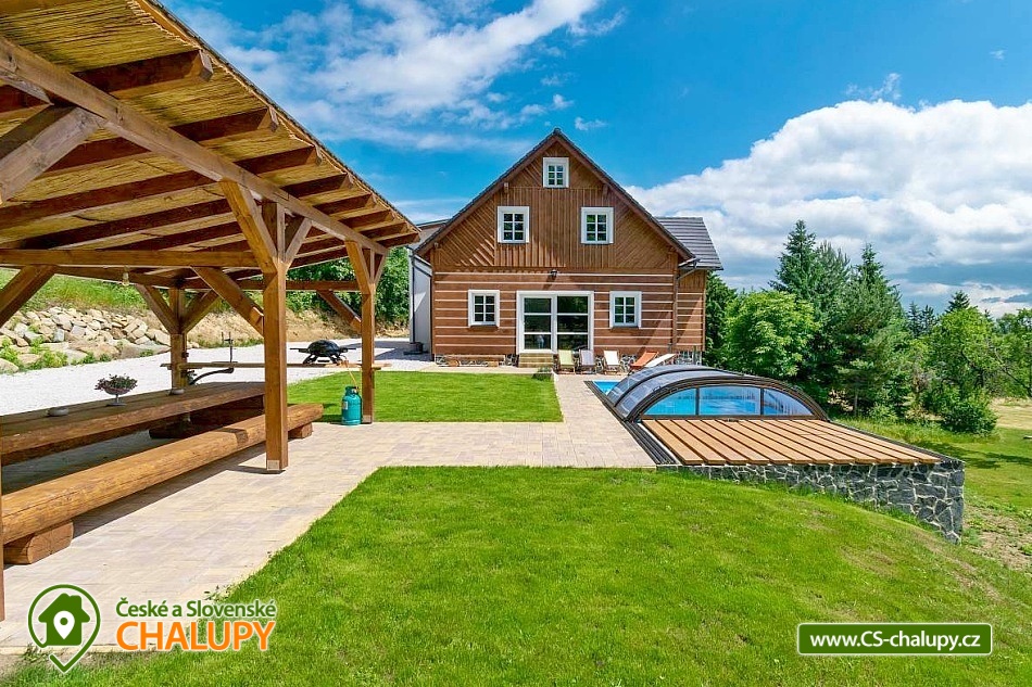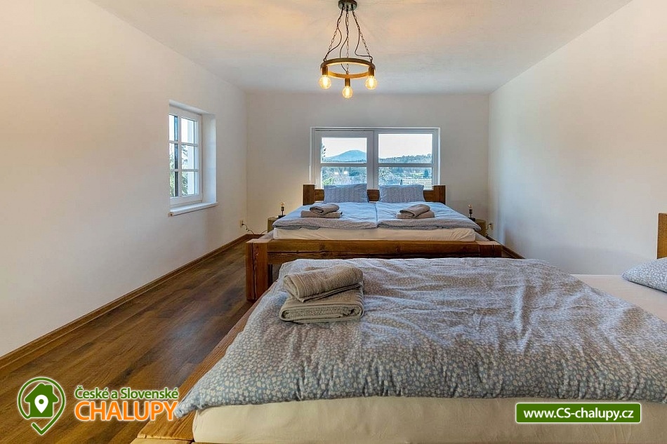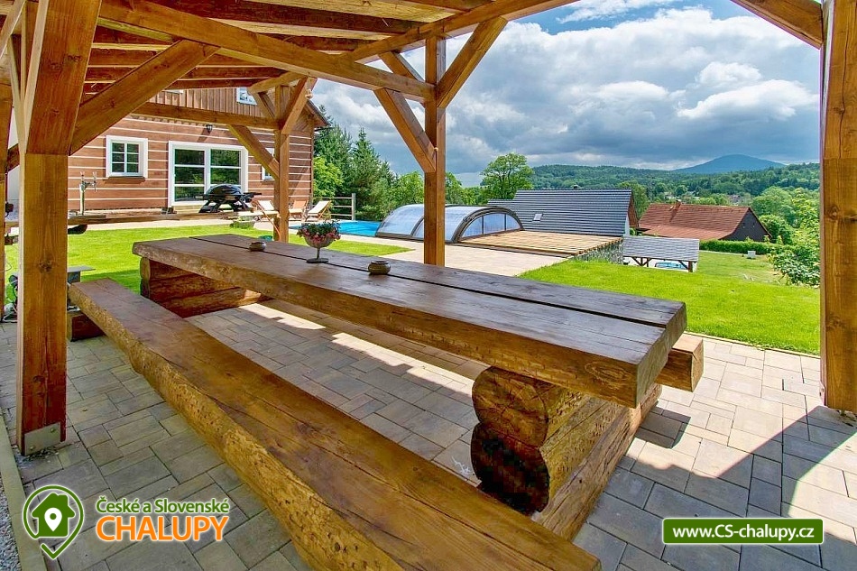 Wellness chalupa s bazénem a krásným výhledem na Jedlovou horu se nachází na okraji lesa nedaleko Krásné Lípy. V blízkém okolí láká k výletům krásná příroda CHKO Lužických hor a Národního parku České Švýcarsko. Během pobytu se můžete těšit na zastřešený venkovní bazén, finskou saunu a na příjemné chvíle strávené na prostorné terase s grilem a pípou. Chalupa nabízí ubytování pro až 15 osob, k dispozici je 3x dvoulůžková ložnice (manželská postel) a 3x třílůžková ložnice (manželská postel + jednolůžko). Celá chalupa je zařízená komfortně, moderně a s nádechem venkovského stylu. Pro společné chvíle slouží společenská místnost s obývací částí s krbovými kamny, sedací soupravou a TV a jídelní částí s velikým dřevěným jídelním stolem a výhledem do přírody přes velká balkónová okna. Součástí místnosti je plně vybavená kuchyň (varná deska, myčka nádobí, horkovzdušná i mikrovlnná trouba, americká lednice s mrazákem a výrobníkem ledu, rychlovarná konvice, kávovar, nádobí a veškeré kuchyňské potřeby). Pro děti je k zapůjčení dětská postýlka, hračky a jídelní židlička. V celém objektu je k dispozici WIFI připojení na internet. Sociální zařízení zahrnuje v přízemí jednu koupelnu se sprchovým koutem a WC a jedno samostatné WC a v patře jednu koupelnu se sprchovým koutem, vanou a WC. Vytápění je řešeno podlahovým vytápěním a peletovými kamny s výměníkem. Kolem chalupy se rozléhá prostorný pozemek (cca 1800 m²) s travnatou zahradou, zastřešenou terasou s grilem a pípou, lehátky a zastřešeným bazénem. Děti se mohou těšit na trampolínu. K dispozici je úschovna pro kola a lyže. Parkovat lze přímo u objektu. V okolí objektu možnost turistiky, cykloturistiky, koupání, rybaření, houbaření, běžkování a lyžování. V blízkosti jsou tenisové kurty. Mezi možnosti koupání patří např.: Školní rybník, Koupaliště Chřibská, Tomiškův rybník, rybník Doubice, Kyjovská přehrada, koupaliště Jiřetín pod Jedlovou, Lesenská přehrada, Kytlice - Lesní rybník, koupaliště Jetřichovice, rybník Mašíňák, plavecký bazén Rumburk, atd. V zimním období jsou k dispozici blízká lyžařská střediska: Horní Podluží, Jedlová, Mezičky a Kytlice. Přímo pod chalupou upravené běžkařské tratě a nebo lze využívat běžecké okruhy na vrstevnicích hory Jedlové. K výletům v okolí láká Pravčická brána, Šaunštejn, Falkenštejn, Pavlino údolí, Ostrovské skály, Kamenický hrad, Tolštejn nebo Pastýřská stěna. Těšíme se na Vás u nás.