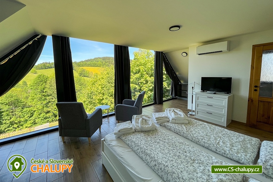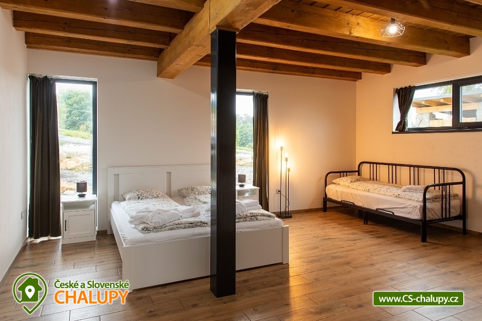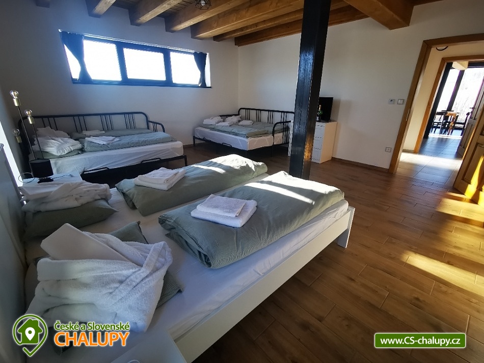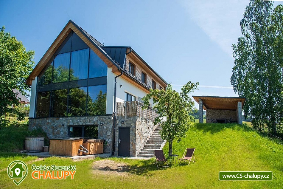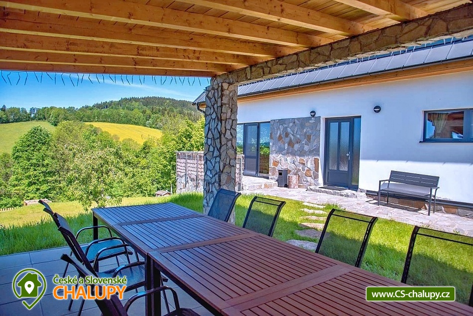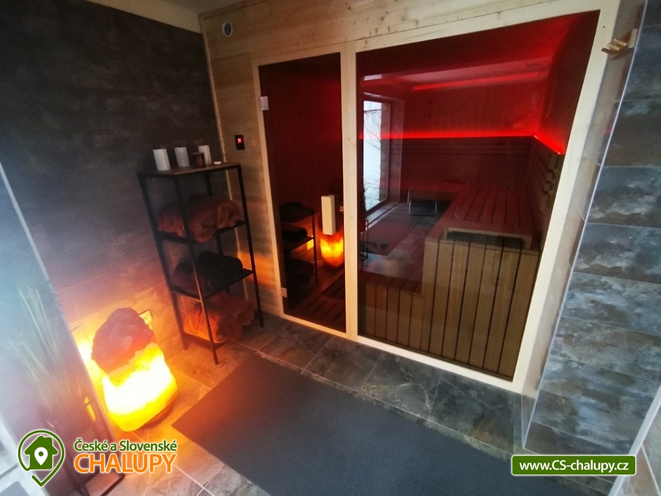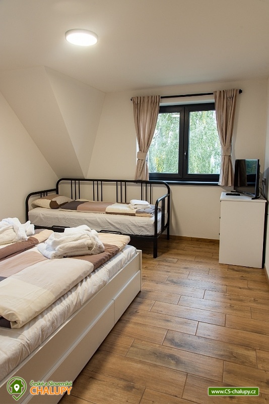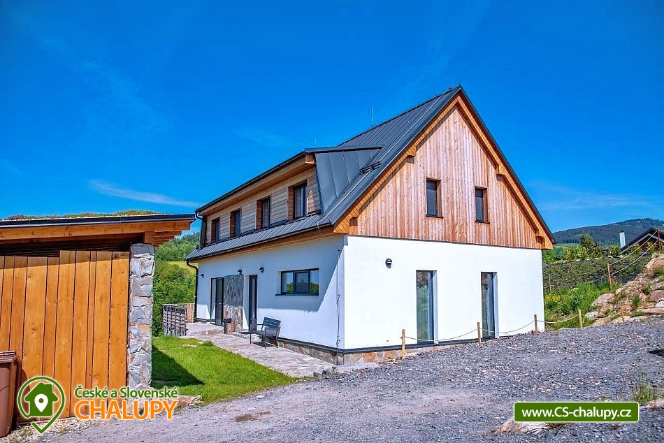 Horská wellness chata s dětským hřištěm se nachází u Větrného vrchu, 3 km od areálu Dolní Morava, který nabízí mnoho sportovních, adrenalinových a rekreačních aktivit po celý rok. Chata je vhodná pro rodiny s dětmi, party přátel a ty, co chtějí strávit aktivní dovolenou. Wellness zóna: prostorná finská sauna s odpočinkovou zónou, ochlazovací cedrový sud a luxusní švédská vířivka pro 6 osob. U nás najdete množství zážitků v létě i v zimě. Po aktivně prožitém dnu, ať už na lyžích, kolech, koloběžkách či jen po pěších túrách, si odpočinete a načerpáte energii ve wellness zóně. Chata k pronájmu poskytuje ubytování pro až 16 osob ve 4 ložnicích. Horská chata disponuje 4-mi apartmány, 1 velkou společenskou místností s plně vybavenou prostornou kuchyní a wellness zónou v přízemí objektu. Každý apartmán zahrnuje ložnici, šatnu a sprchu s WC. Každý apartmán je pro 4 osoby. Kuchyň je plně vybavená: lednička, mraznička, myčka, varná deska, digestoř, mikrovlnka, trouba na pečení, toustovač s grilem, topinkovač, veškeré nádobí na přípravu jídla a servírování. Venkovní plynový gril. Sociální zařízení: Ke každému pokoji náleží vlastní koupelna s WC, sprchovým koutem a vysoušečem vlasů. Vytápění - podlahové elektrické. Parkování na pozemku přímo u chaty, kapacita 5 aut. K dispozici jsou vína z jižní Moravy a láhvová piva k zakoupení dle ceníku. V celém objektu je k dispozici WiFi připojení. K uskladnění kol nebo lyží slouží uzamykatelná místnost přístupná zvenčí. Nechybí taktéž stylové venkovní posezení s plynovým grilem. V okolí chaty je sportovní i rodinné vyžití. Resort Dolní Morava nabízí zábavné parky pro děti, mamutí park, mamutí horská dráha, bobová dráha u Slona nebo dech beroucí stezka v oblacích. Také nejdelší visutá lávka na světě Sky Bridge s délkou 721 m vám vyrazí dech a bude pro vás zážitkem. V letním období adrenalin park, horské koloběžky, BagJump, Single trails, šlapací káry, trampolíny a spoustu dalších zážitků. V zimě jsou k dispozici skiareály - Sněžník a U Slona a ski areál Větrný Vrch. Samozřejmostí jsou dětské skiparky, půjčovny vybavení a zajištění výuky. Na své si tu přijdou i příznivci běžkařských tras a sněžnic. Pro vyznavače skialpinismu jsou organizovány různé formy výšlapů - pohodové večerní, s přespáním na horské chatě, individuální dle domluvy. Všude vás pohodlně vyvezou sedačkové lanovky. Těšíme se na Vás u nás.