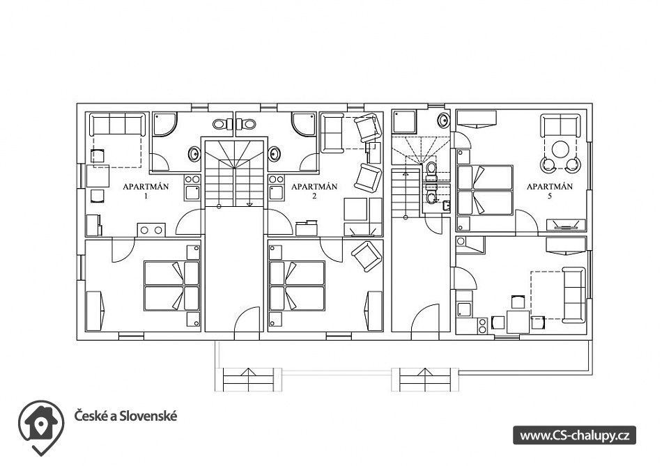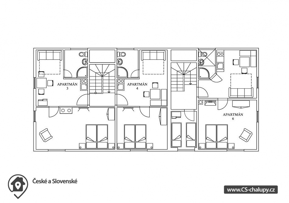 - 6 ložnic: 1x 4+2, 1x 2+4, 4x 2+2