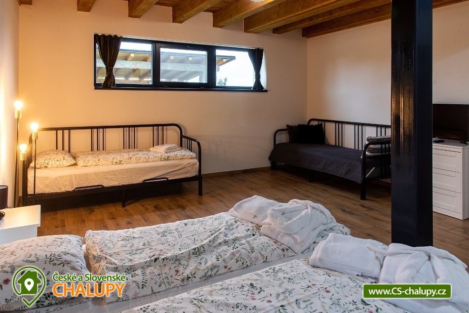 Horská wellness chata s dětským hřištěm se nachází u Větrného vrchu, 3 km od areálu Dolní Morava, který nabízí mnoho sportovních, adrenalinových a rekreačních aktivit po celý rok. Chata je vhodná pro rodiny s dětmi, party přátel a ty, co chtějí strávit aktivní dovolenou. Wellness zóna: prostorná finská sauna s odpočinkovou zónou, ochlazovací cedrový sud a luxusní švédská vířivka pro 6 osob. U nás najdete množství zážitků v létě i v zimě. Po aktivně prožitém dnu, ať už na lyžích, kolech, koloběžkách či jen po pěších túrách, si odpočinete a načerpáte energii ve wellness zóně. Chata k pronájmu poskytuje ubytování pro až 16 osob ve 4 ložnicích. Horská chata disponuje 4-mi apartmány, 1 velkou společenskou místností s plně vybavenou prostornou kuchyní a wellness zónou v přízemí objektu. Každý apartmán zahrnuje ložnici, šatnu a sprchu s WC. Každý apartmán je pro 4 osoby. Kuchyň je plně vybavená: lednička, mraznička, myčka, varná deska, digestoř, mikrovlnka, trouba na pečení, toustovač s grilem, topinkovač, veškeré nádobí na přípravu jídla a servírování. Venkovní plynový gril. Sociální zařízení: Ke každému pokoji náleží vlastní koupelna s WC, sprchovým koutem a vysoušečem vlasů. Vytápění - podlahové elektrické. Parkování na pozemku přímo u chaty, kapacita 5 aut. K dispozici jsou vína z jižní Moravy a láhvová piva k zakoupení dle ceníku. V celém objektu je k dispozici WiFi připojení. K uskladnění kol nebo lyží slouží uzamykatelná místnost přístupná zvenčí. Nechybí taktéž stylové venkovní posezení s plynovým grilem. V okolí chaty je sportovní i rodinné vyžití. Resort Dolní Morava nabízí zábavné parky pro děti, mamutí park, mamutí horská dráha, bobová dráha u Slona nebo dech beroucí stezka v oblacích. Také nejdelší visutá lávka na světě Sky Bridge s délkou 721 m vám vyrazí dech a bude pro vás zážitkem. V letním období adrenalin park, horské koloběžky, BagJump, Single trails, šlapací káry, trampolíny a spoustu dalších zážitků. V zimě jsou k dispozici skiareály - Sněžník a U Slona a ski areál Větrný Vrch. Samozřejmostí jsou dětské skiparky, půjčovny vybavení a zajištění výuky. Na své si tu přijdou i příznivci běžkařských tras a sněžnic. Pro vyznavače skialpinismu jsou organizovány různé formy výšlapů - pohodové večerní, s přespáním na horské chatě, individuální dle domluvy. Všude vás pohodlně vyvezou sedačkové lanovky. Těšíme se na Vás u nás.