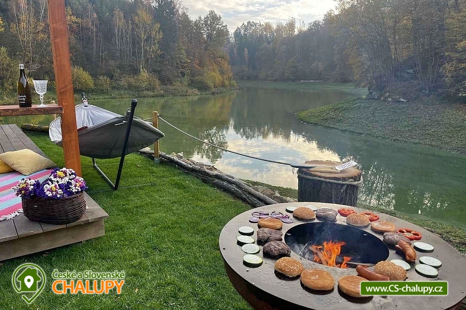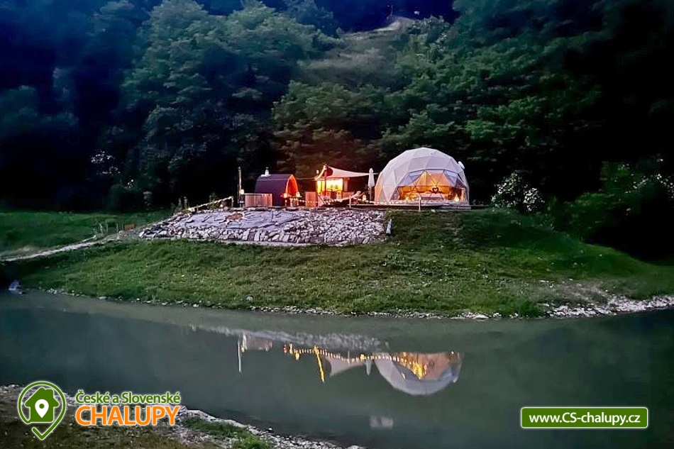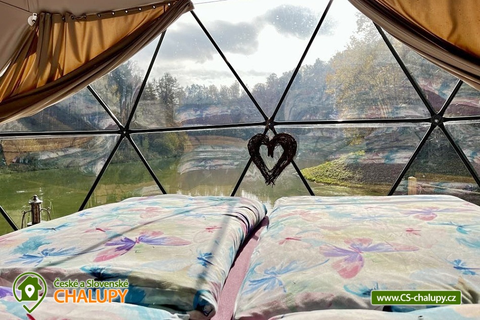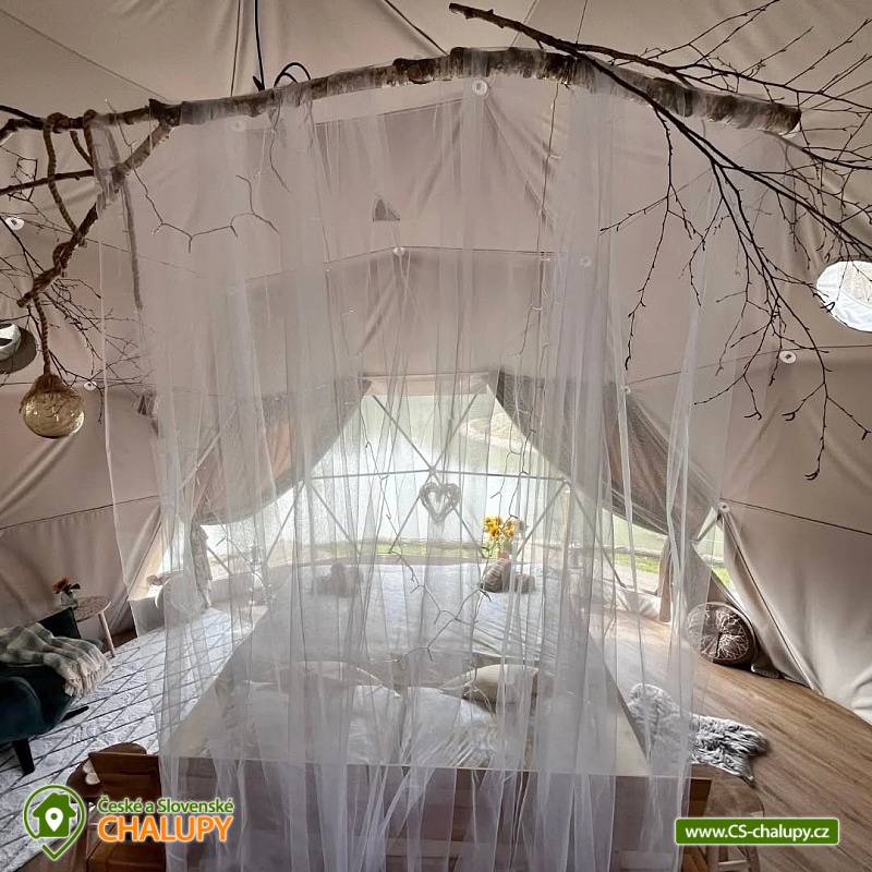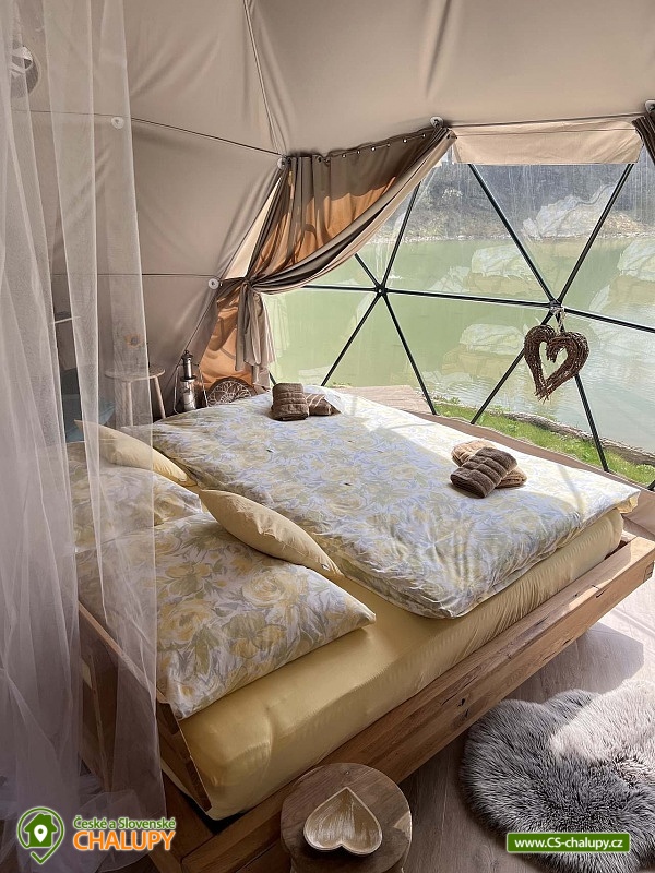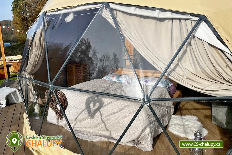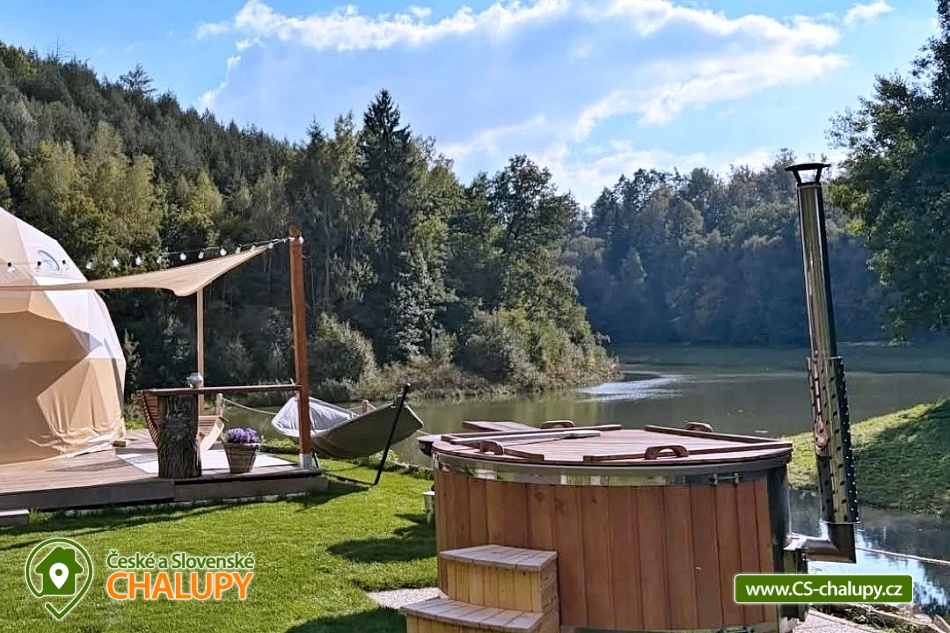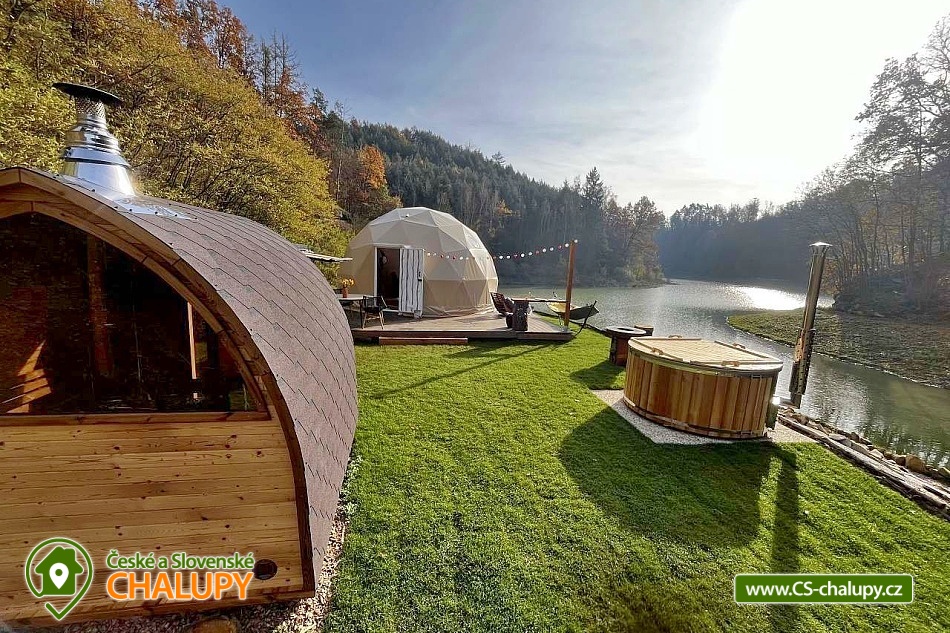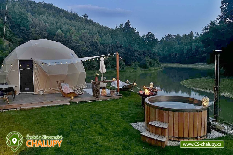 Wellness glamping u vody (pro 2 osoby) je vybavený saunou a koupacím sudem, nachází se na soukromém poloostrově u rybníka v krásné přírodní krajině CHKO Kokořínsko a Máchův kraj. A to nejlepší? Z žádné zástavby na vás není vidět! Ubytovat se můžete od dubna do půlky listopadu. V prostorném glampingovém stanu (o rozloze 20m²) se stylovou přírodní dekorací je k dispozici velká měkká postel 200x200 cm s lůžkovinami. Přímo z postele si lze skrze panoramatická okna užívat nádherné výhledy do malebného údolí. Součástí stanu jsou úložné prostory a křesílko se stolkem. Ideální teplotu v každém počasí zajišťuje ve stanu klimatizační jednotka. K dispozici je WIFI připojení na internet. Přímo ze stanu lze vstoupit na terasu z exotického dřeva, které je rájem pro bosé nohy. Na terase k příjemnému lenošení slouží dvoumístná houpačka a houpací dřevěné lehátko. Kolem terasy se rozléhá měkký a pečlivě střižený trávník pro vaše maximální pohodlí. Součástí venkovních prostor je plně vybavená kuchyňka (lednice, kávovar, varná deska, kuchyňské náčiní, nádobí a barel s pitnou vodou). Hlavní dominantou pro přípravu chutných jídel je grilovací ohniště Taranis, kde si připravíte vše od křupavých steaků po jemně grilovanou zeleninu. Úžasný relax nabízí sauna s panoramatickým oknem s výhledem do přírody a koupací sud. Venku je také umístěno sociální zařízení zahrnující jednu koupelnu sprchou pod širým nebem a jedno venkovní chemické WC. K dispozici jaké umyvadlo, ručníky, toaletní potřeby, mýdlo a toaletní papír. Koupelna je navržena tak, abyste se cítili v kontaktu s přírodou, ale zároveň si užili maximální komfort. Parkovat lze přímo u objektu. V okolí glampingu možnost turistiky, cykloturistiky, koupání, rybaření a houbaření. v blízkosti jsou tenisové kurty, fotbalové hřiště a fitness centrum. Rybařit lze přímo v soukromém rybníku majitelů objektu. Tento rybník je bohatě zarybněný kapry, amury, jesetery i velkým sumcem, takže si na své přijdou jak začátečníci, tak zkušení rybáři. Mezi možnosti koupání patří např.: Koupaliště Mšeno, Koupaliště Bělá pod Bezdězem, Přírodní koupaliště Harasov, Městský bazén a koupaliště Mladá Boleslav, Máchovo jezero, Aquapark Staré Splavy atd. K výletům v okolí láká majestátní hrad Bezděz, tajemný hrad Houska či romantický Kokořín, dále pivovar Lobeč, bývalý vojenský prostor Ralsko, sportovně - rekreační areál Bělá pod Bezdězem se 7 kilometrovou in - line a cyklodráhou, lanovým centrem či mini zoo, Máchovo jezero, zřícenina Zvířetice, zámek Stránov, Vrátenská rozhledna, Pokličky, Skalní město Bludiště, Městské lázně Mšeno nebo historické centrum města Mělník se soutokem Labe a Vltavy. Těšíme se na Vás u nás.